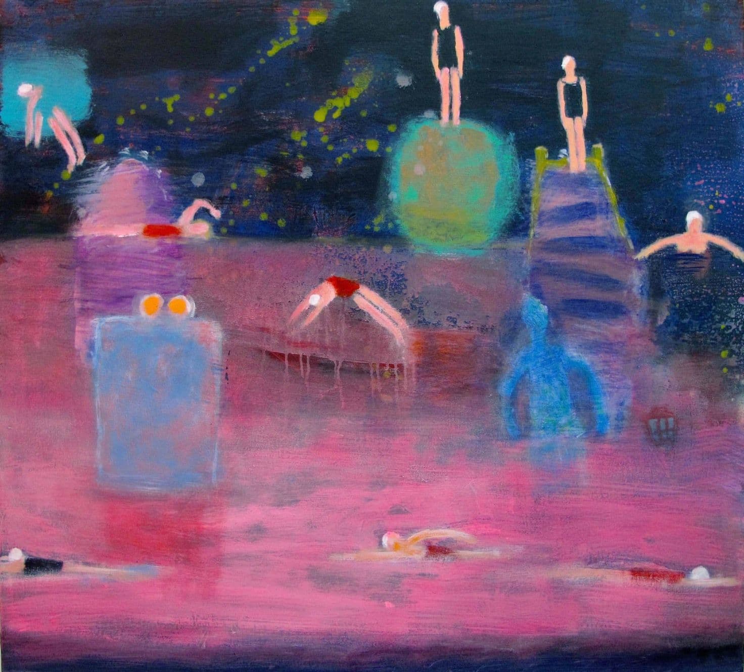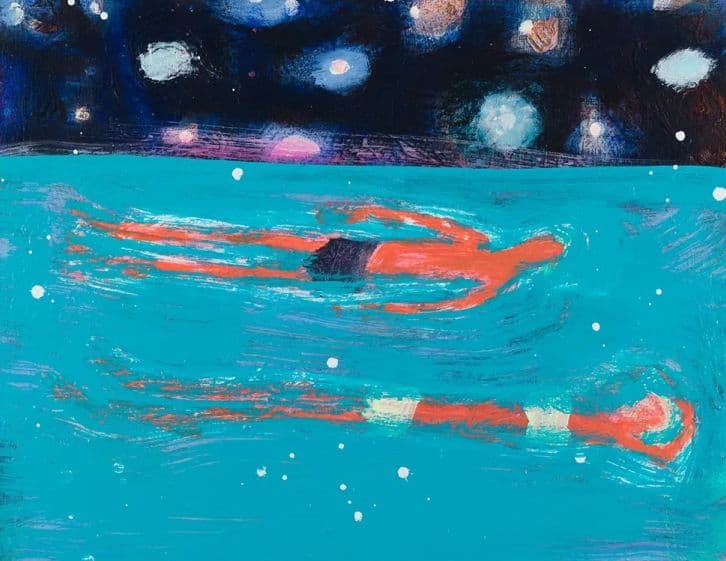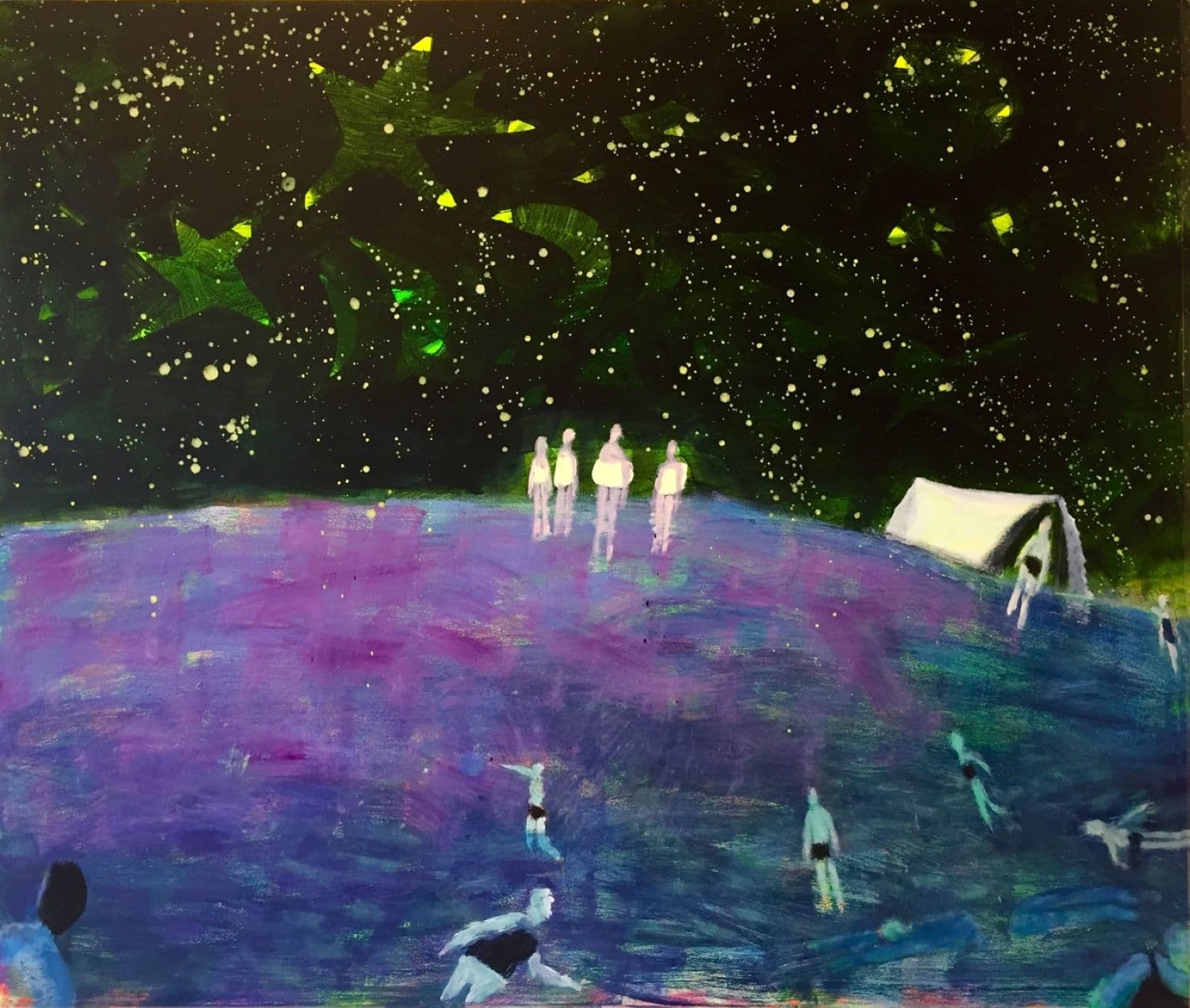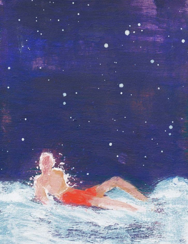 Many of Bradford’s works revolve around themes of people, the ocean, and the starry sky. Beneath the seemingly light and joyful surface of her paintings, a deeply introspective world gradually unfolds. This blend of humor and rebellion has been a hallmark of her life choices, and it resonates with us as we seek to tell similar stories through the medium of fashion.