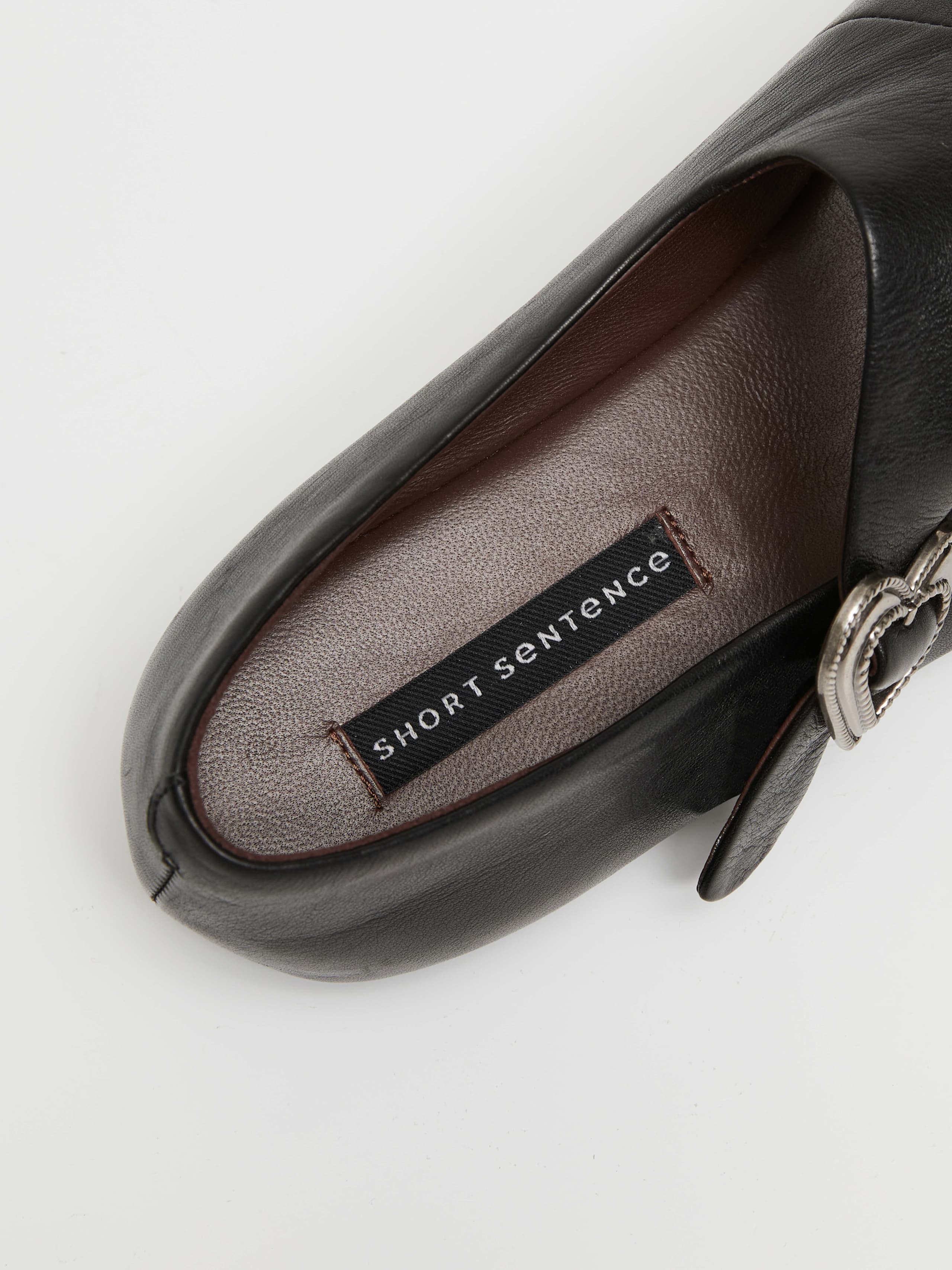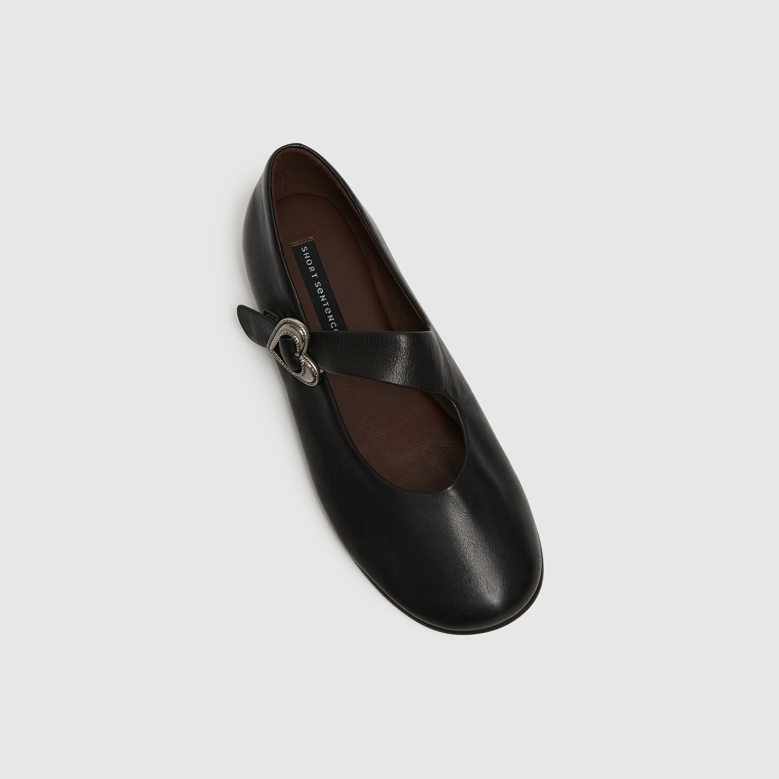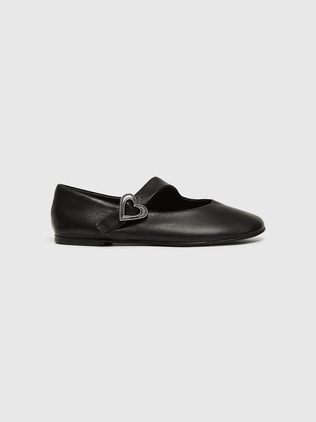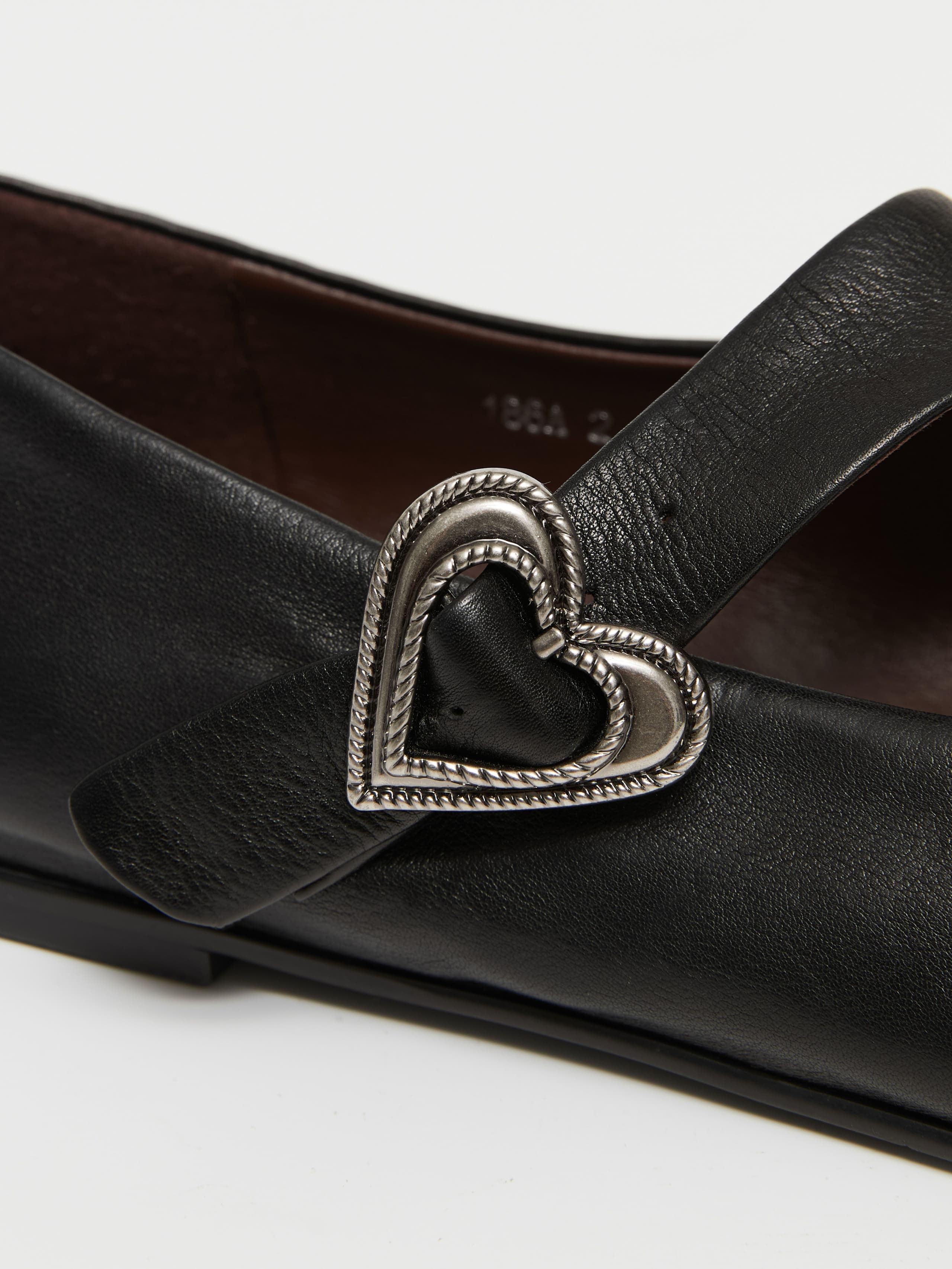 Ballet flats made from calf leather, featuring heart‑shaped buckle and U‑shaped throat design.