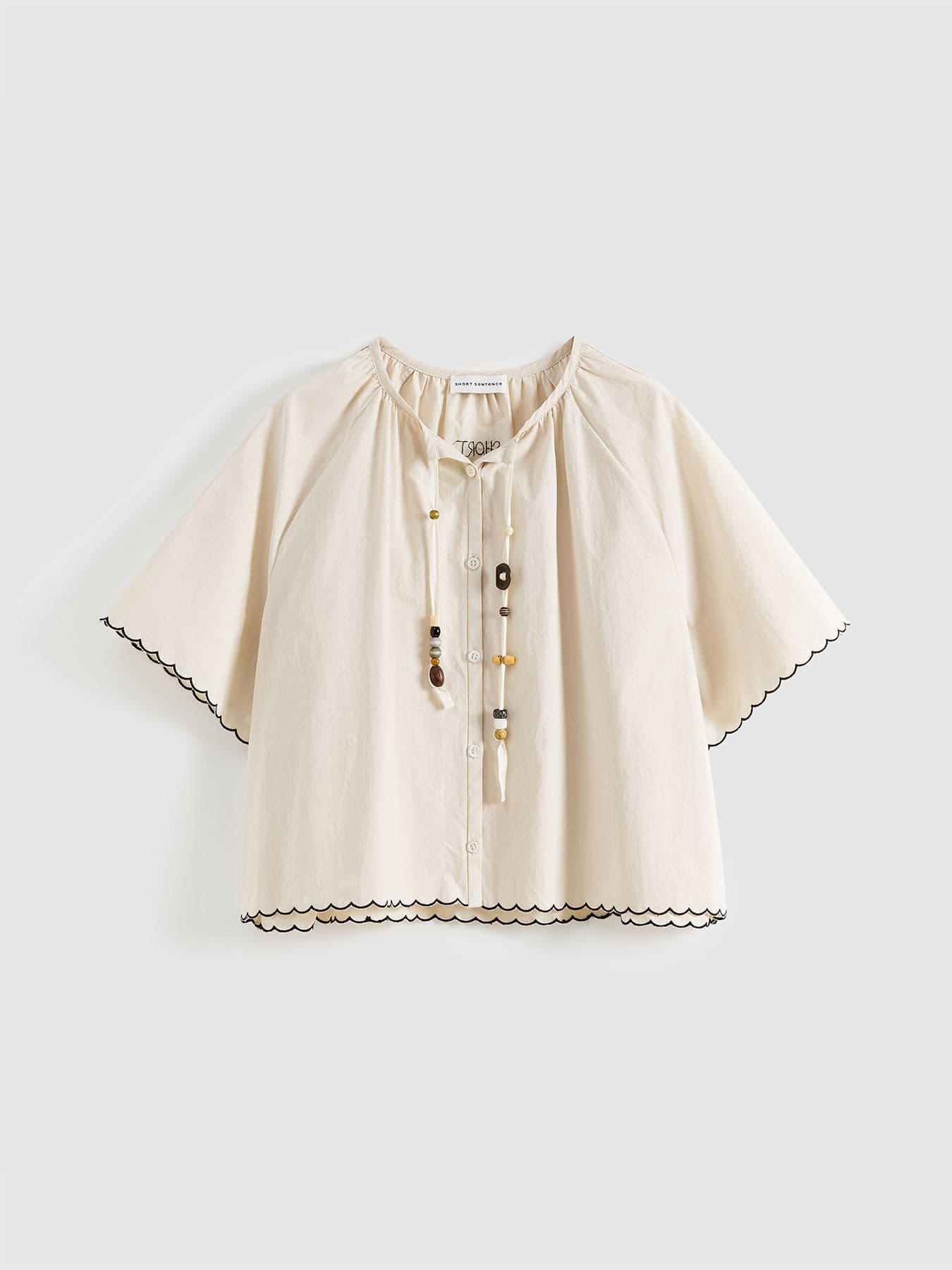 Irreecha Summer Capsule 2025 - Celebrate Everything. A versatile summer short crafted from softly crinkled cotton with a comfortable, lightweight feel. This everyday essential features side pockets, a faux fly with shell button detail, and a relaxed fit. Beaded drawstrings at the waistband add a playful twist to the understated silhouette.