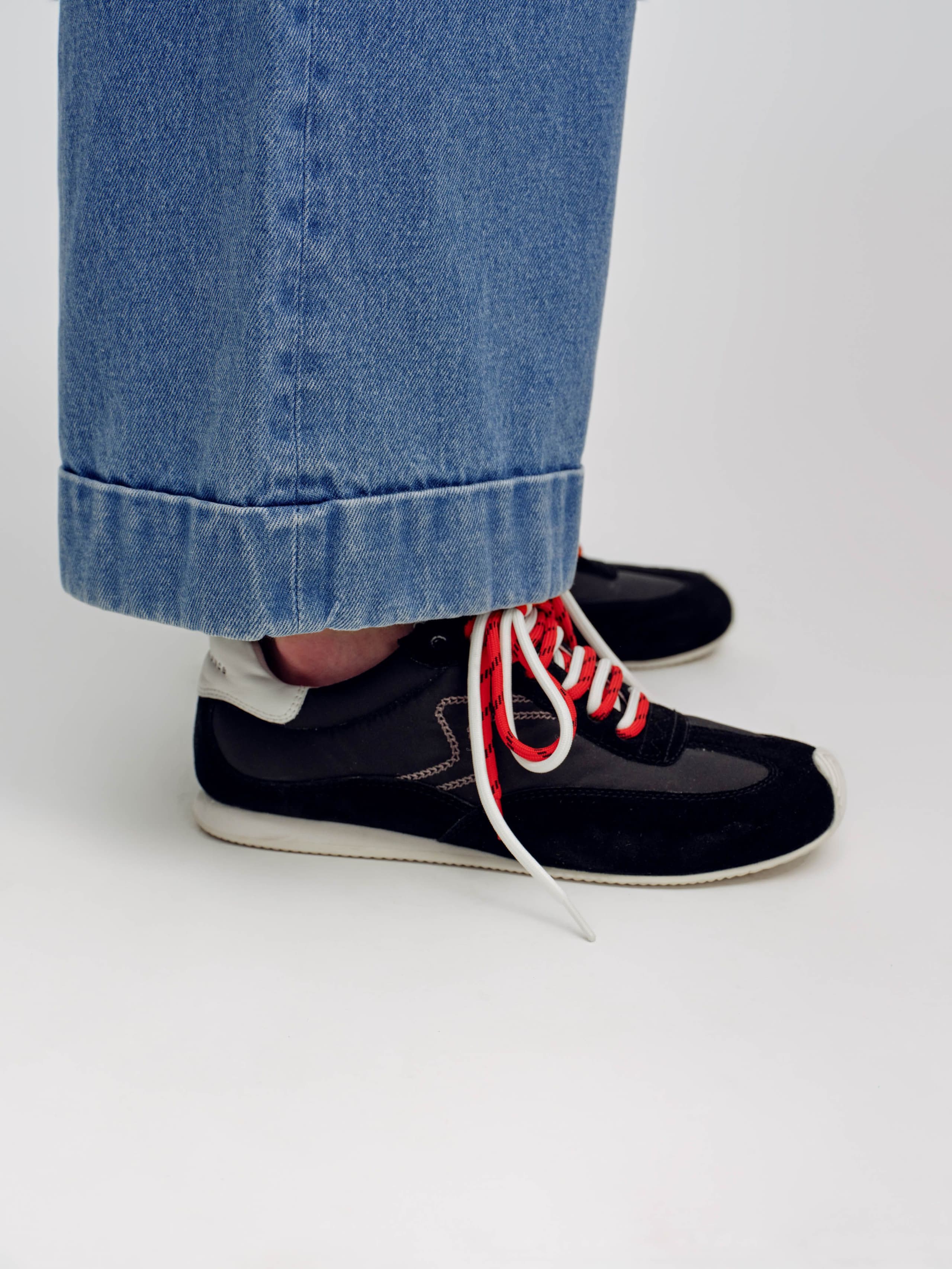 A sleek, narrow-profile trainer with a modern take on the classic German style. The upper combines smooth cow leather with durable nylon for a refined yet sporty feel. Finished with an embroidered “S” on the side and a sturdy composite sole for grip and stability.