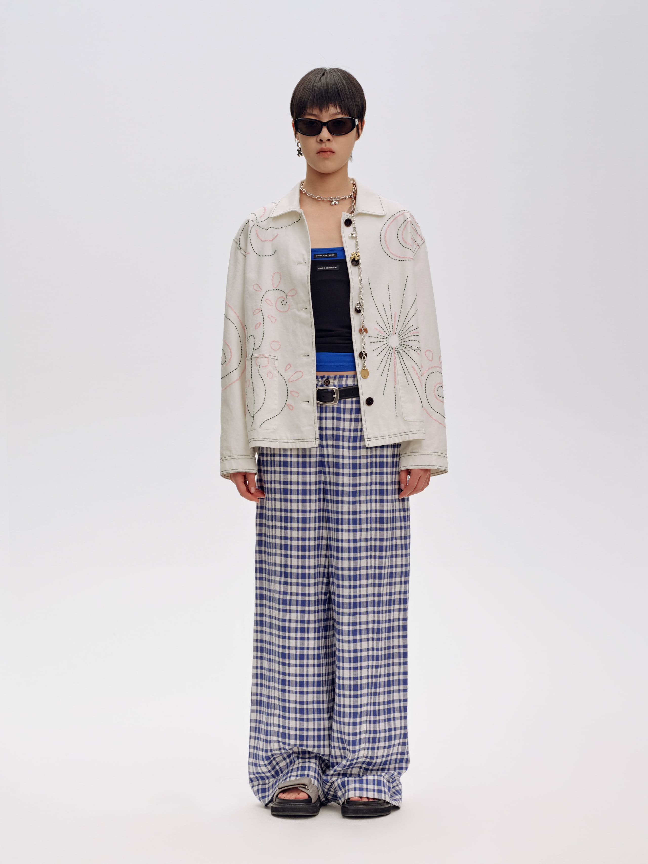 The Blue & White Checkered Vest blends viscose and linen for a structured yet breathable feel. Designed with a slightly tailored, waist-accentuating fit, it features a classic check pattern, adjustable back button detailing, and raw-edge horn buttons for a refined yet effortless look. The woven fabric offers a crisp texture with natural airflow, making it an easy layering piece for both casual and polished outfits.