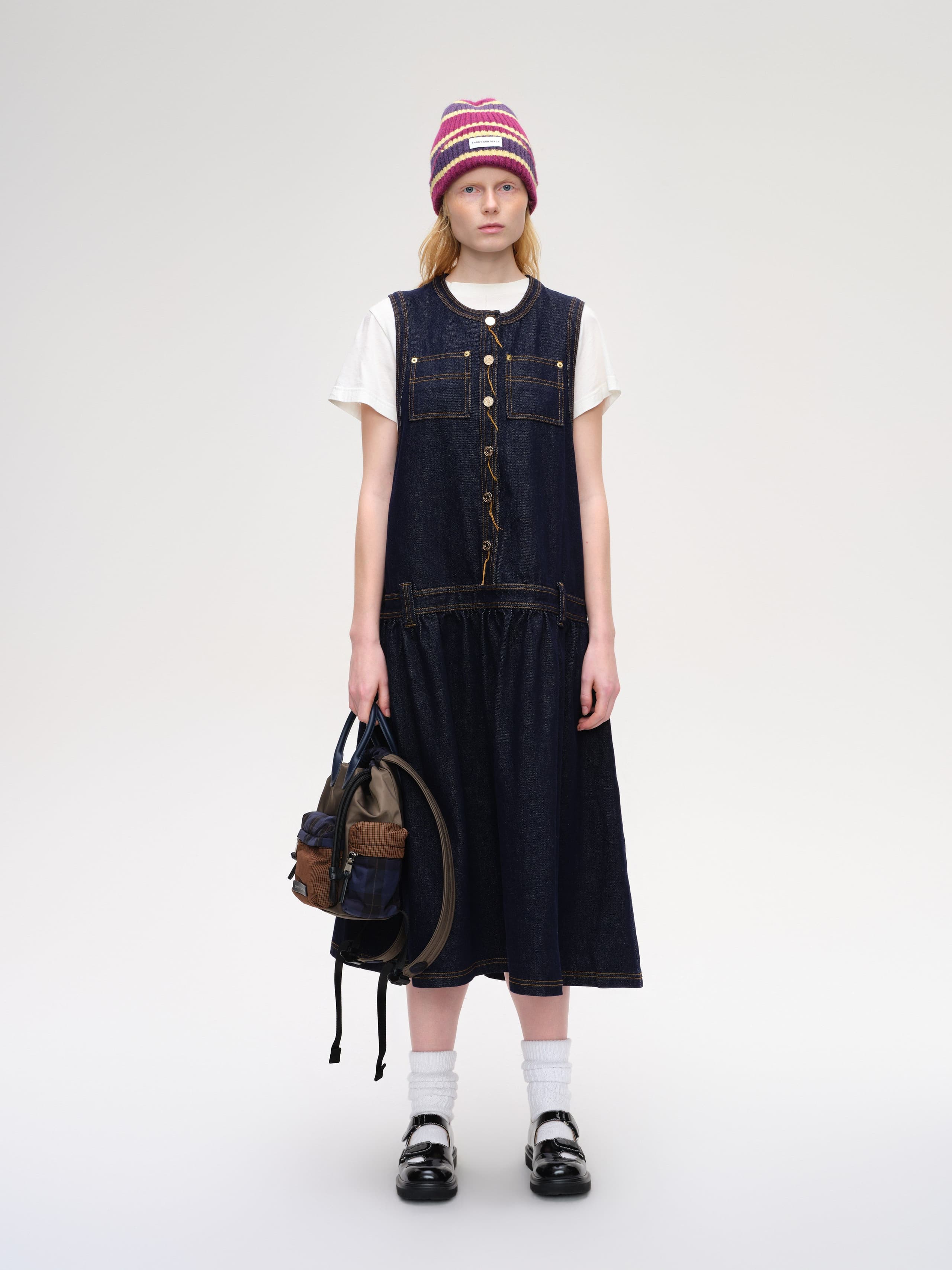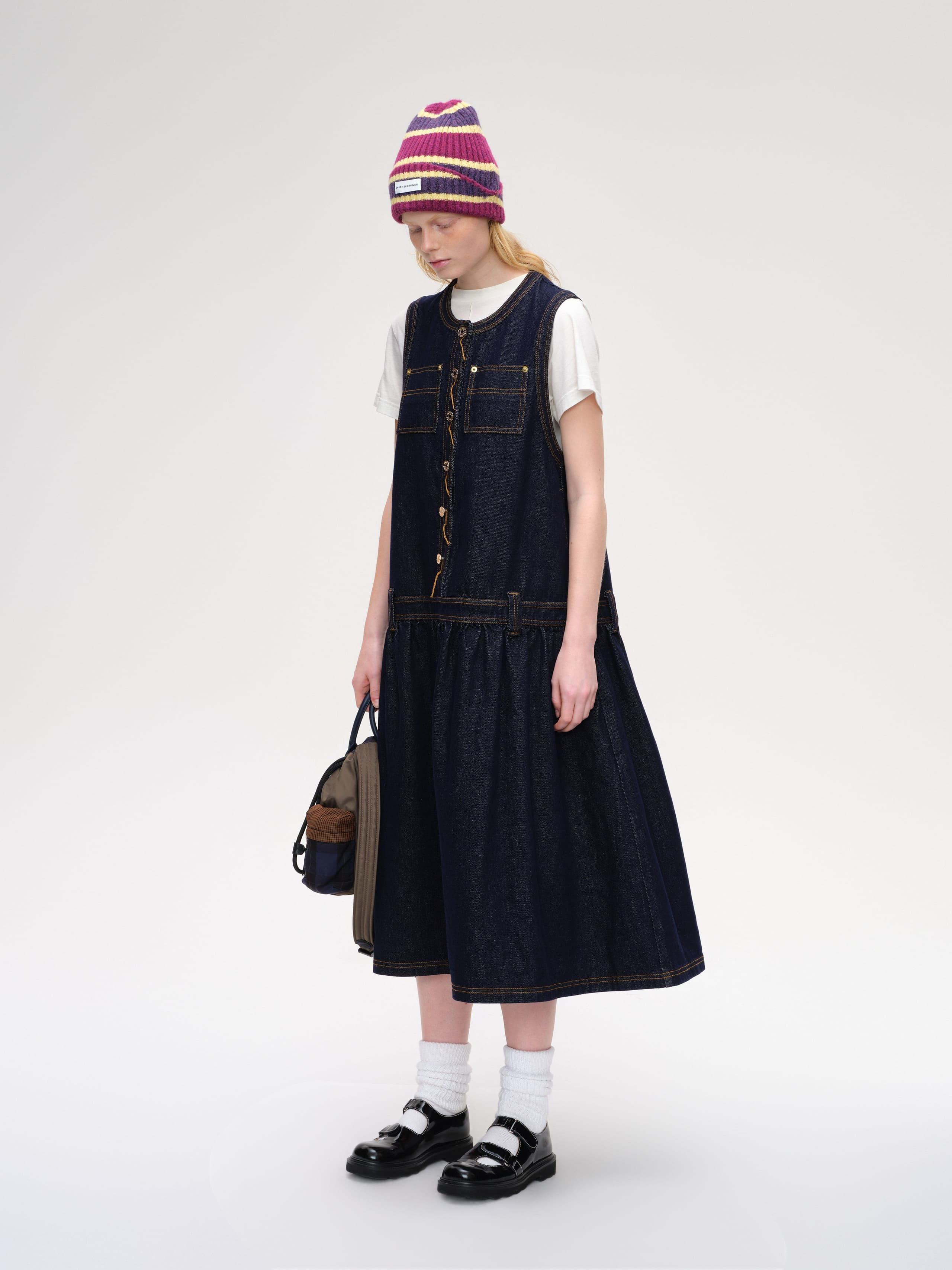A boxy short denim jacket crafted from classic raw denim that resists fading through special treatment. Designed with custom golden logo buttons and rivets that highlight the brand’s attention to detail, complemented by traditional yellow contrast stitching. A plaid lining adds a refined, unexpected touch to the casual structure.