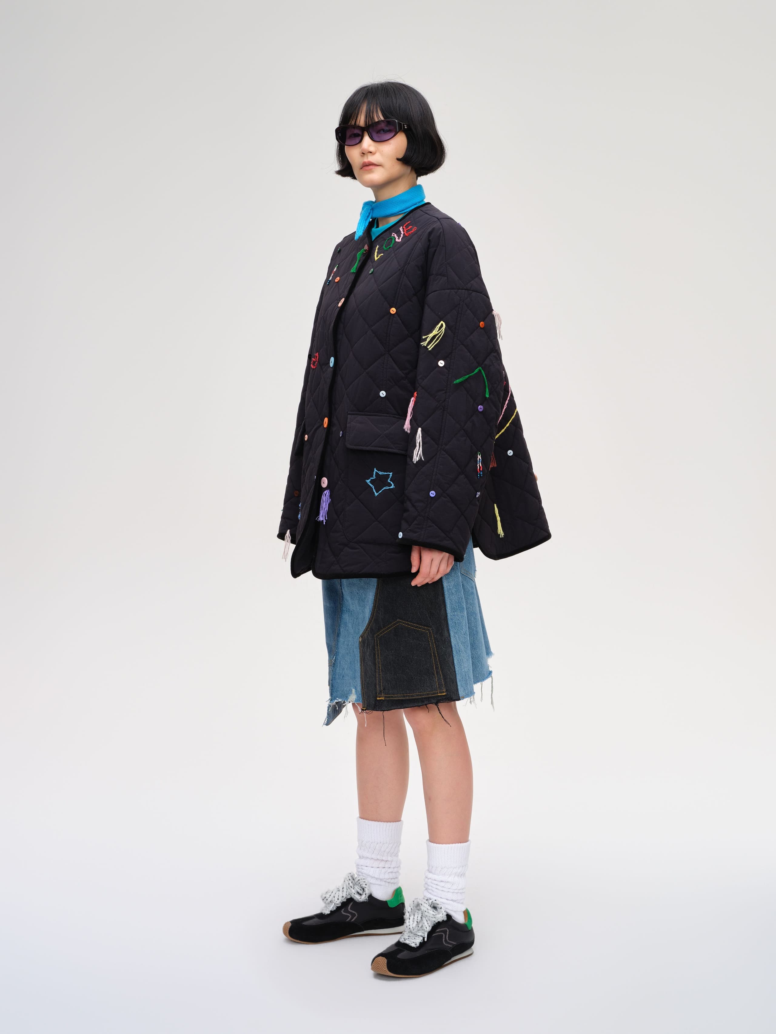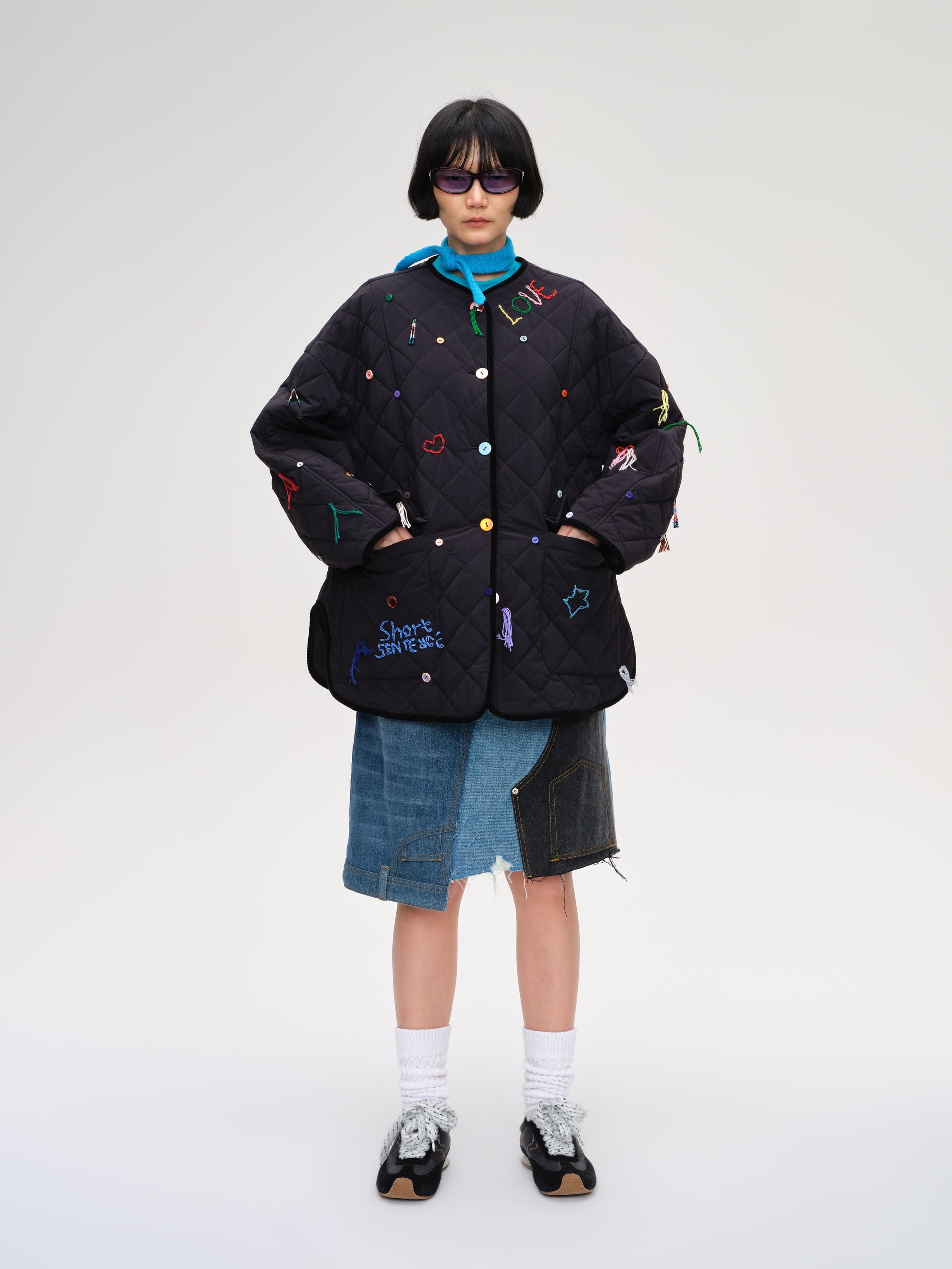 A playful denim vest designed with colorful detail. Crafted from 100% cotton denim with a vintage washed finish and light quilted padding for warmth, it’s both practical and expressive. The relaxed silhouette is embellished with multicolor buttons, logo stitching, and beaded details for a vibrant, handcrafted touch. Finished with functional front pockets and bright shell button closure.