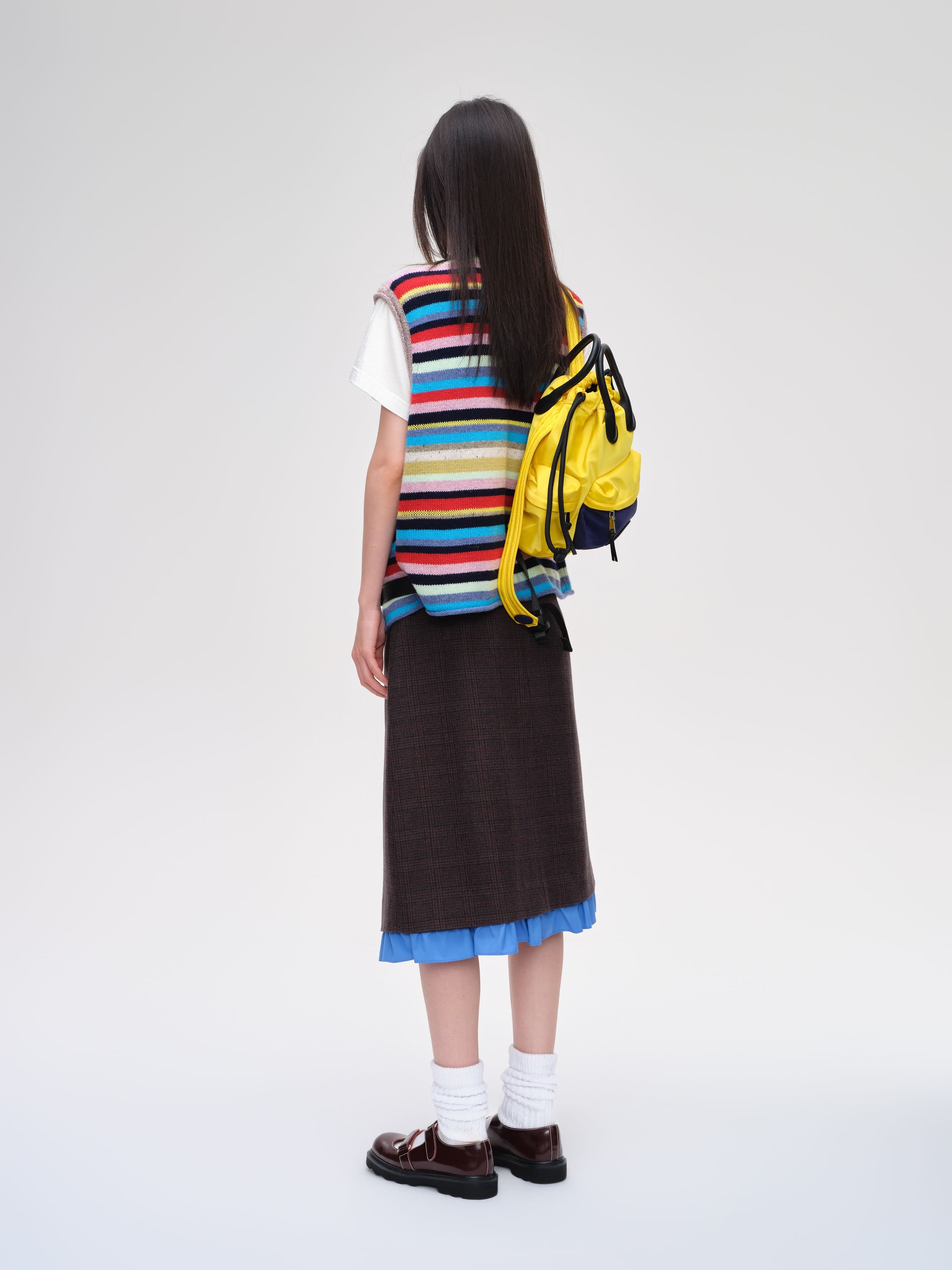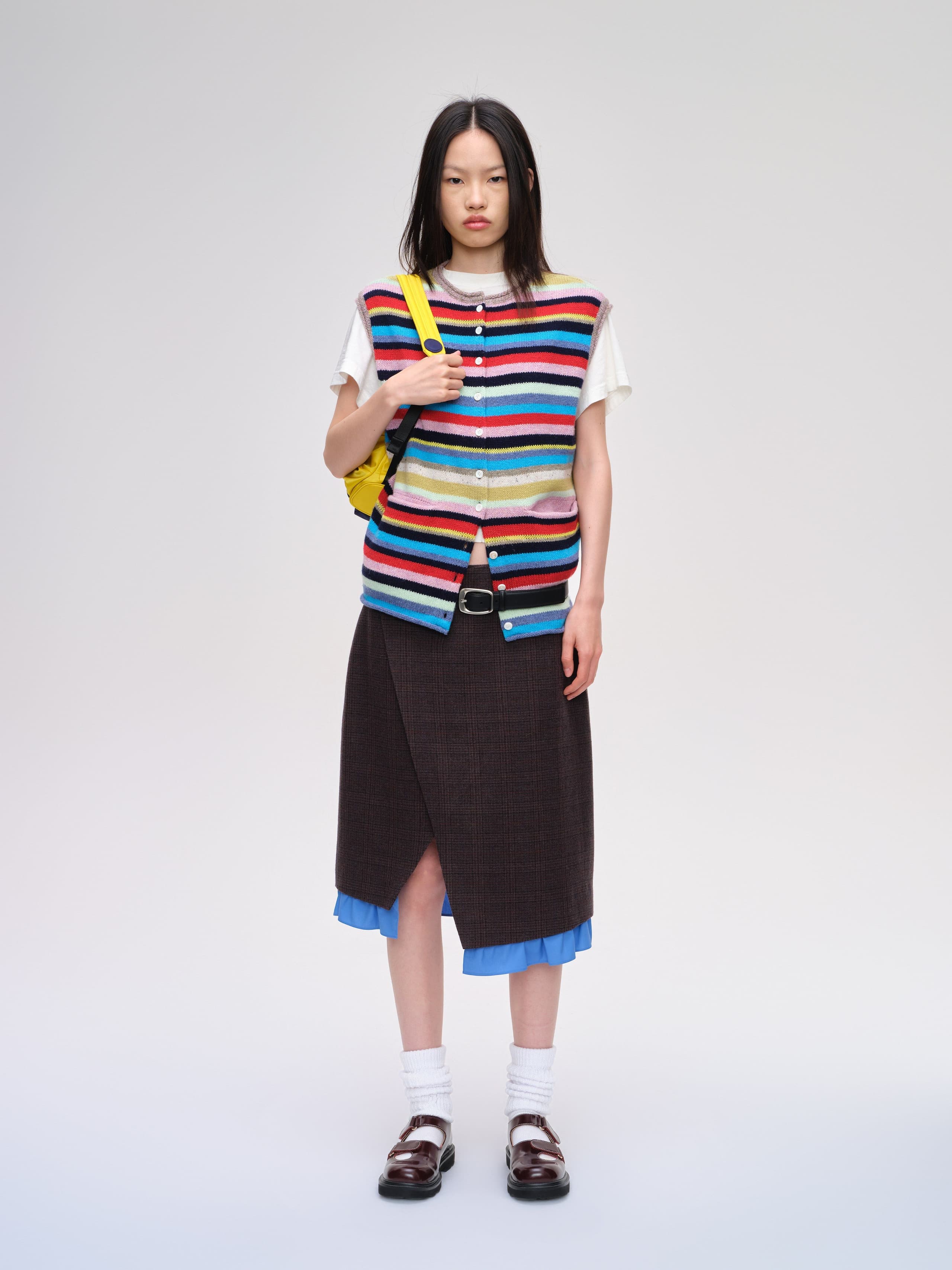 A playful cardigan crafted with a mix of fine wool and cotton yarns. Designed with a multi-button placket, seamless mock neck, and natural rolled edges at the cuffs and hem. The striped pattern combines bright and muted tones, giving the piece a lively yet sophisticated character.