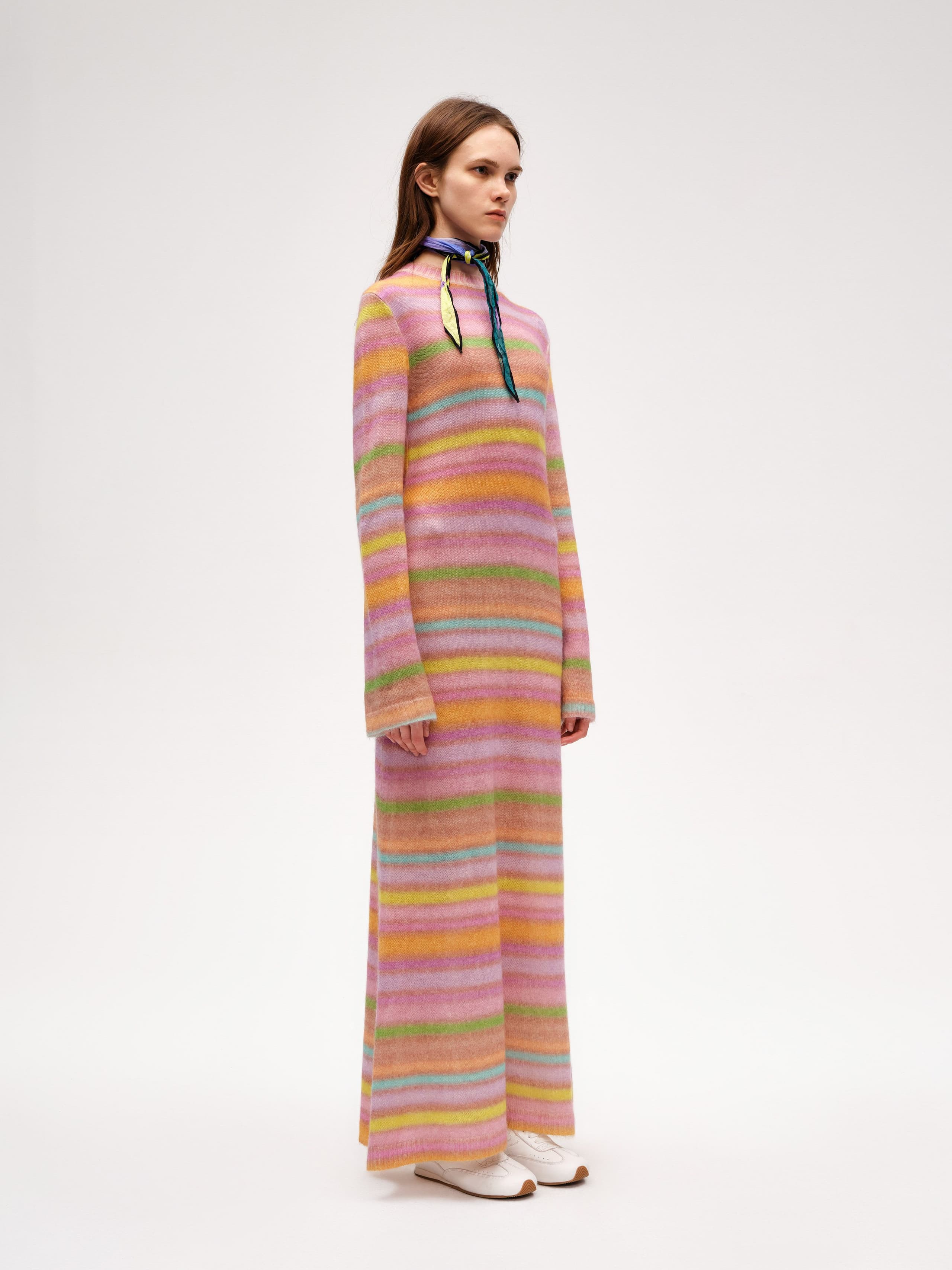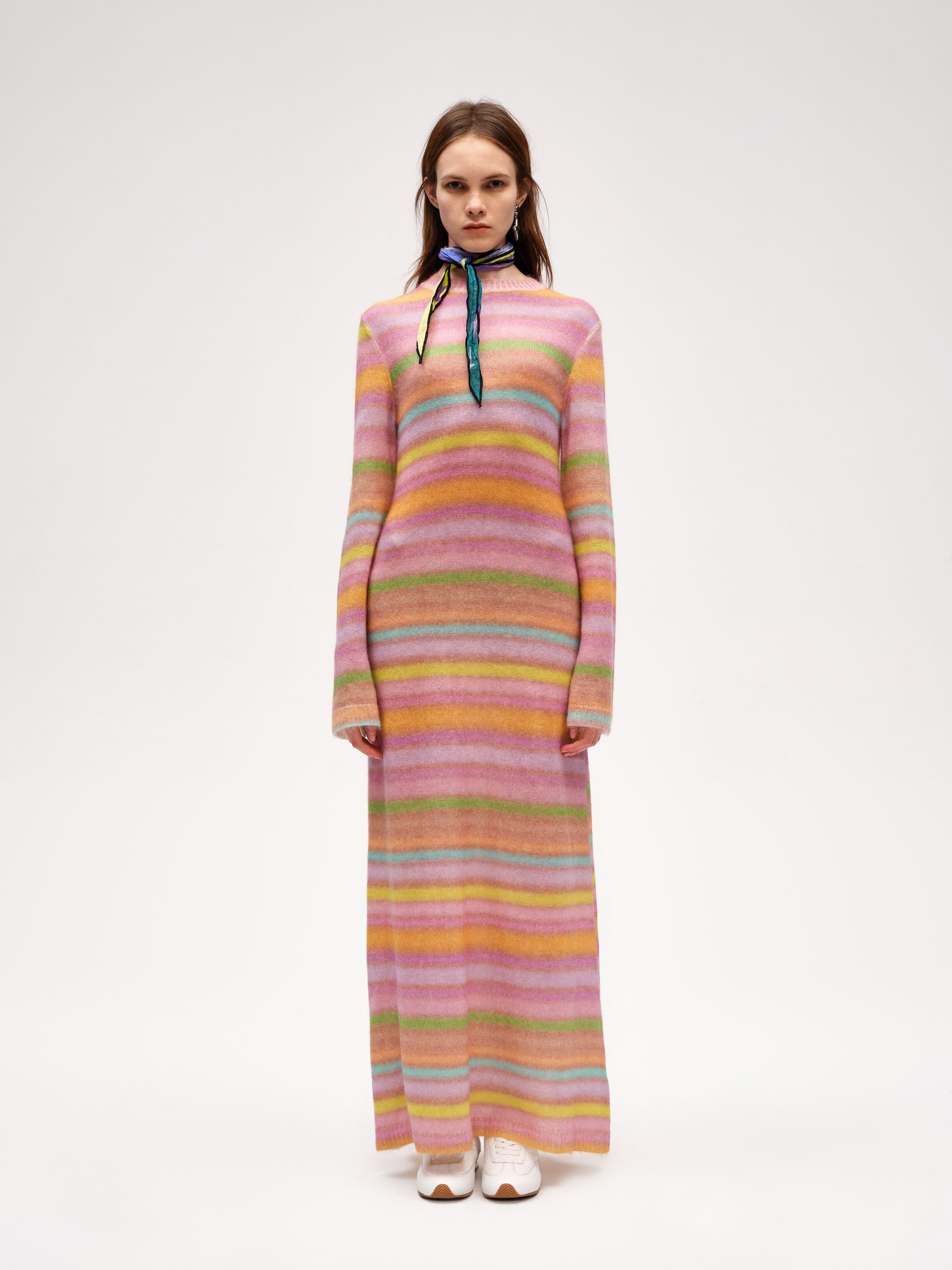The Colorful Striped Knit Dress is crafted from a premium blend of mohair and wool, offering a soft, lightweight feel. This long, fitted dress features a cinched waist that enhances the body’s natural curves, creating a sleek, elongated silhouette. The vibrant gradient stripe pattern, combined with multicolor printing techniques, adds dynamic visual interest, making this dress both playful and flattering.