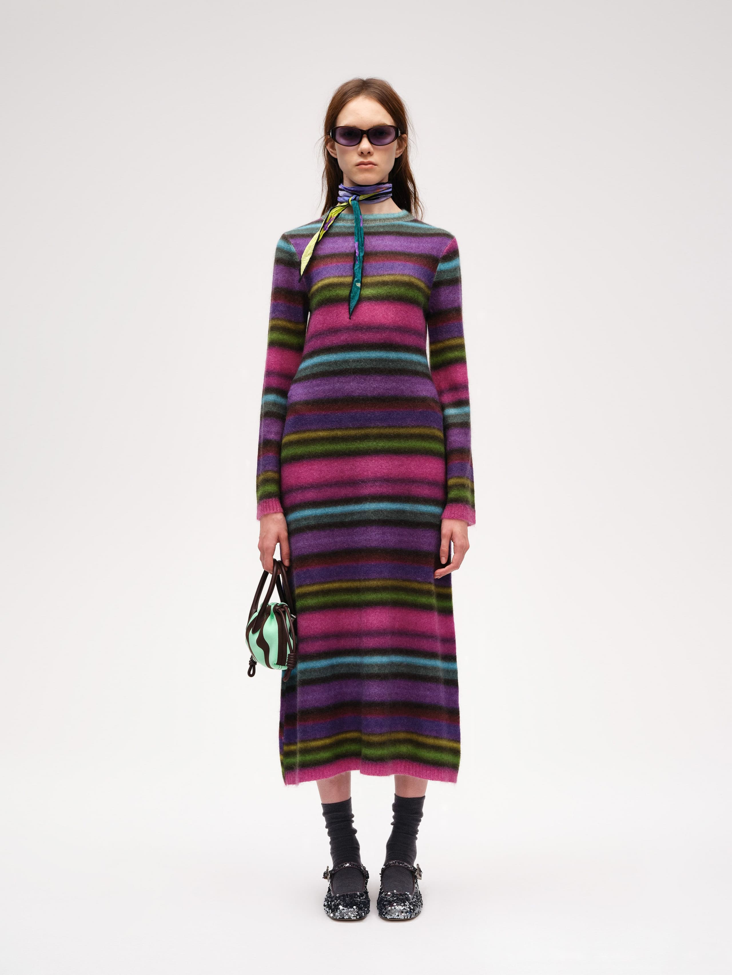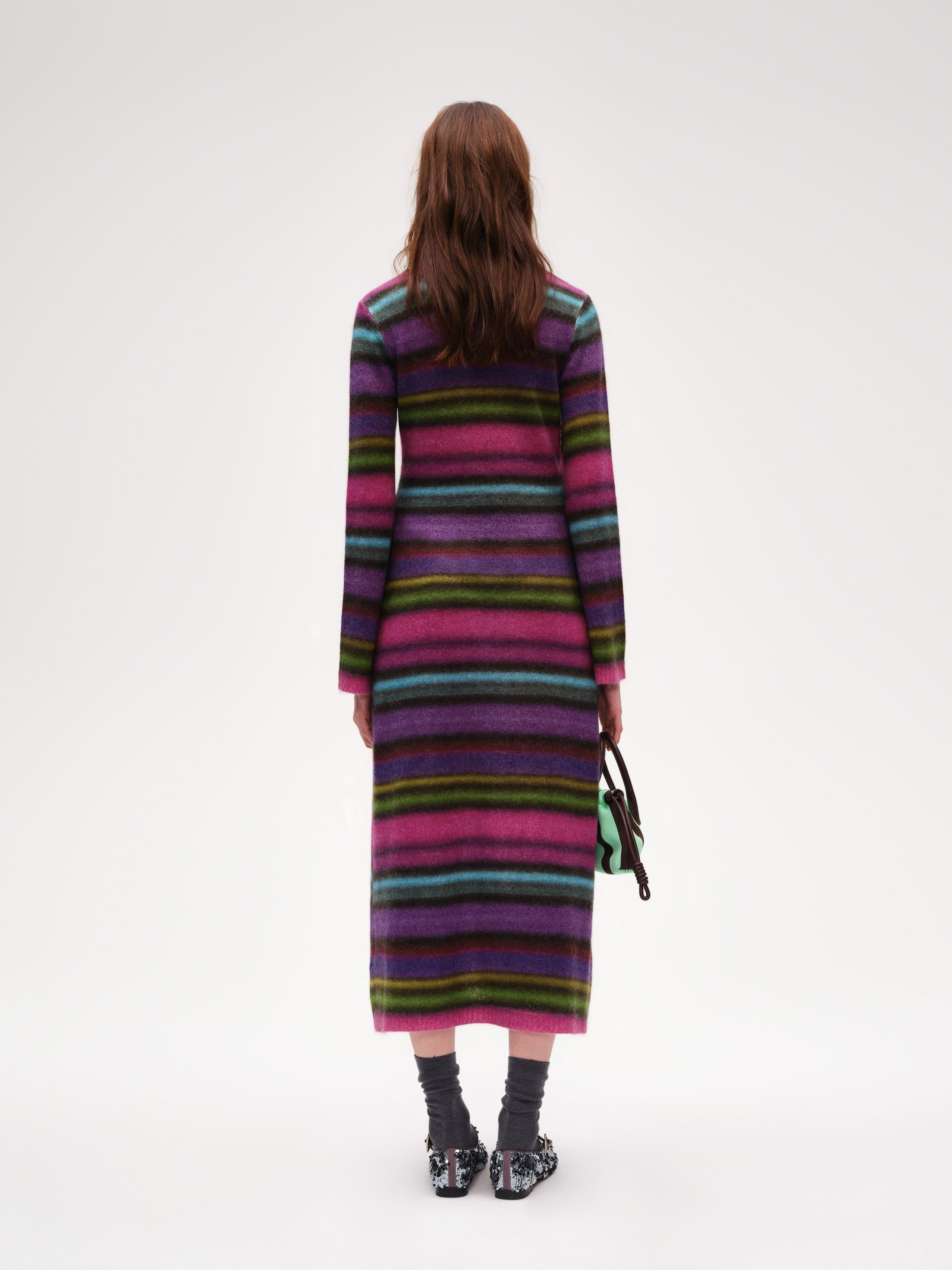 The Colorful Striped Knit Dress is crafted from a premium blend of mohair and wool, offering a soft, lightweight feel. This long, fitted dress features a cinched waist that enhances the body’s natural curves, creating a sleek, elongated silhouette. The vibrant gradient stripe pattern, combined with multicolor printing techniques, adds dynamic visual interest, making this dress both playful and flattering.