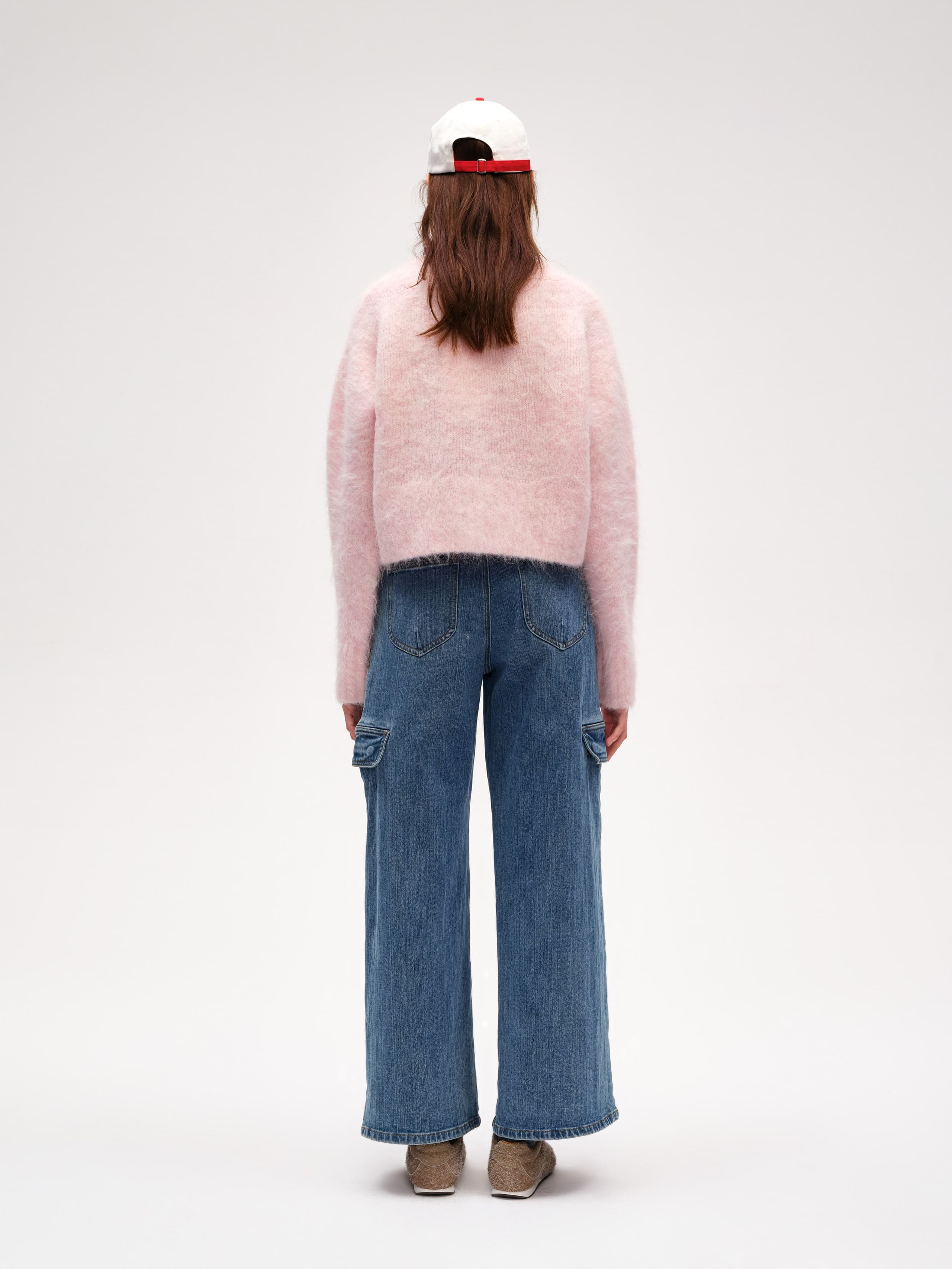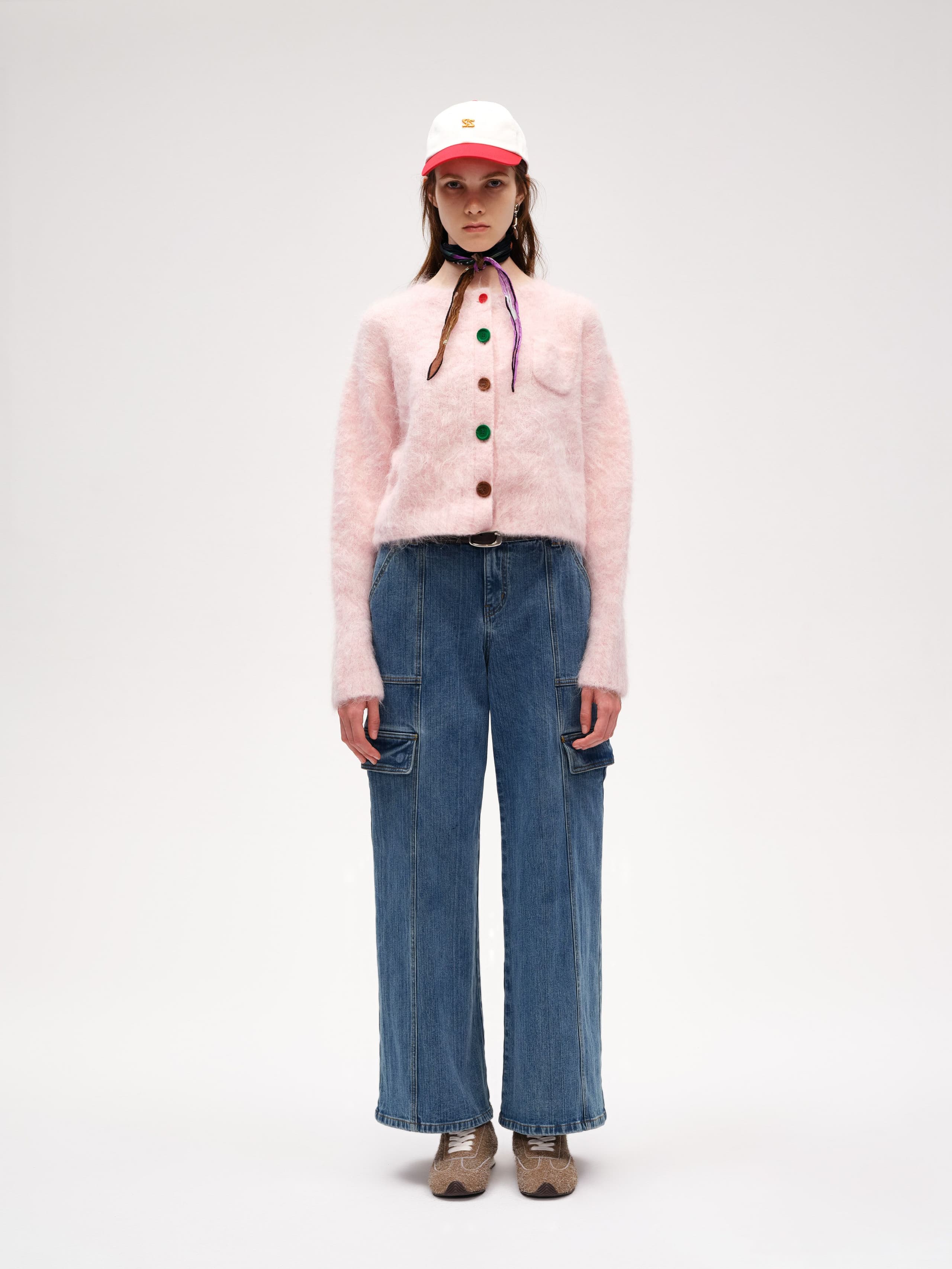 The Colorful Velvet Button Cardigan is crafted from a luxurious blend of alpaca and other fibers, offering a cloud-like soft texture and a delicate, warm feel against the skin. This cropped, fitted cardigan features a playful front pocket design and vibrant velvet buttons in various sizes, adding a whimsical touch. The buttons reflect different hues under varying light, creating a beautiful contrast with the main body of the cardigan.