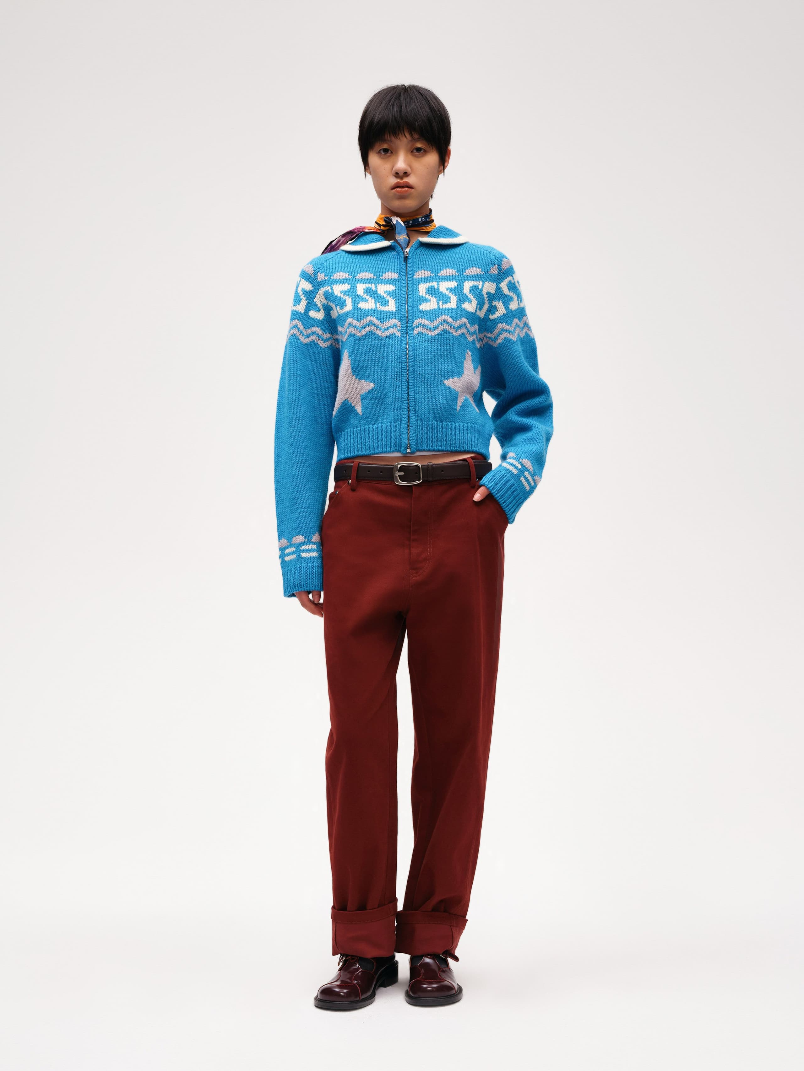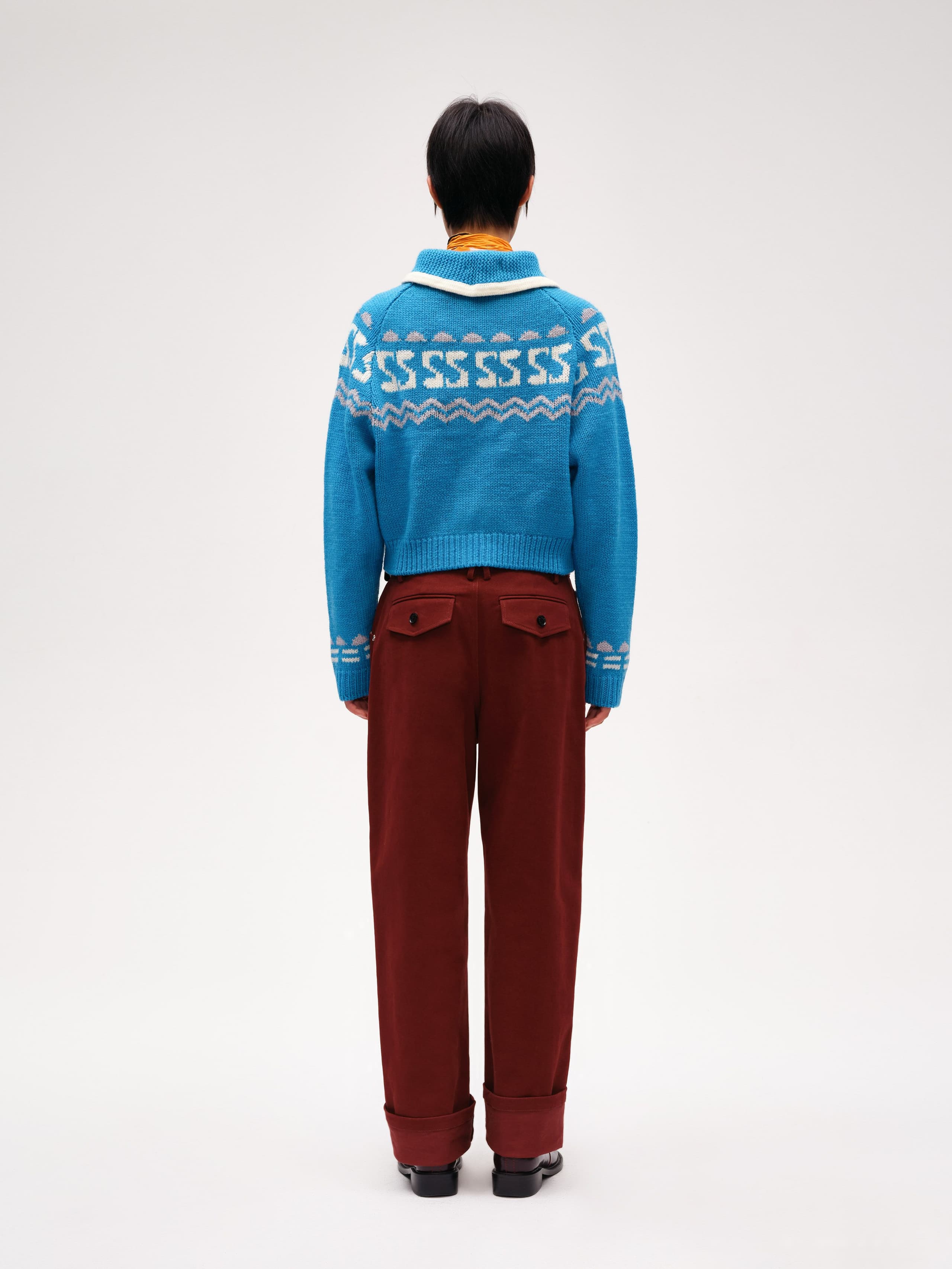 The Crew-neck Intarsia Wool Sweater is made from chunky wool yarn, offering a soft and cozy feel while retaining the natural elasticity of wool. This fitted crew-neck design features a unique slanted zipper on the left raglan sleeve, allowing you to adjust the opening for a playful, casual look. The intarsia knit includes a seasonal logo pattern, adding a touch of joy and lightness to the sweater.