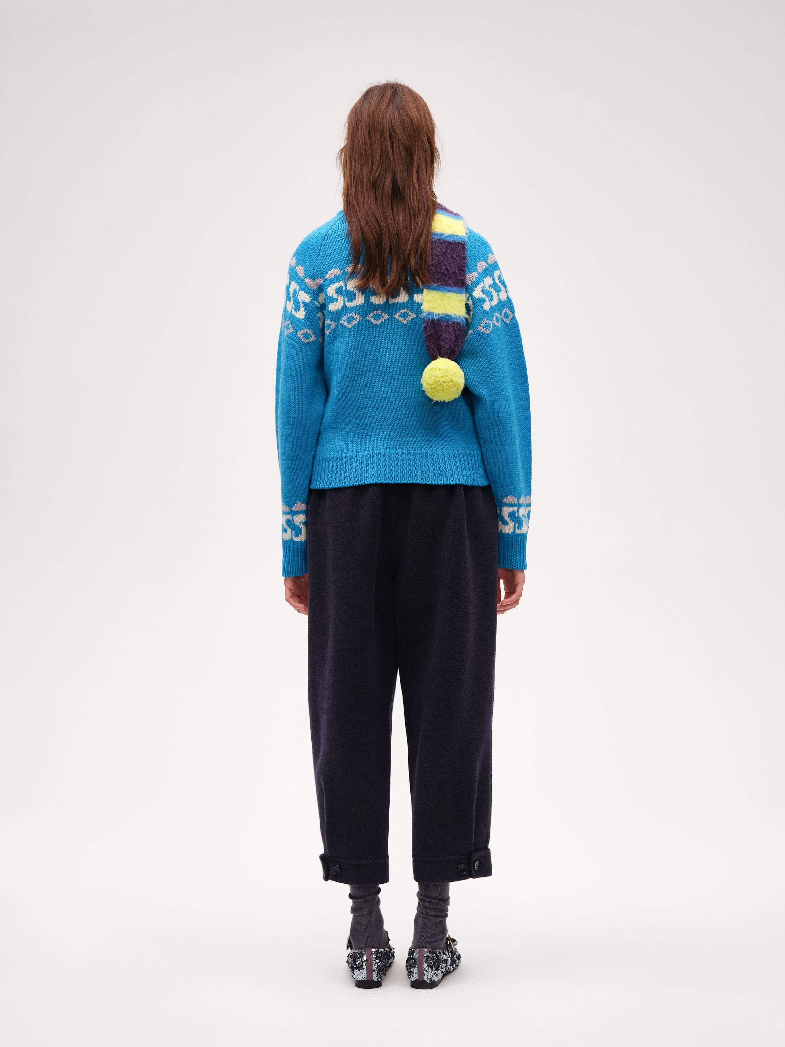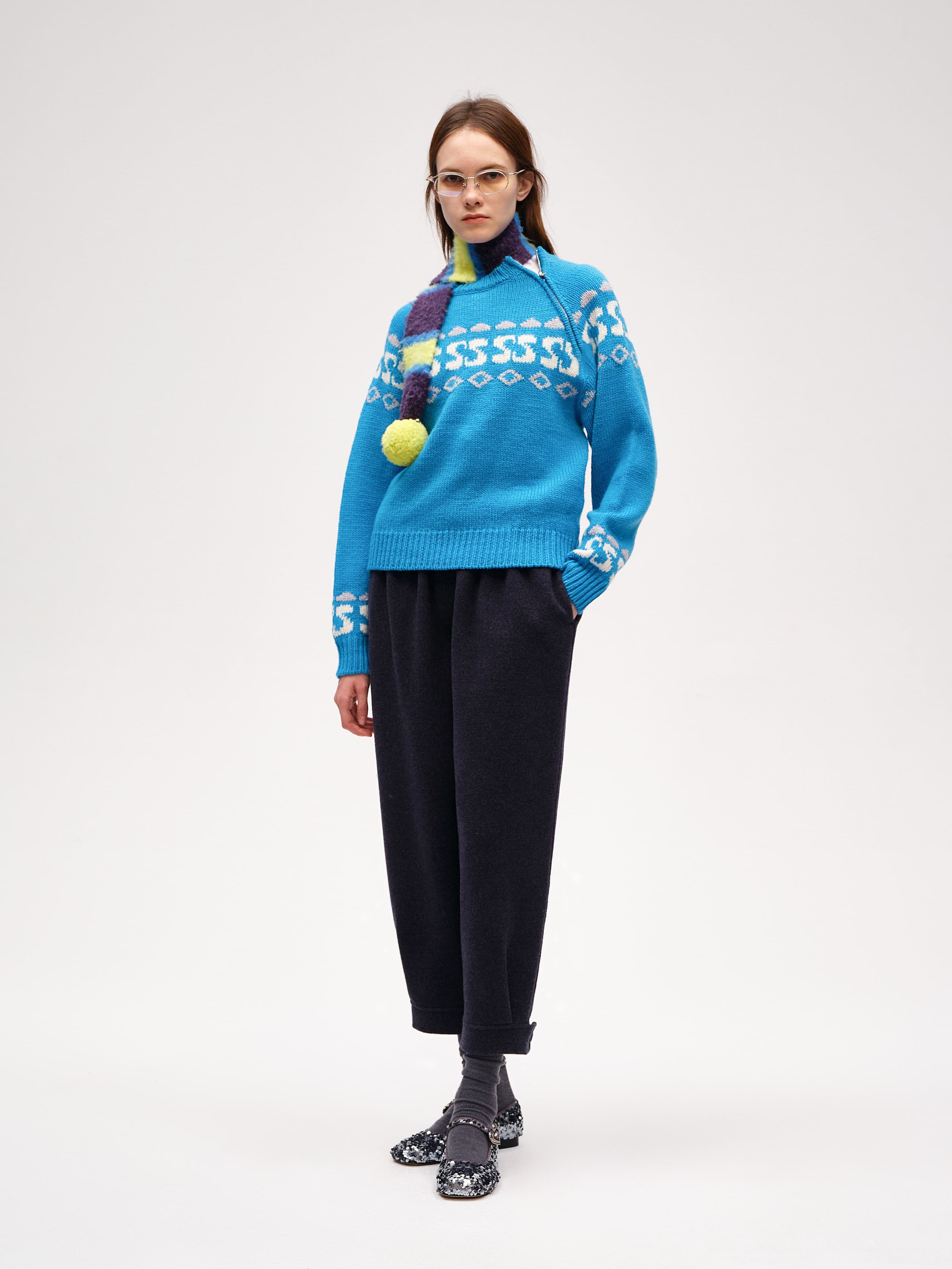The Crew-neck Intarsia Wool Sweater is made from chunky wool yarn, offering a soft and cozy feel while retaining the natural elasticity of wool. This fitted crew-neck design features a unique slanted zipper on the left raglan sleeve, allowing you to adjust the opening for a playful, casual look. The intarsia knit includes a seasonal logo pattern, adding a touch of joy and lightness to the sweater.