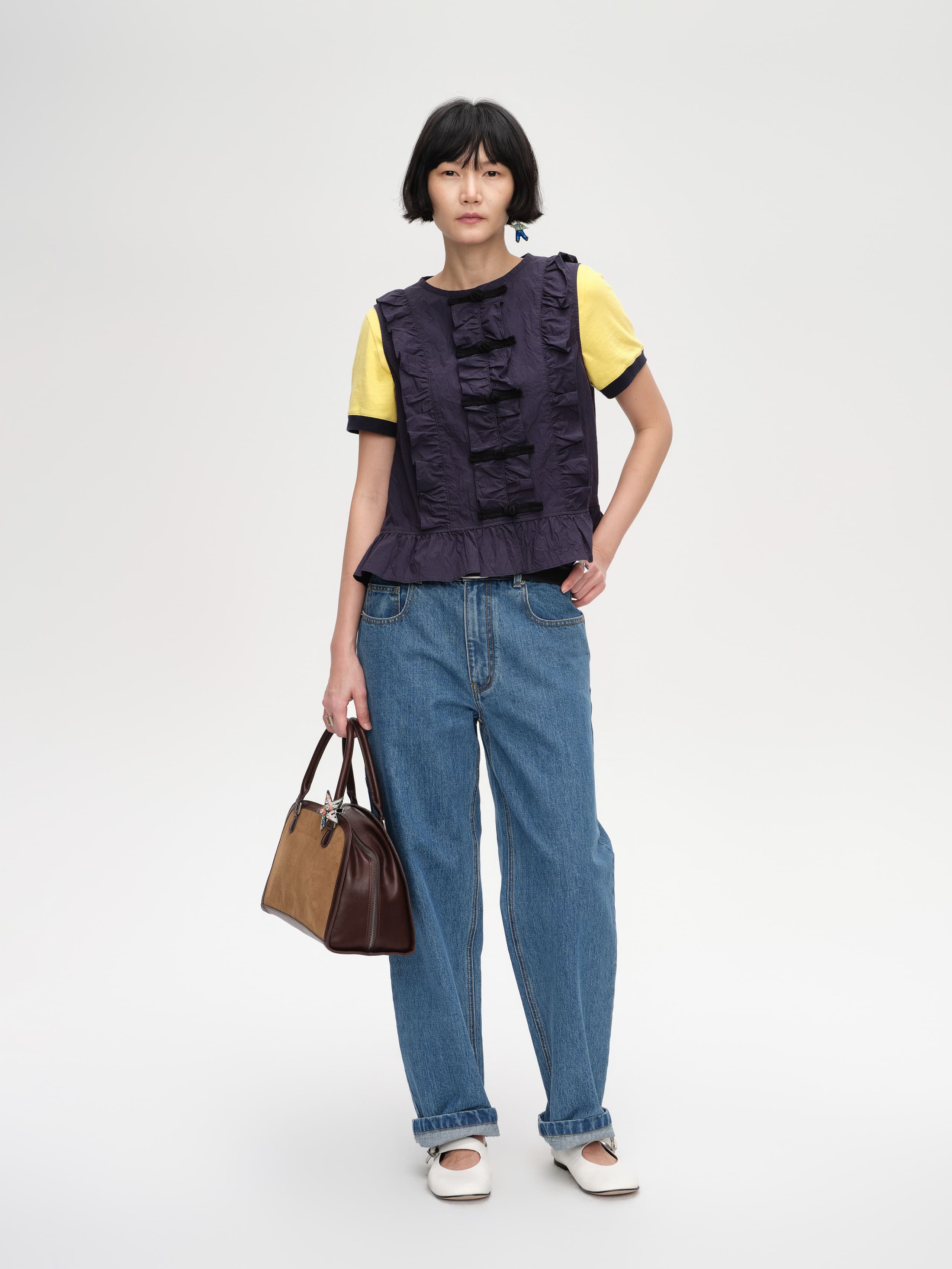 Trousers made from mid‑weight 12oz denim, featuring curved hem design, vintage wash finish, and straight leg silhouette.