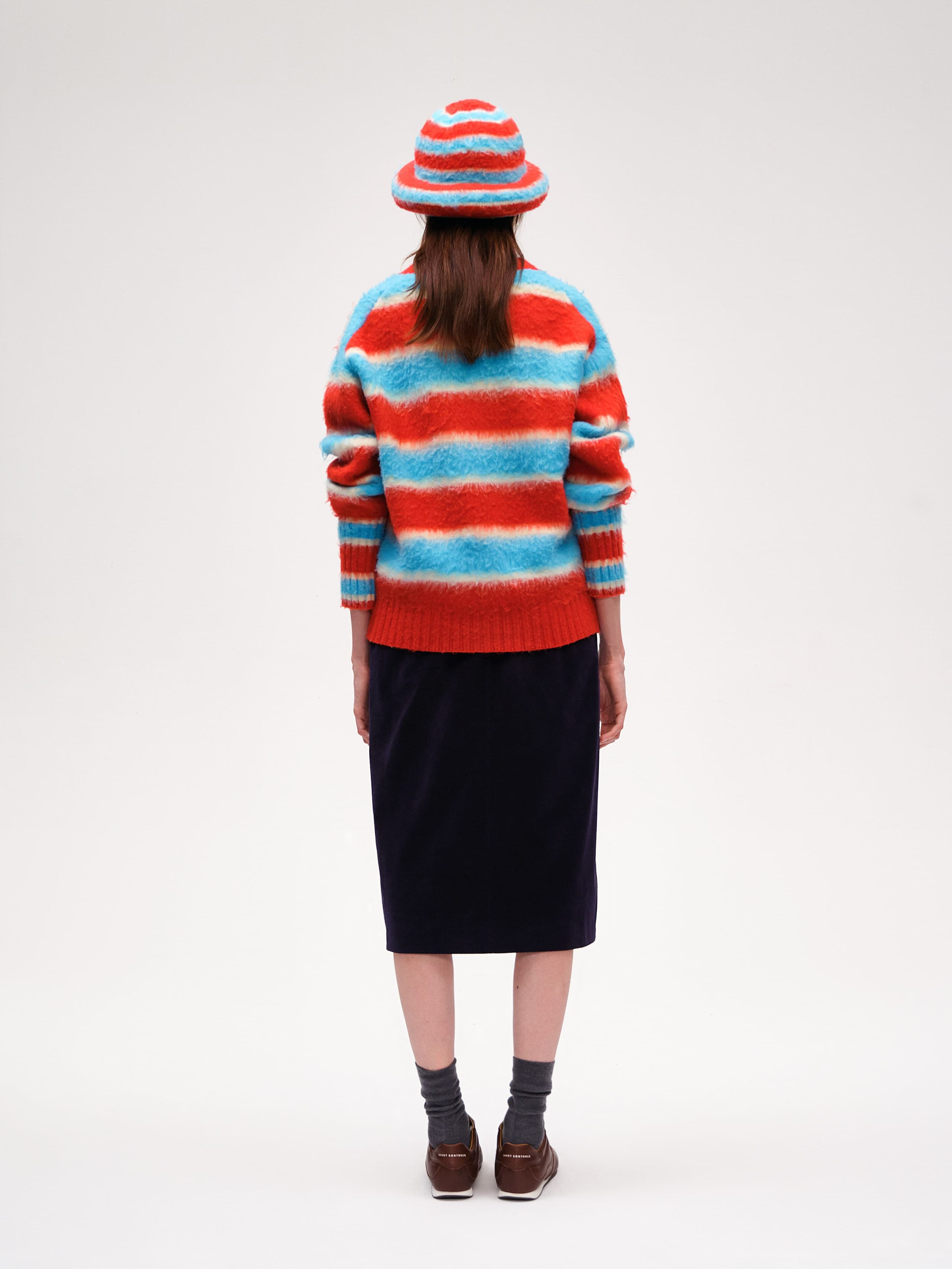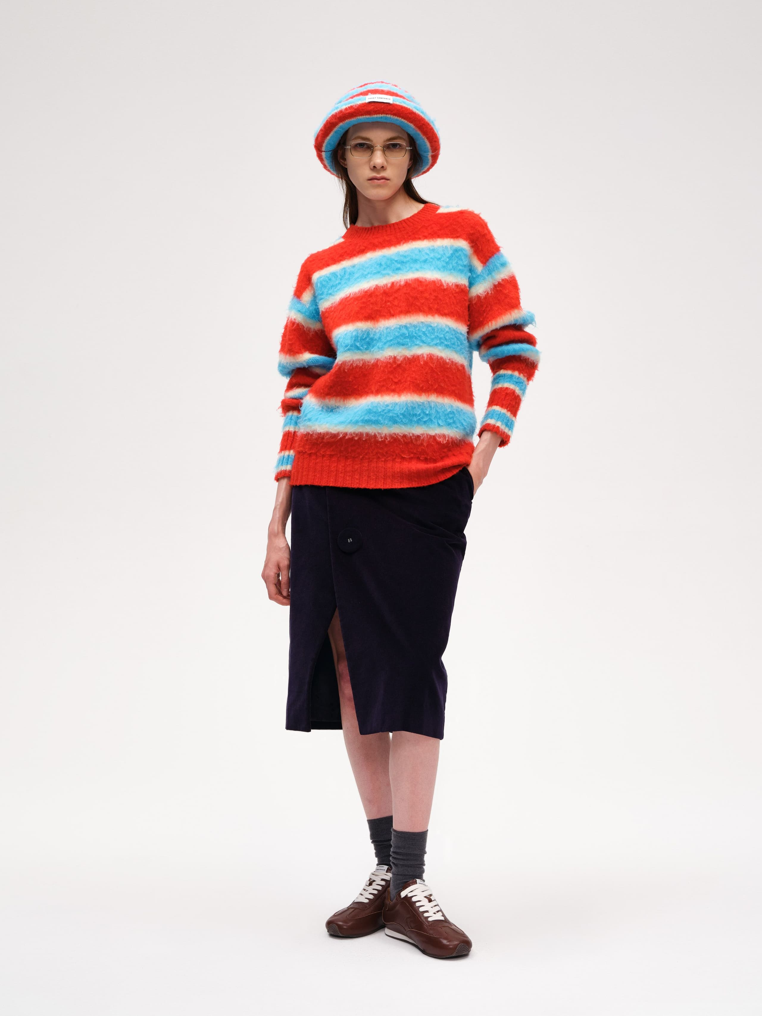 The Daily Stripe Sweater is crafted from soft, brushed yarn with a long-pile texture, offering vibrant colors and a cozy feel. This classic crew-neck sweater features the brand's signature striped design in a playful tri-color pattern, providing visual contrast and depth. The ribbed cuffs add warmth and a structured finish to the relaxed fit, while the bright, fade-resistant colors ensure long-lasting wear. The perfect blend of comfort and style for everyday looks.
