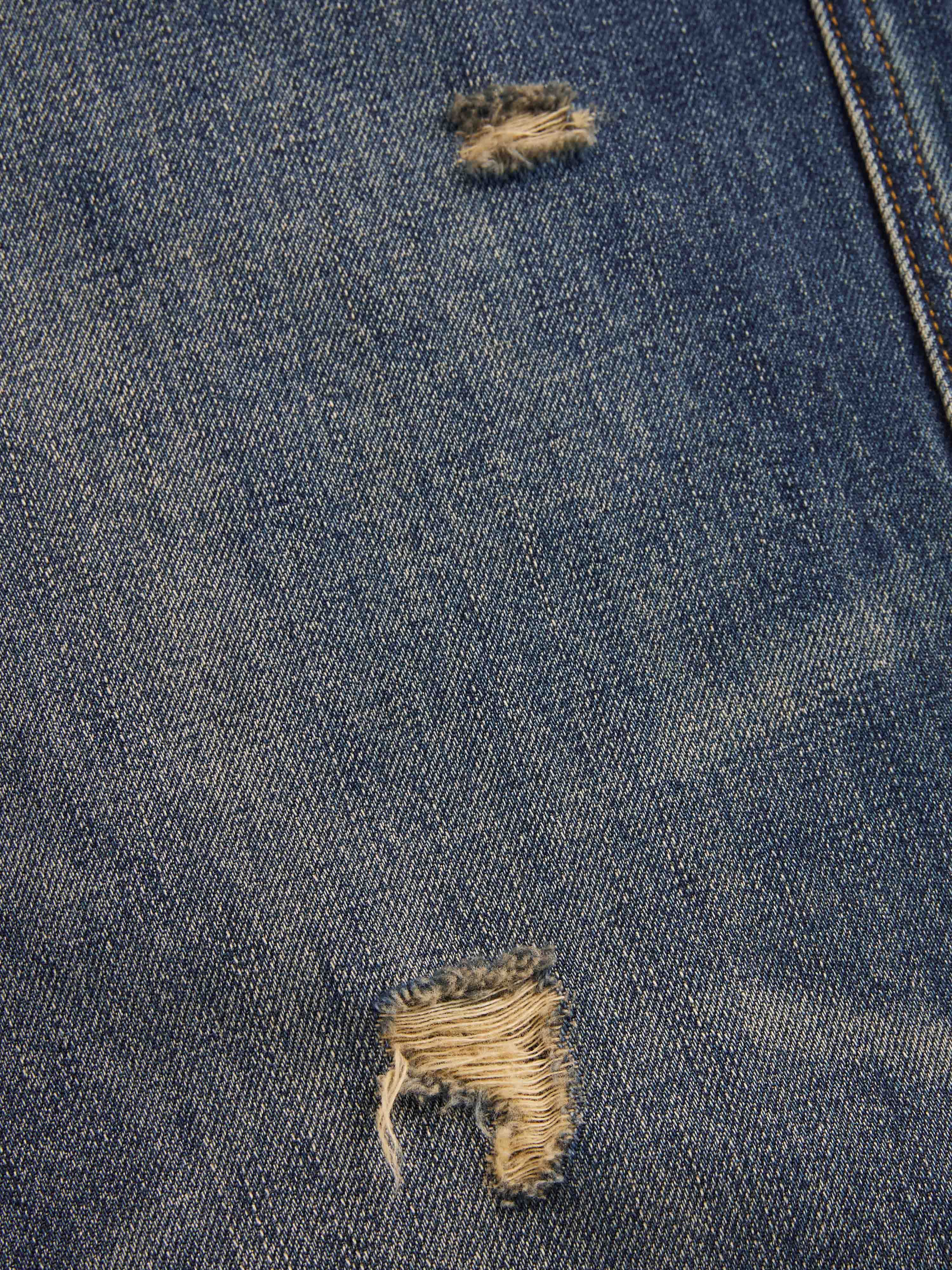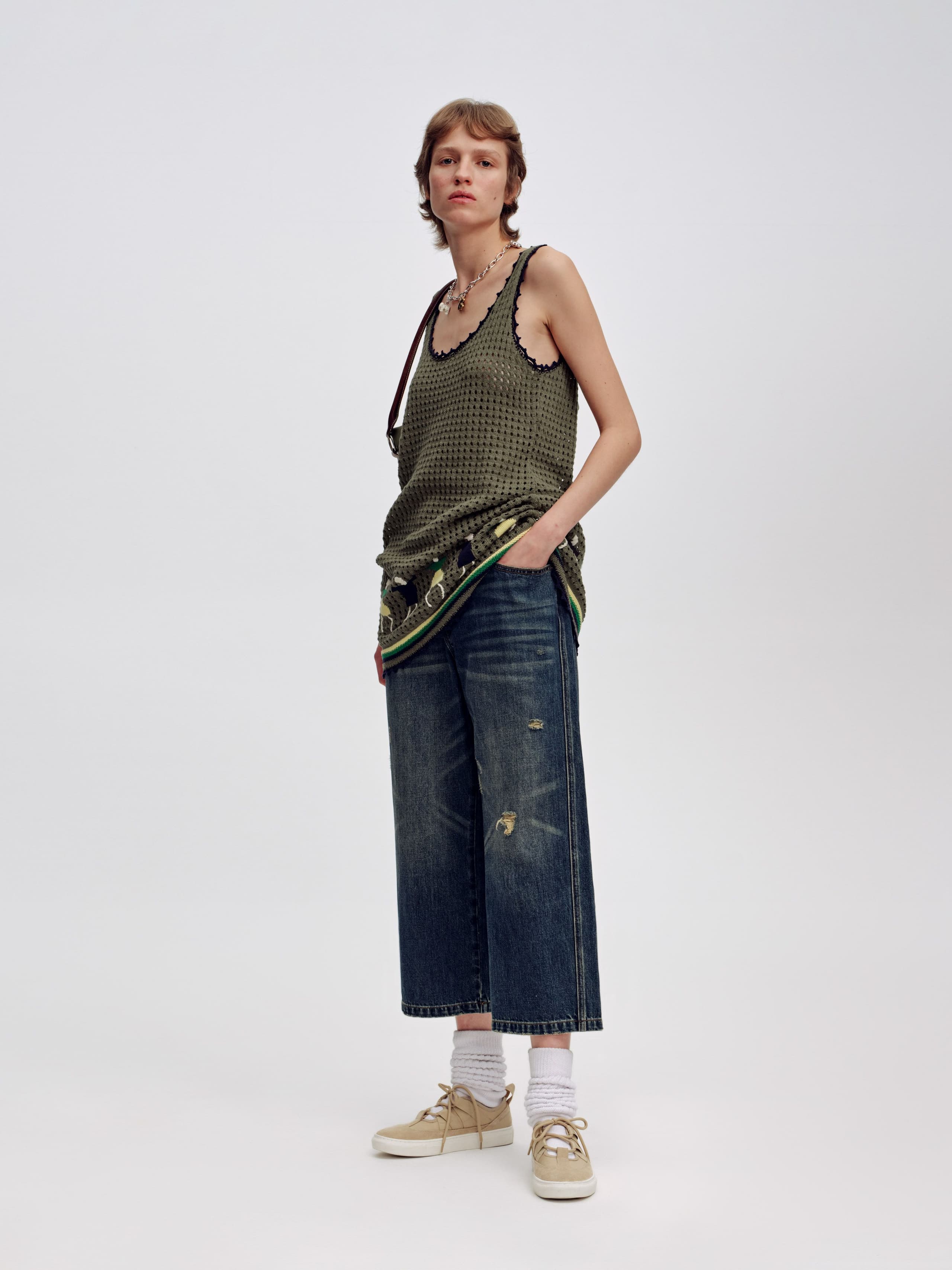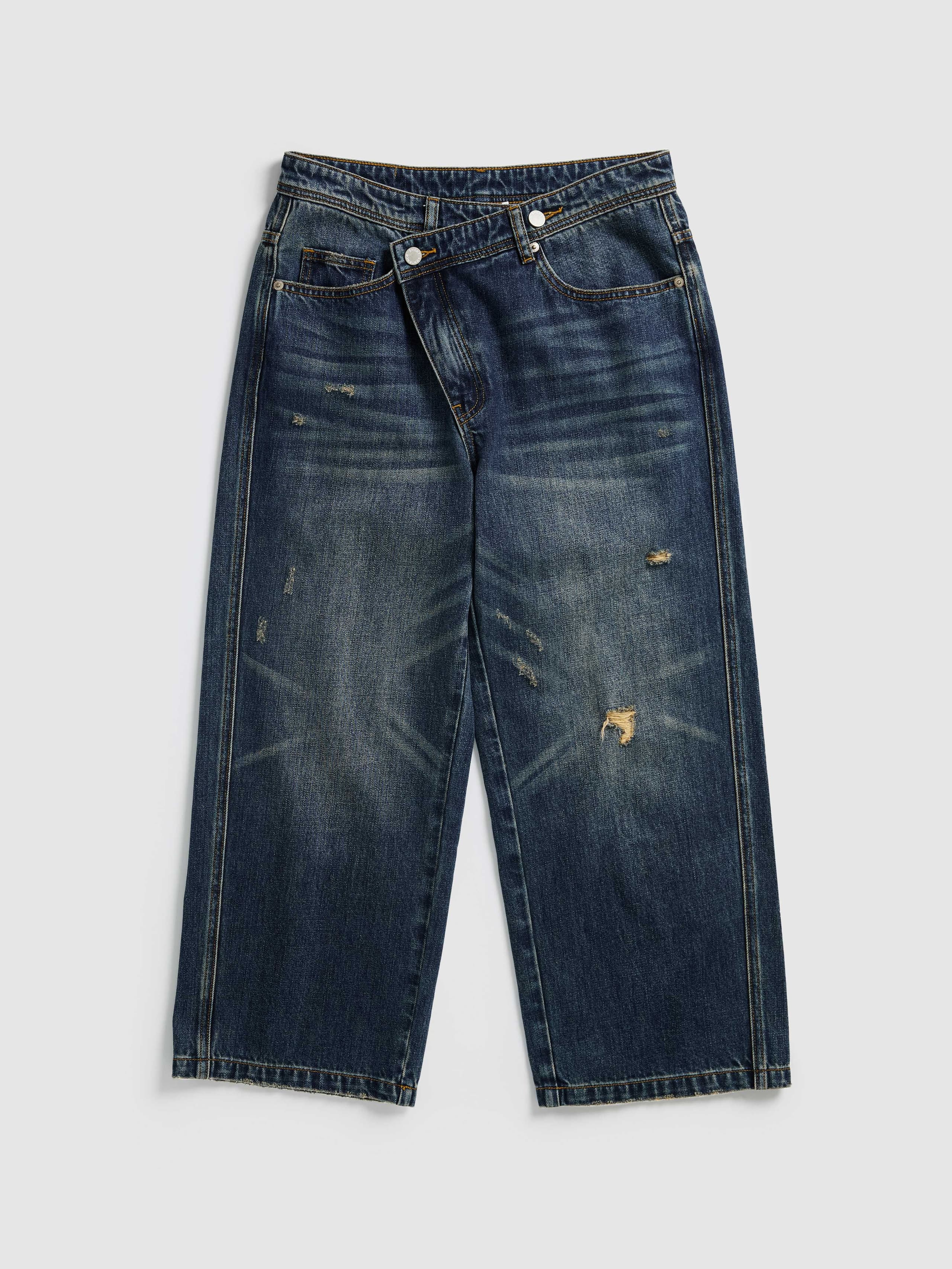 The Distressed Low-Rise Cropped Denim Pants combine casual comfort with a bold, vintage-inspired aesthetic. Made from medium-weight, non-stretch twill denim, these pants feature a worn-in look with faded washes, distressed details, and ripped accents. Designed with a slouchy mid-low-rise fit, diagonal fly seam, and cropped length, they deliver effortless style for both casual and semi-edgy outfits.