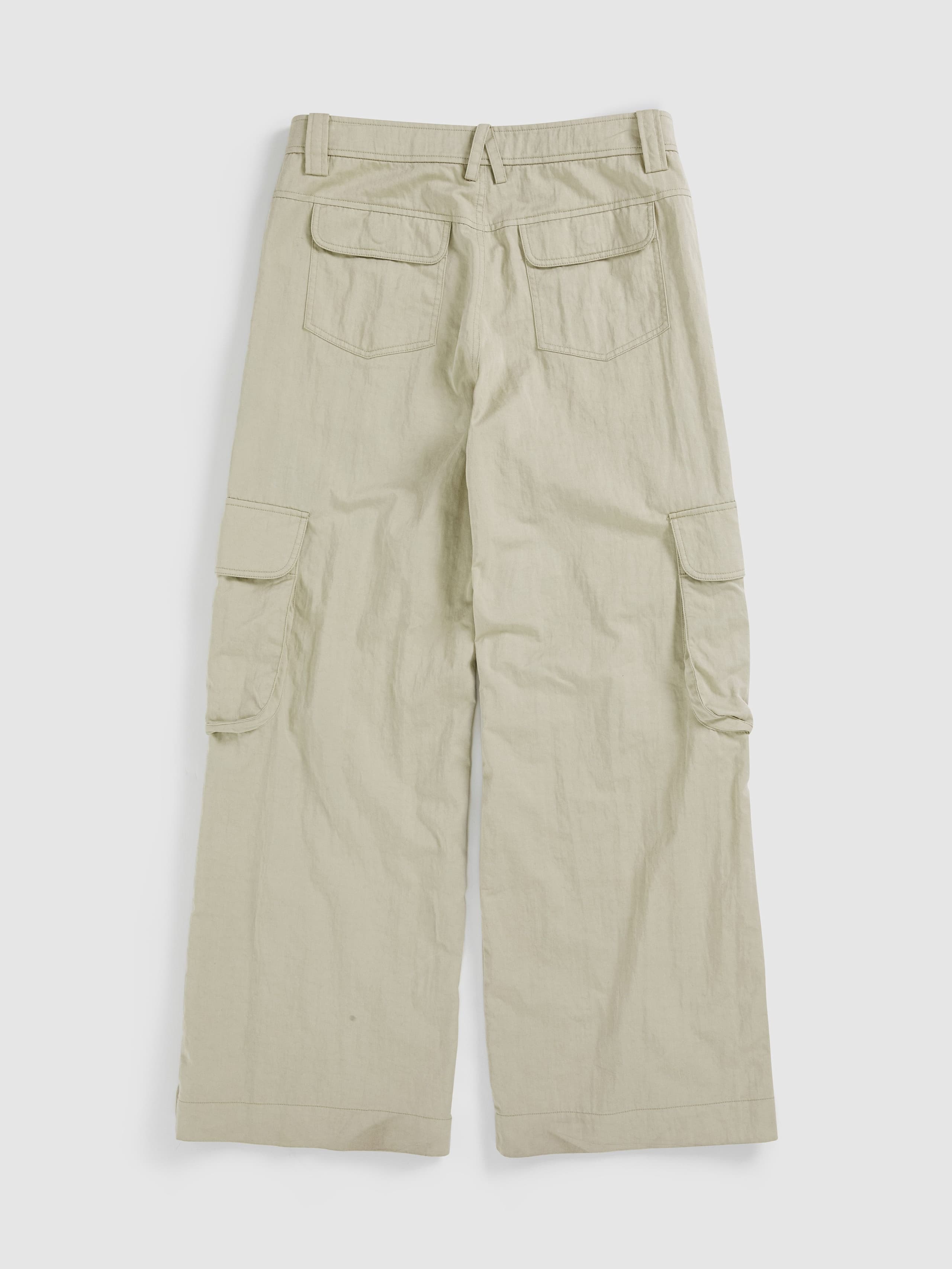 The Distressed Washed Cargo Trousers feature a textured cotton-nylon blend with a subtle sheen and structured drape. The garment-washed finish enhances the seam details and natural creases, adding a relaxed, lived-in feel. Designed with multiple cargo-style pockets, a mid-rise waist, and a straight wide-leg cut, these trousers balance utility and effortless style.