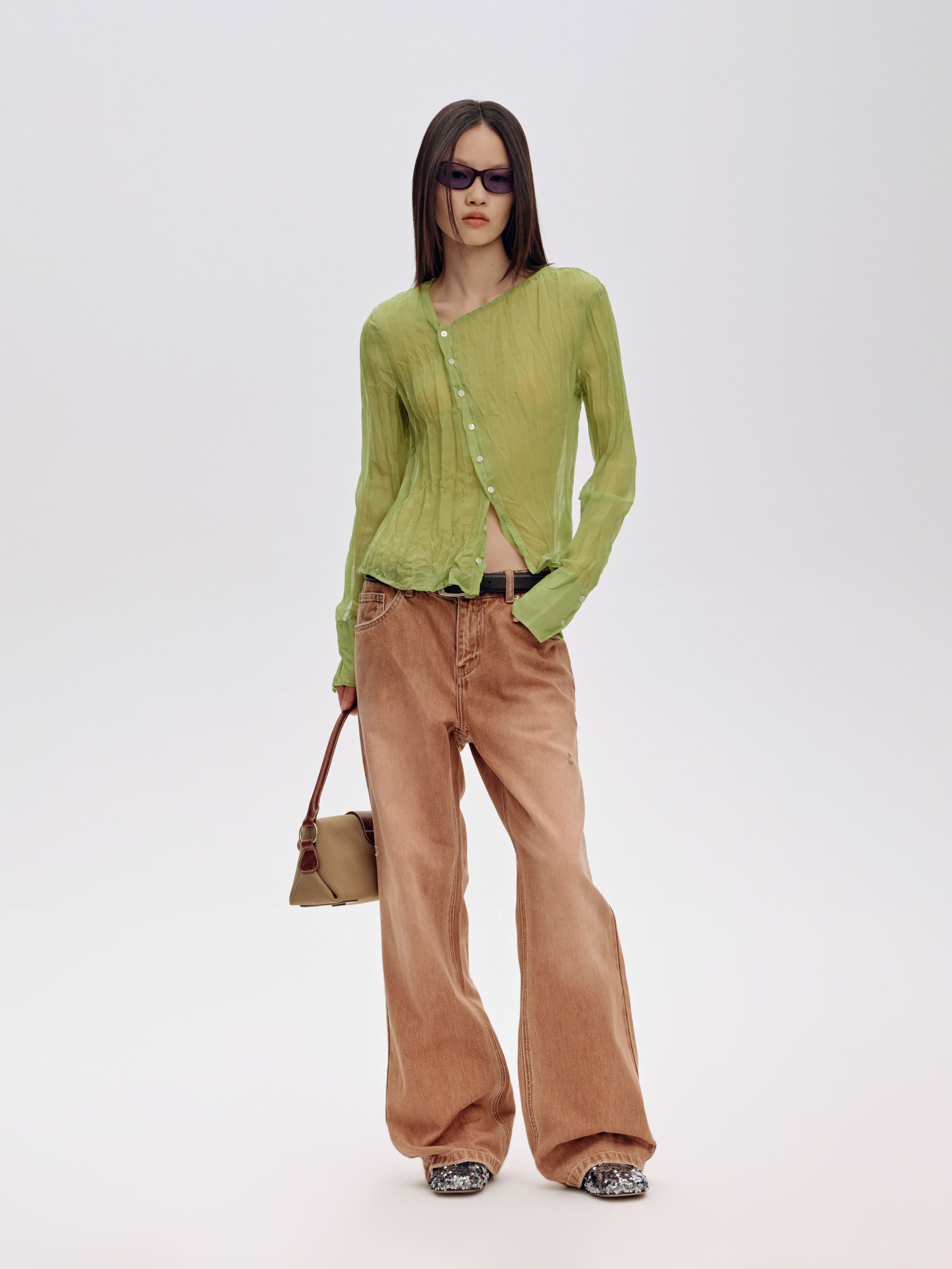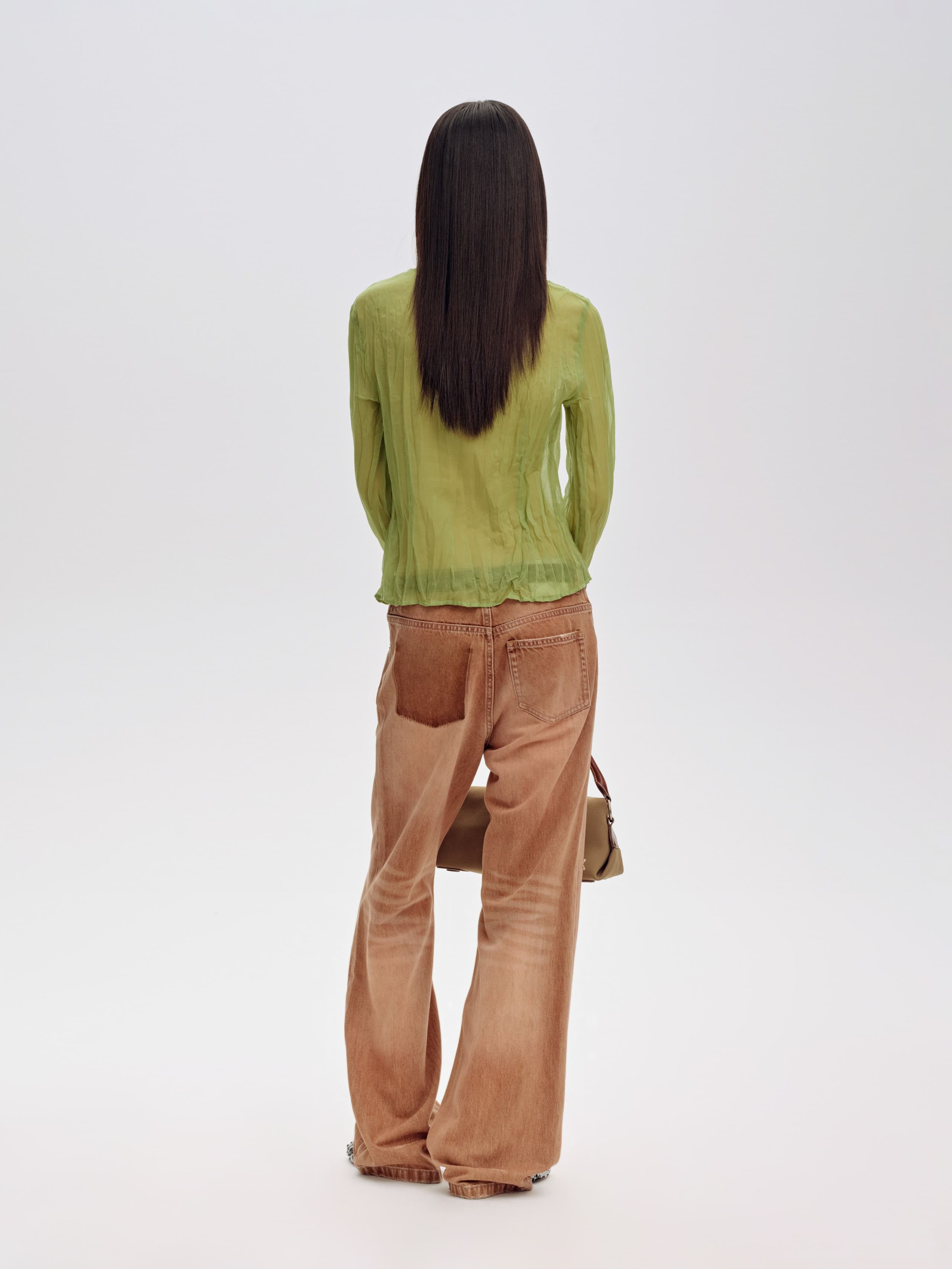 The Distressed Washed Low-Rise Bootcut Jeans are crafted from 100% pure cotton denim, featuring a faded wash effect for a worn-in vintage feel. The bootcut silhouette elongates the legs, while the low-rise fit adds a relaxed, effortless edge. Classic five-pocket styling and a button-fly with metal zipper enhance functionality, with a Short Sentence logo patch on the back waist for a signature touch.