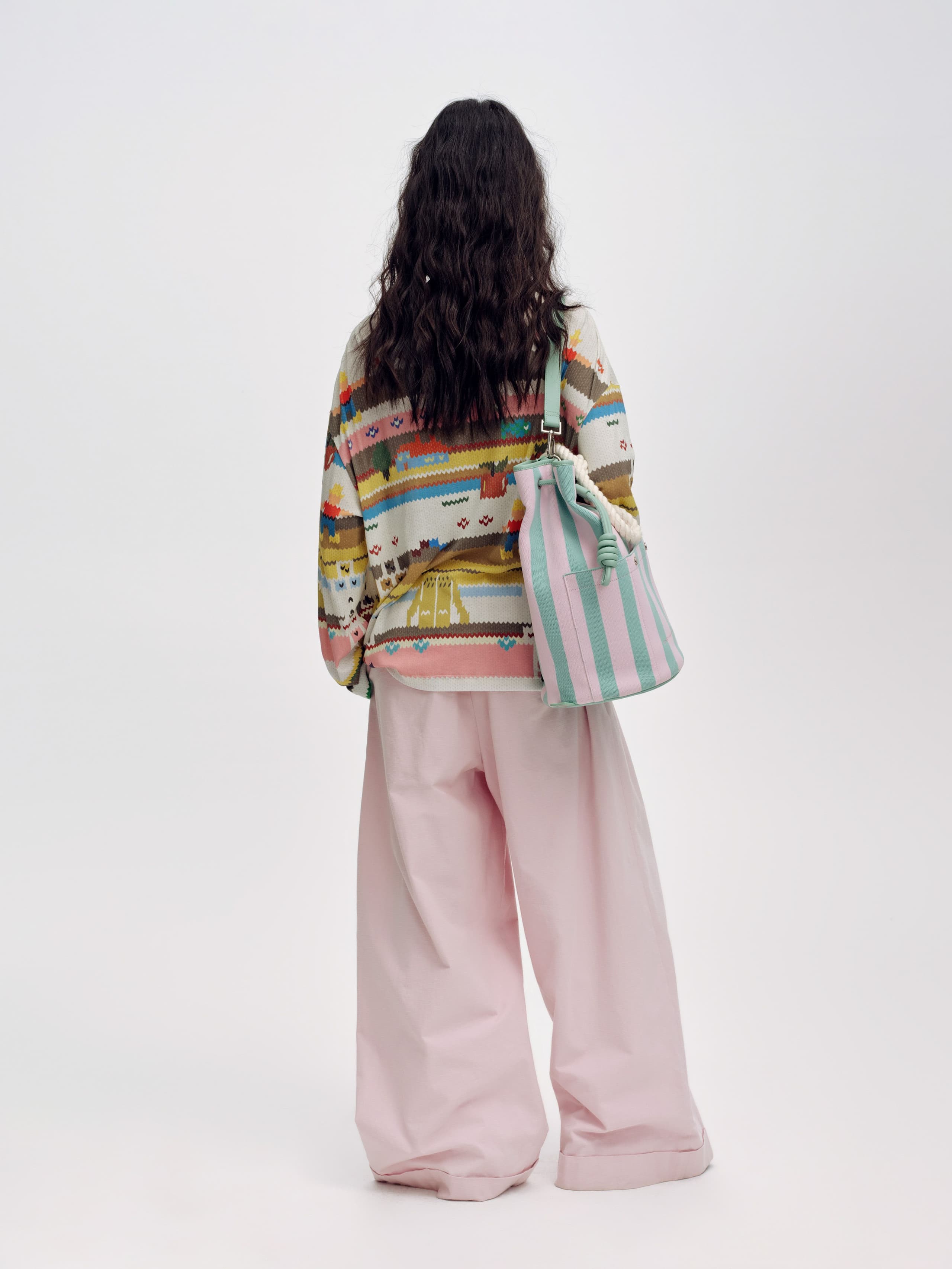The Faux-Sweater Print Cropped Trousers combine a bold print design with practical workwear-inspired details. Made from 100% cotton twill fabric, these mid-low-rise trousers feature a straight-leg silhouette with a relaxed taper and cropped length. Contrasting stitching, knee paneling, and utility-inspired details add a contemporary edge to the design. The digital sweater-like print brings a playful, textured aesthetic to these versatile pants.