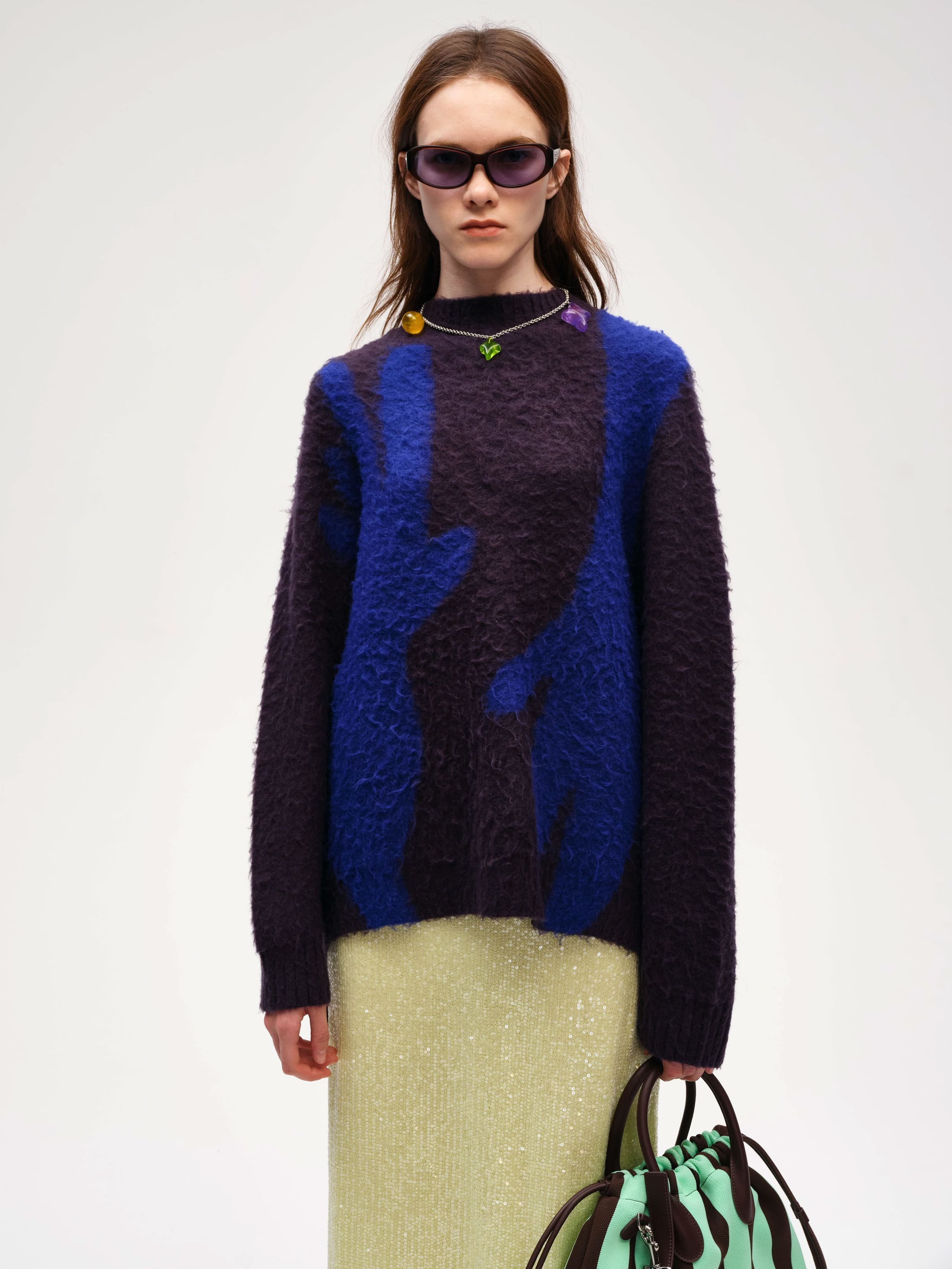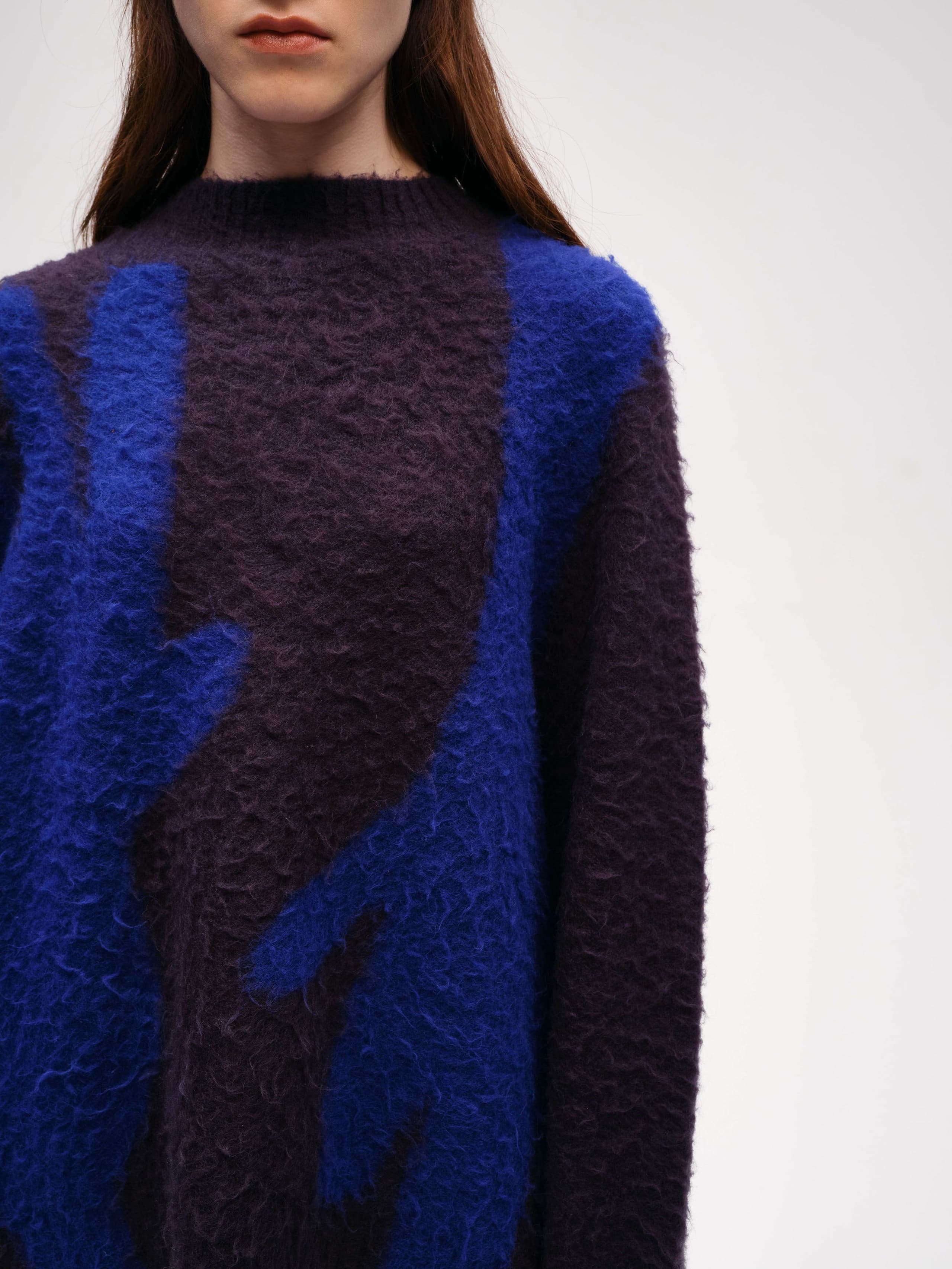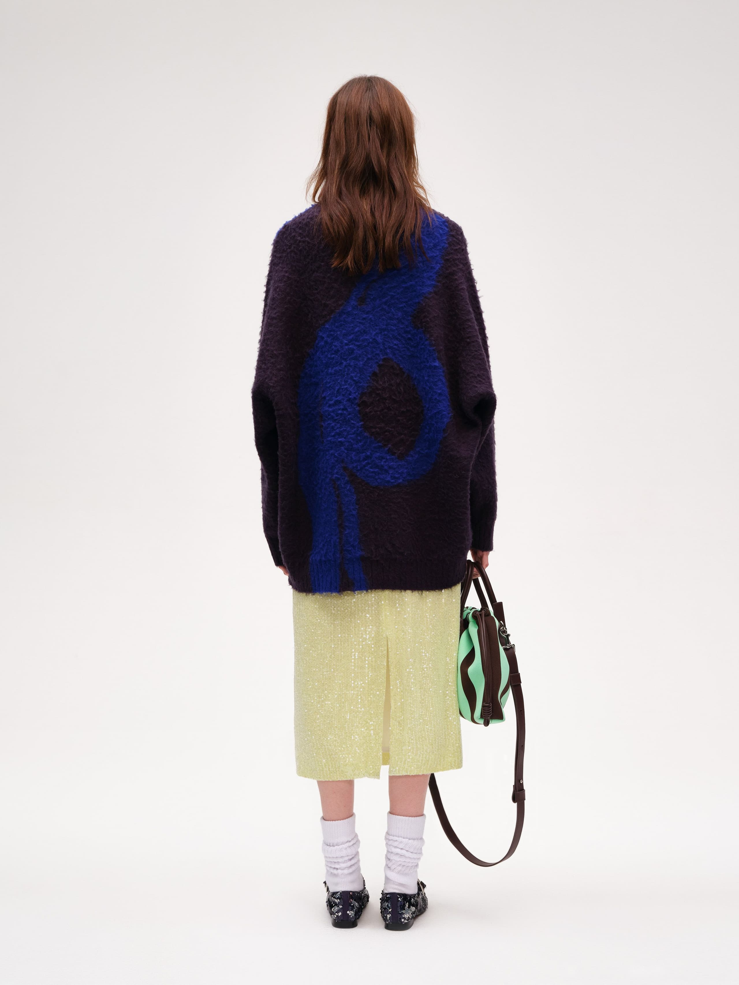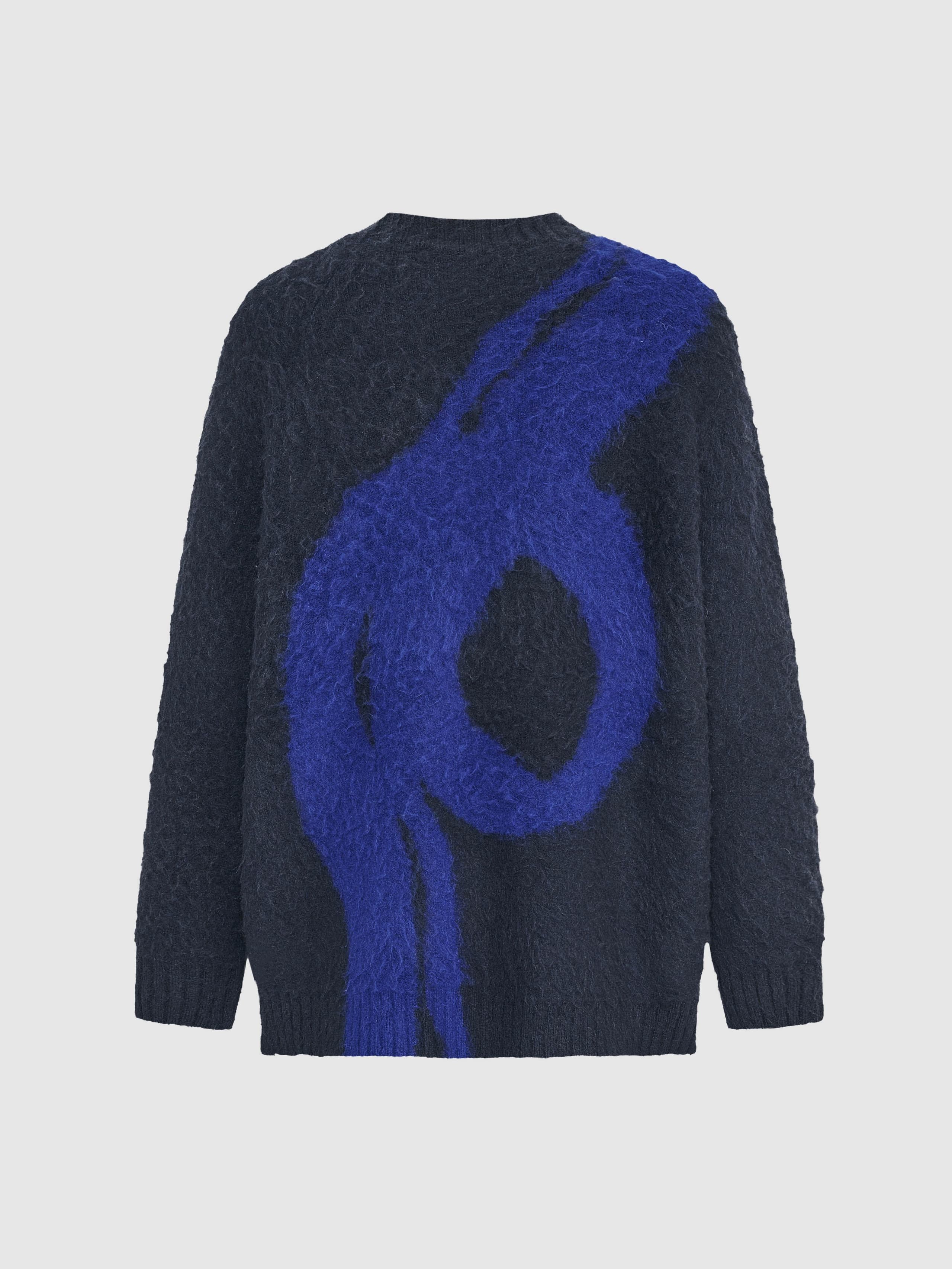 The Large Pattern Daily Sweater is crafted from a stretchy brushed yarn, giving it a soft, plush texture with a voluminous look. This oversized, crew-neck pullover features a relaxed fit with a high-low hem that adds depth and elongates the legs for a flattering silhouette. The bold jacquard pattern with contrasting colors adds a playful artistic touch, creating a sweater that feels like a warm embrace and brings a visual impact to your daily wardrobe.
