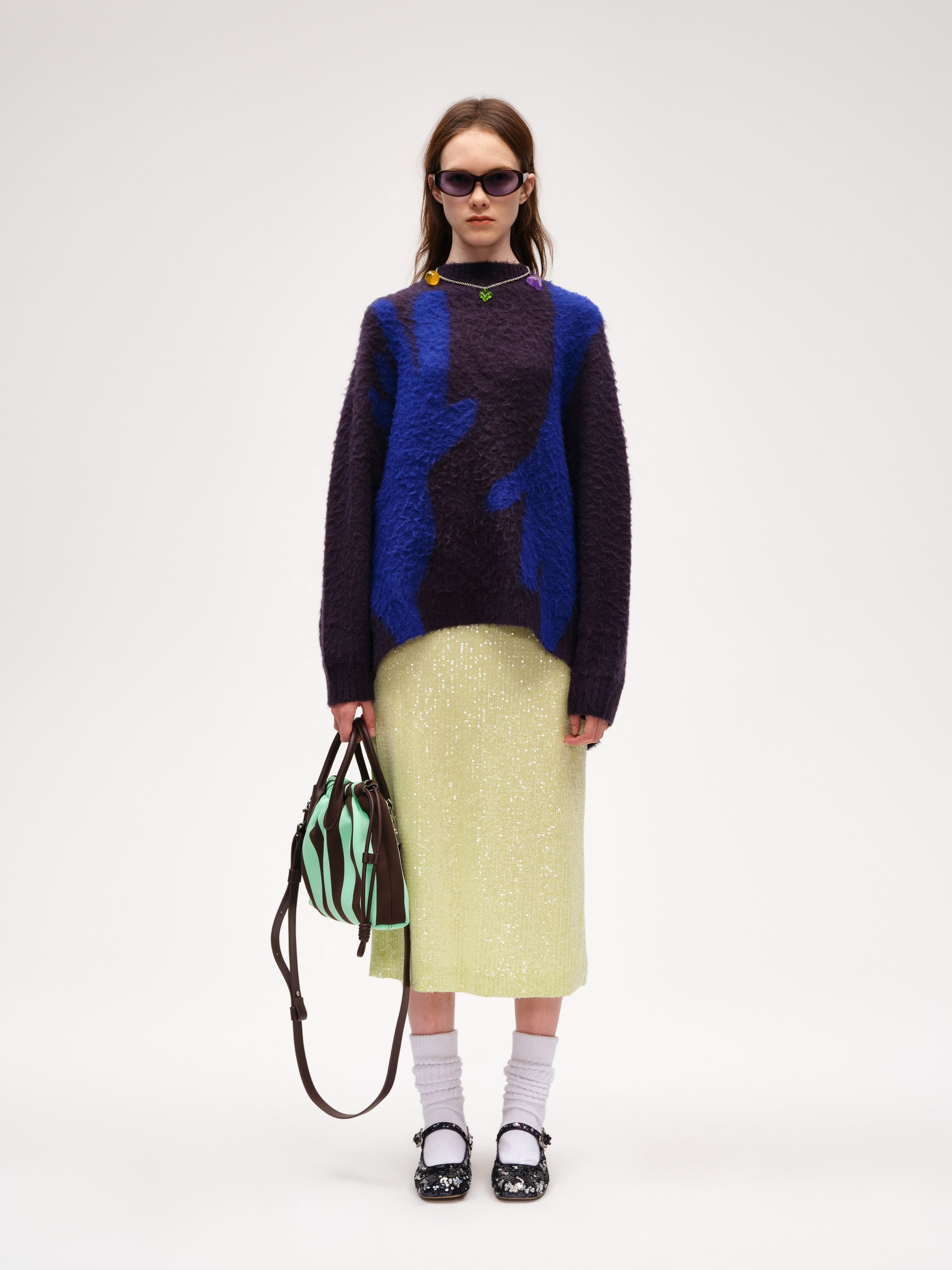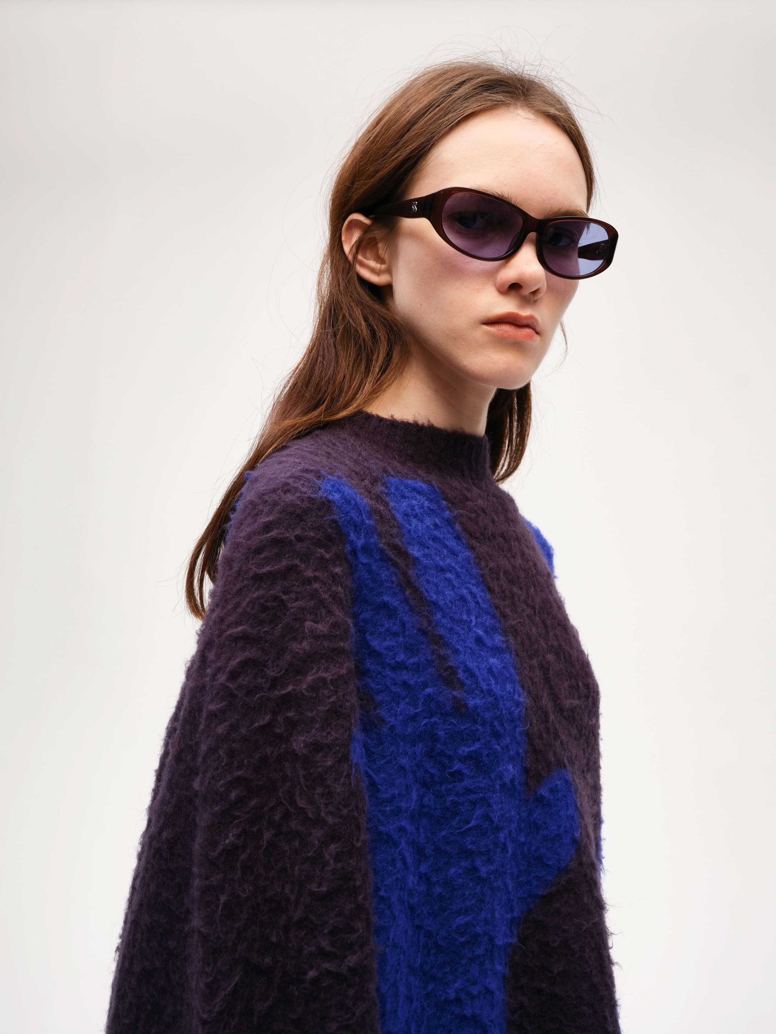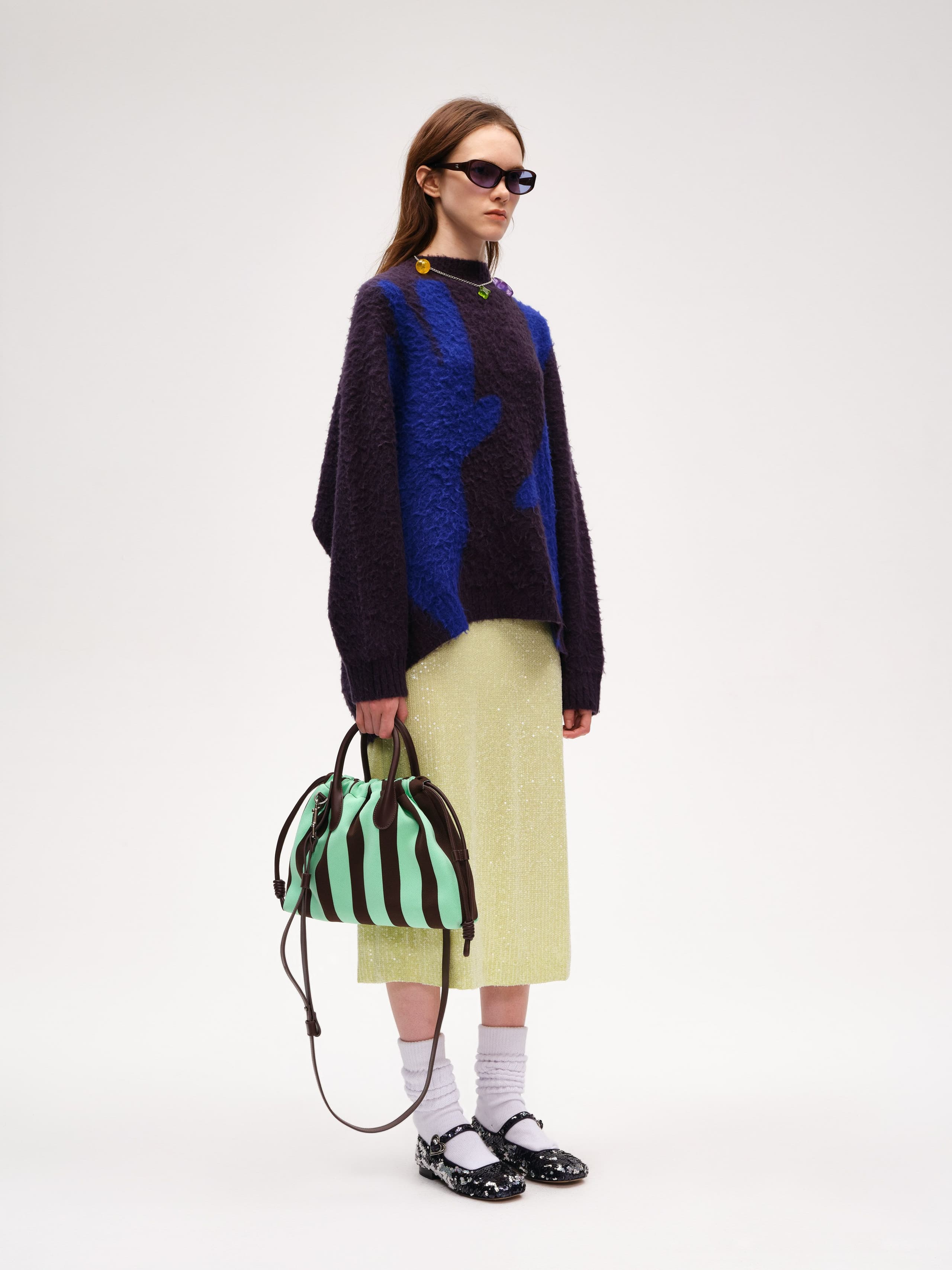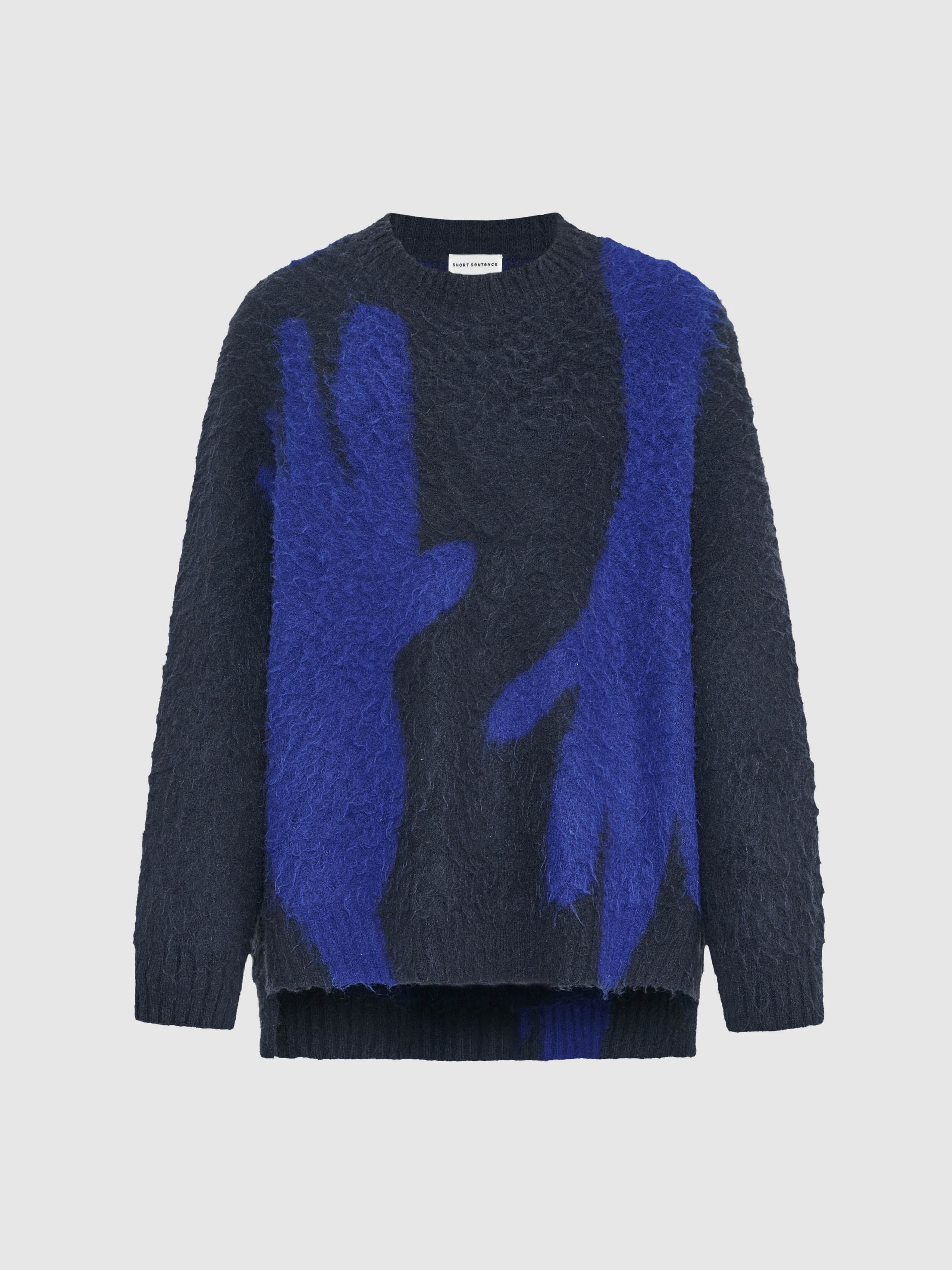 The Large Pattern Daily Sweater is crafted from a stretchy brushed yarn, giving it a soft, plush texture with a voluminous look. This oversized, crew-neck pullover features a relaxed fit with a high-low hem that adds depth and elongates the legs for a flattering silhouette. The bold jacquard pattern with contrasting colors adds a playful artistic touch, creating a sweater that feels like a warm embrace and brings a visual impact to your daily wardrobe.
