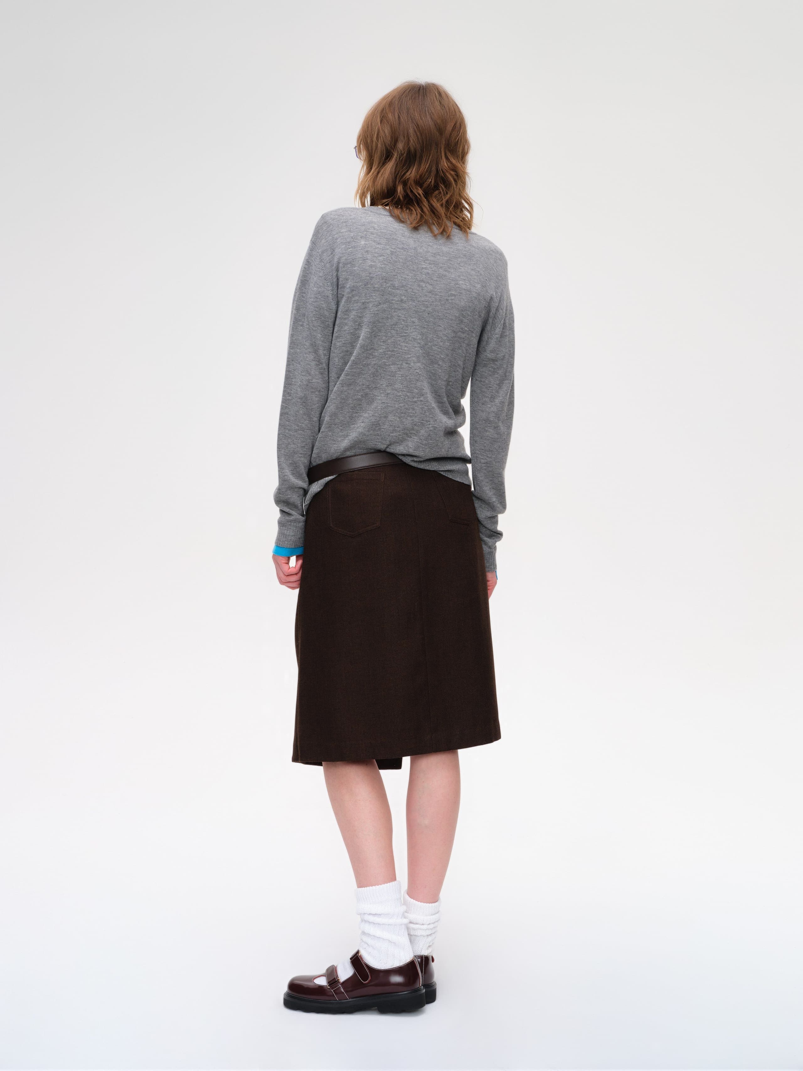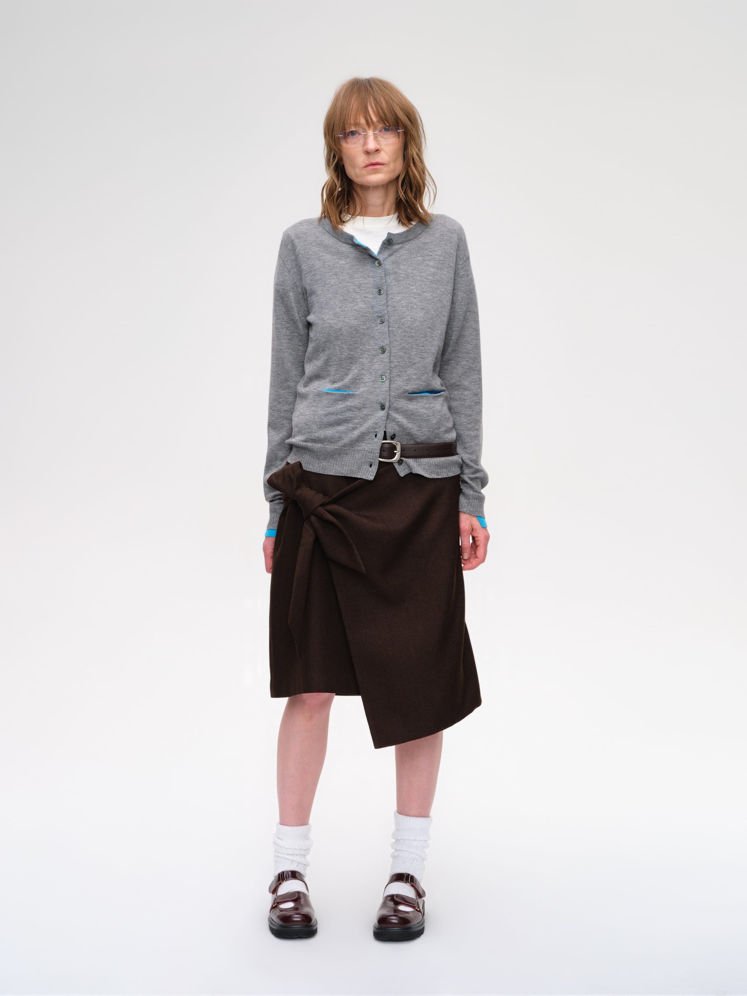 A cropped cardigan made from imported speckled yarn with playful, artisanal details. The front features oversized patch pockets with hand-stitched contrast edging, while natural roll edges at the cuffs and neckline bring a casual finish. A woven logo label at the cuff adds a subtle branded touch.