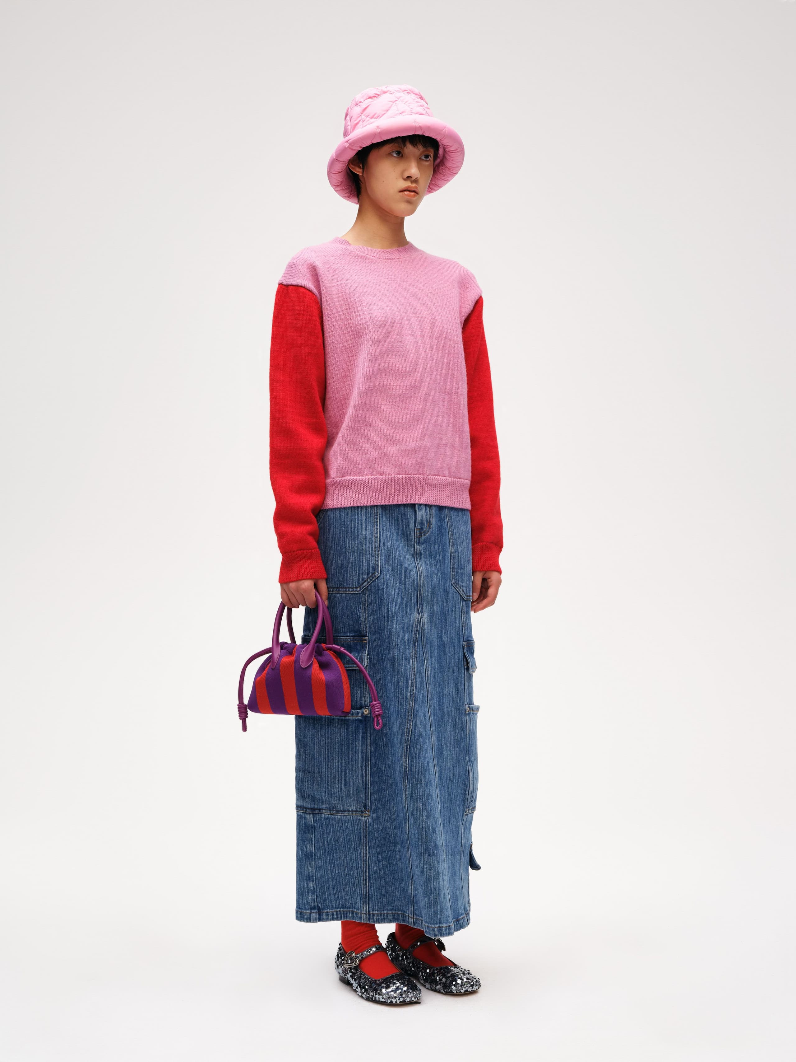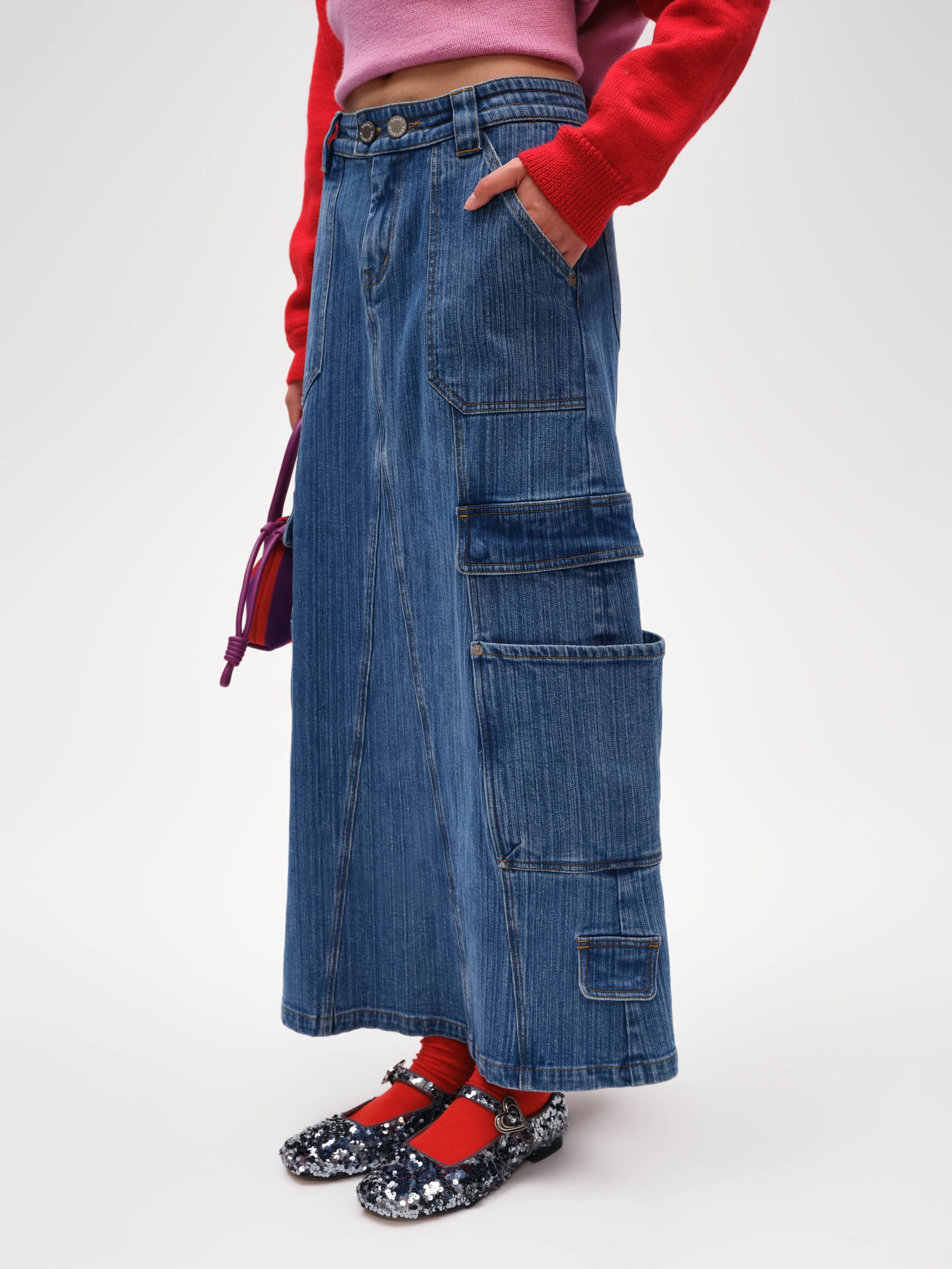 The Workwear Bamboo Denim Midi Skirt is crafted from stretch bamboo denim, combining comfort with a rugged, vintage look. Featuring a low-waist A-line fit, this skirt includes decorative seam details, side flap pockets, and a unique back slit for added movement and style. The bamboo denim’s textured finish adds character while the elastic blend ensures easy wear.