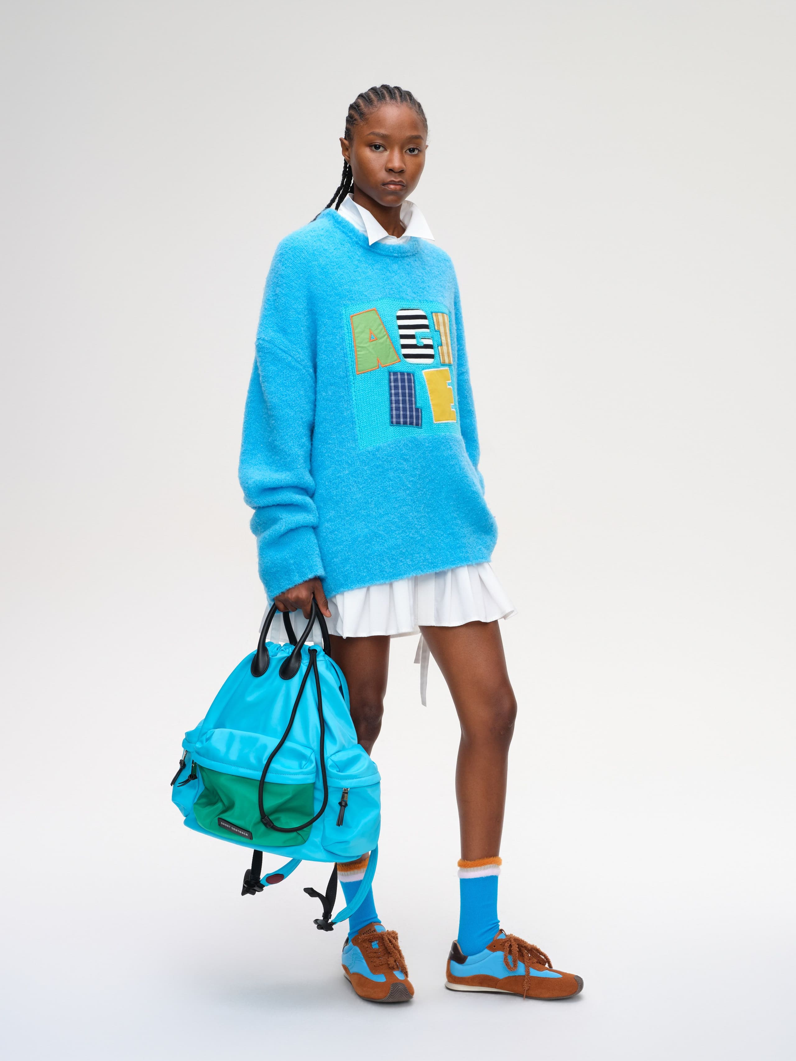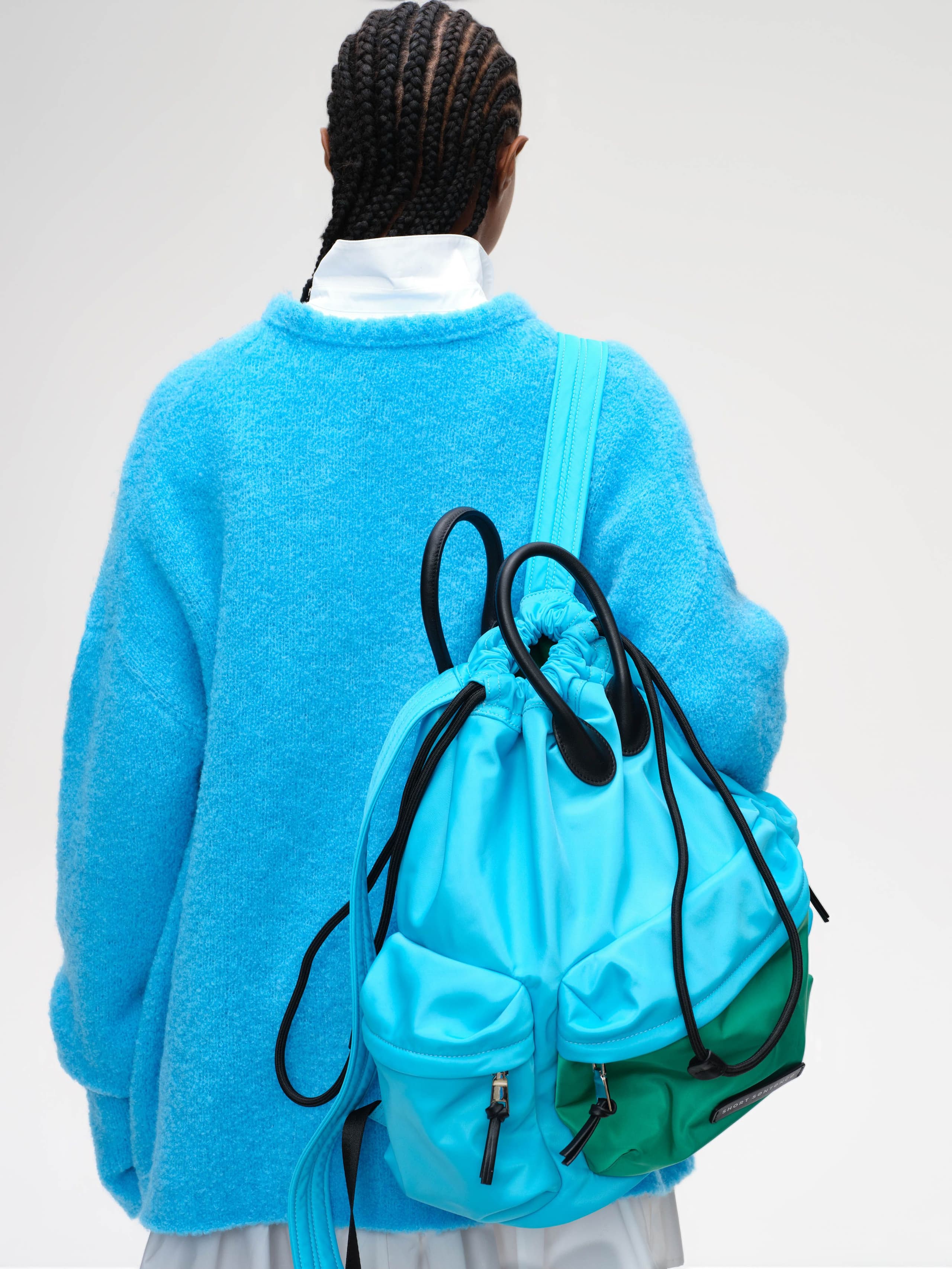 A versatile everyday backpack with a bold color-block pocket design. Made from durable nylon, it features leather-accented zip pulls, a black leather logo patch, and a practical interior layout with a padded compartment, small slip pocket, and secure zip pocket.