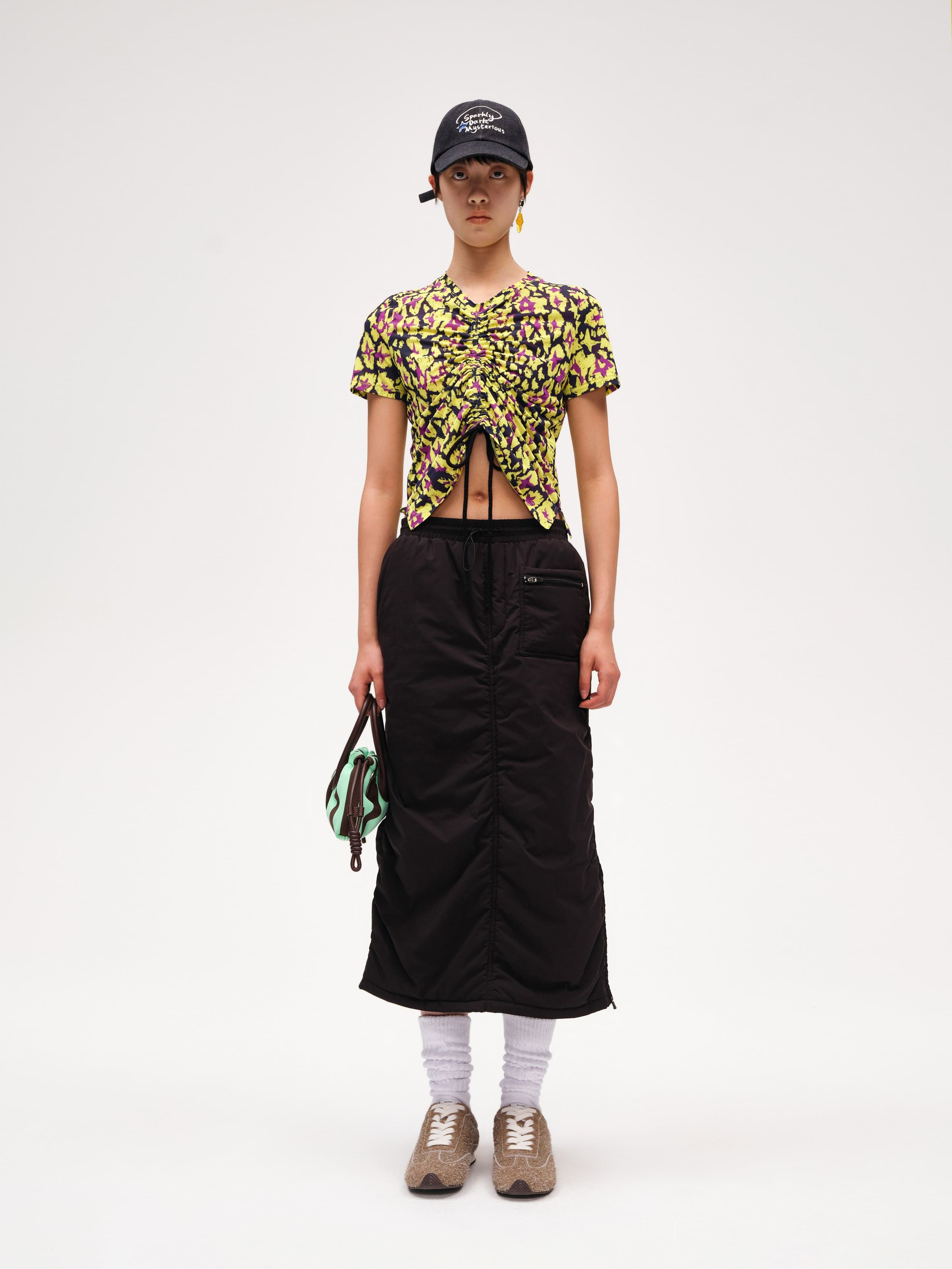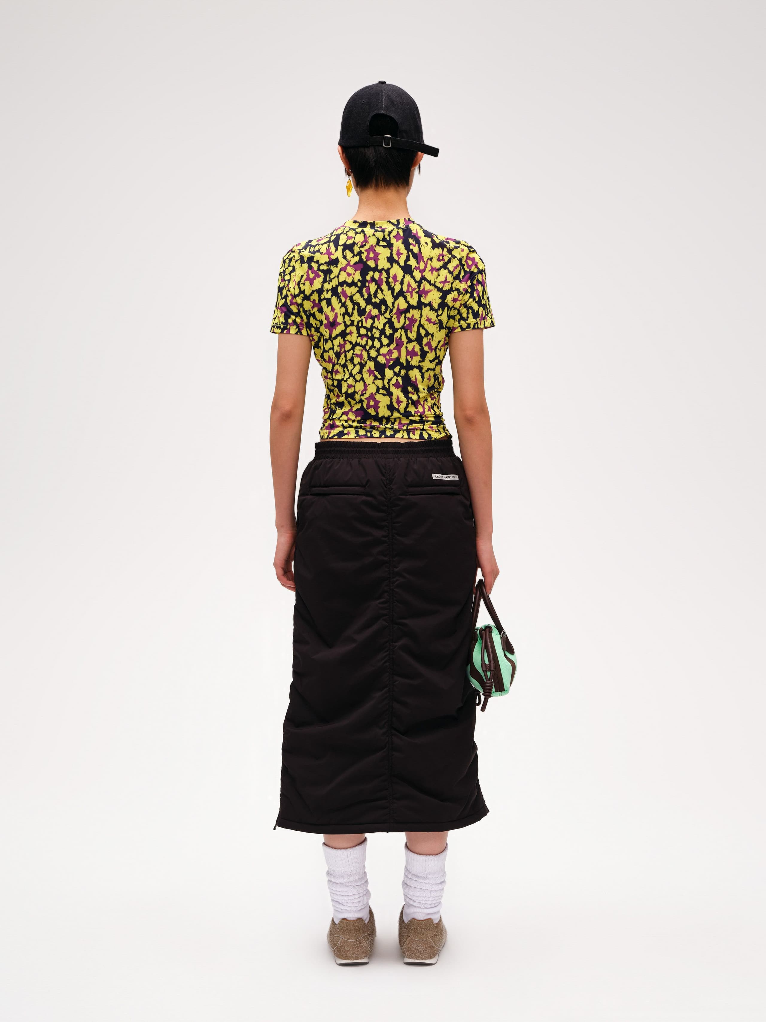 The Quilted Skirt combines warmth and style with its sustainable, matte fabric and cozy padding. Designed with a straight silhouette and elastic waistband, it offers a comfortable fit that flatters various body types. The pintucked seams add texture and dimension, while the side slit with a semi-automatic nylon zipper allows for adjustable movement. This skirt’s versatile design makes it perfect for layering with leggings or tights for a stylish, winter-ready look.