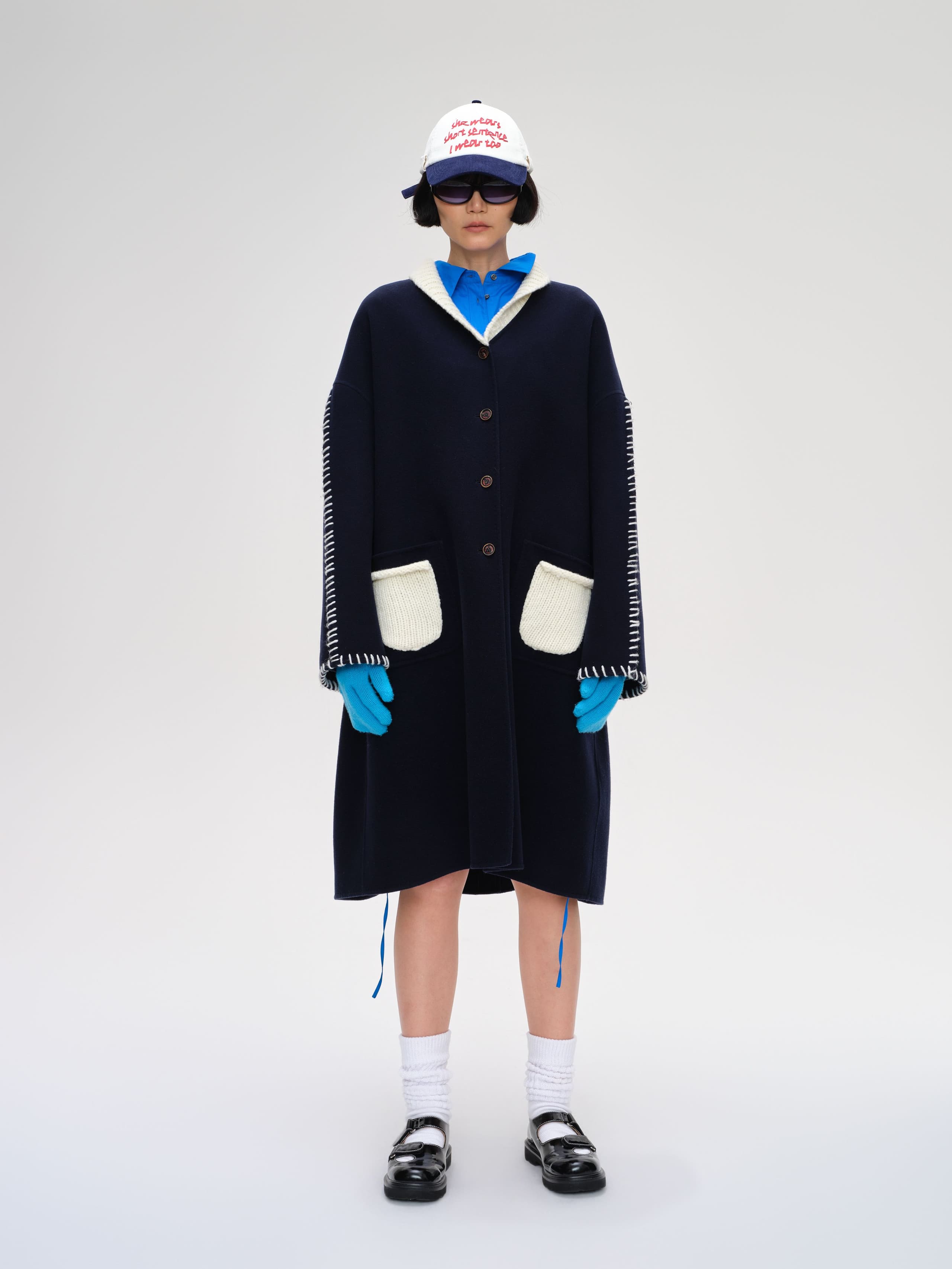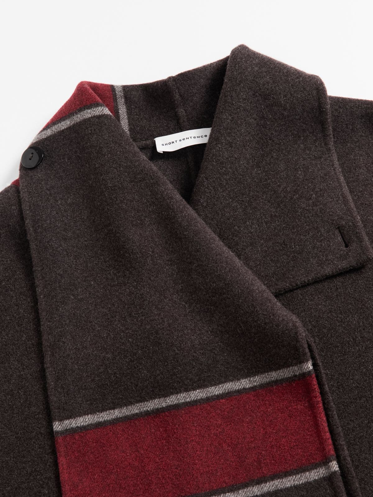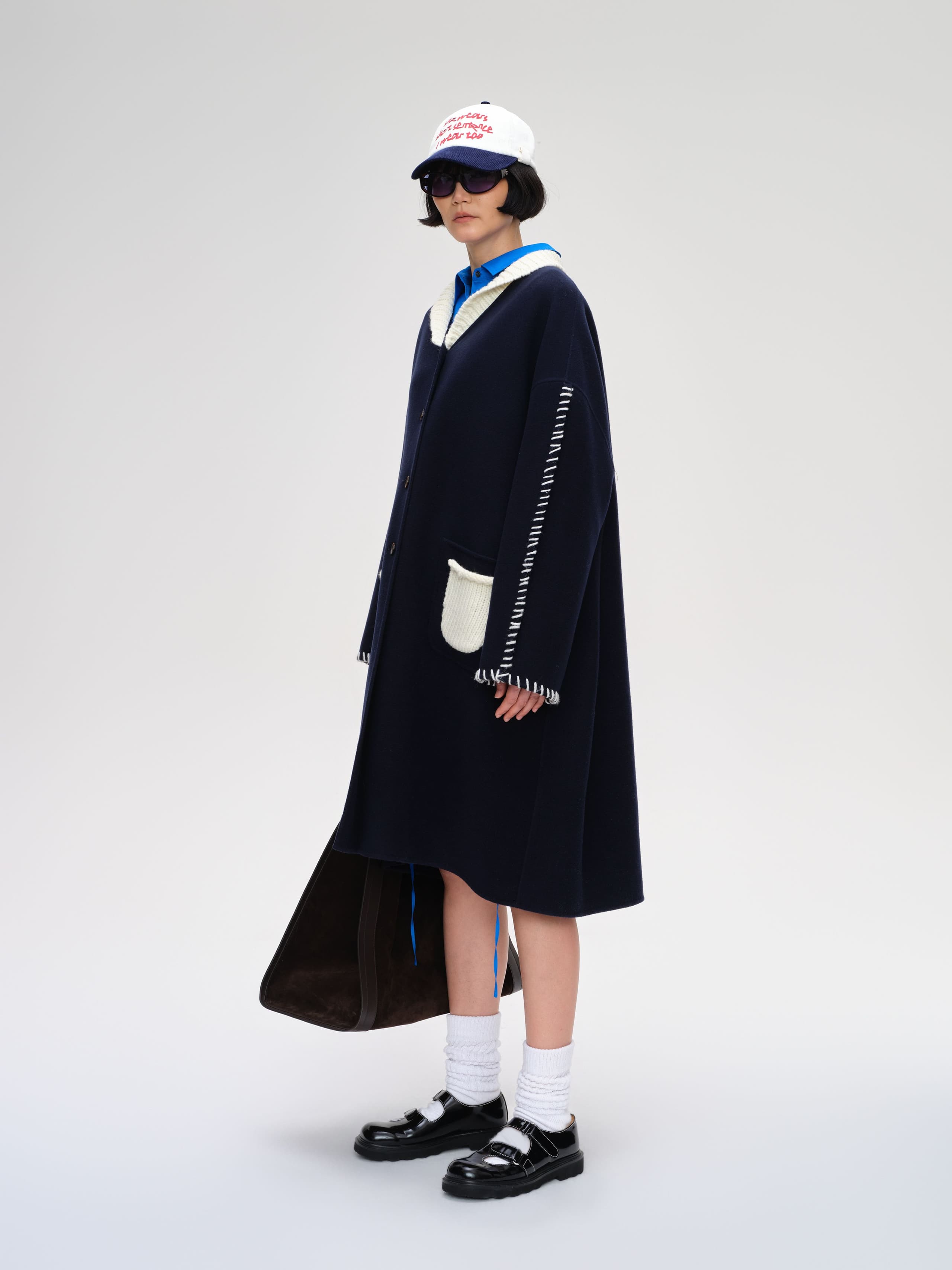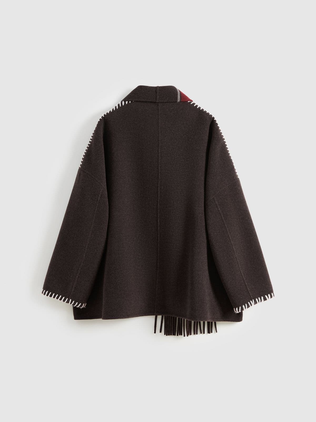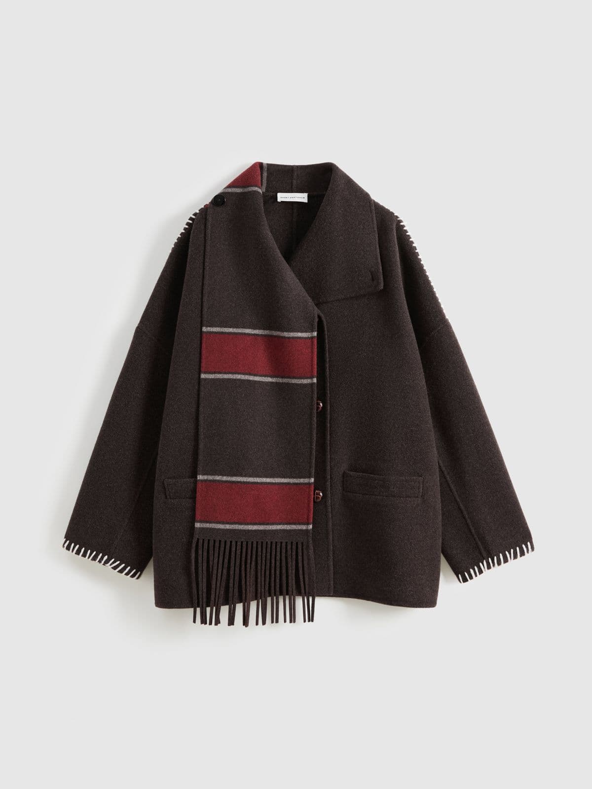 An elegant double-faced wool coat with an integrated striped tassel scarf that drapes naturally for added warmth and sophistication. The oversized drop-shoulder silhouette offers a relaxed yet structured look, while contrasting hand embroidery along the shoulder seams and cuffs adds a refined artisanal touch.
