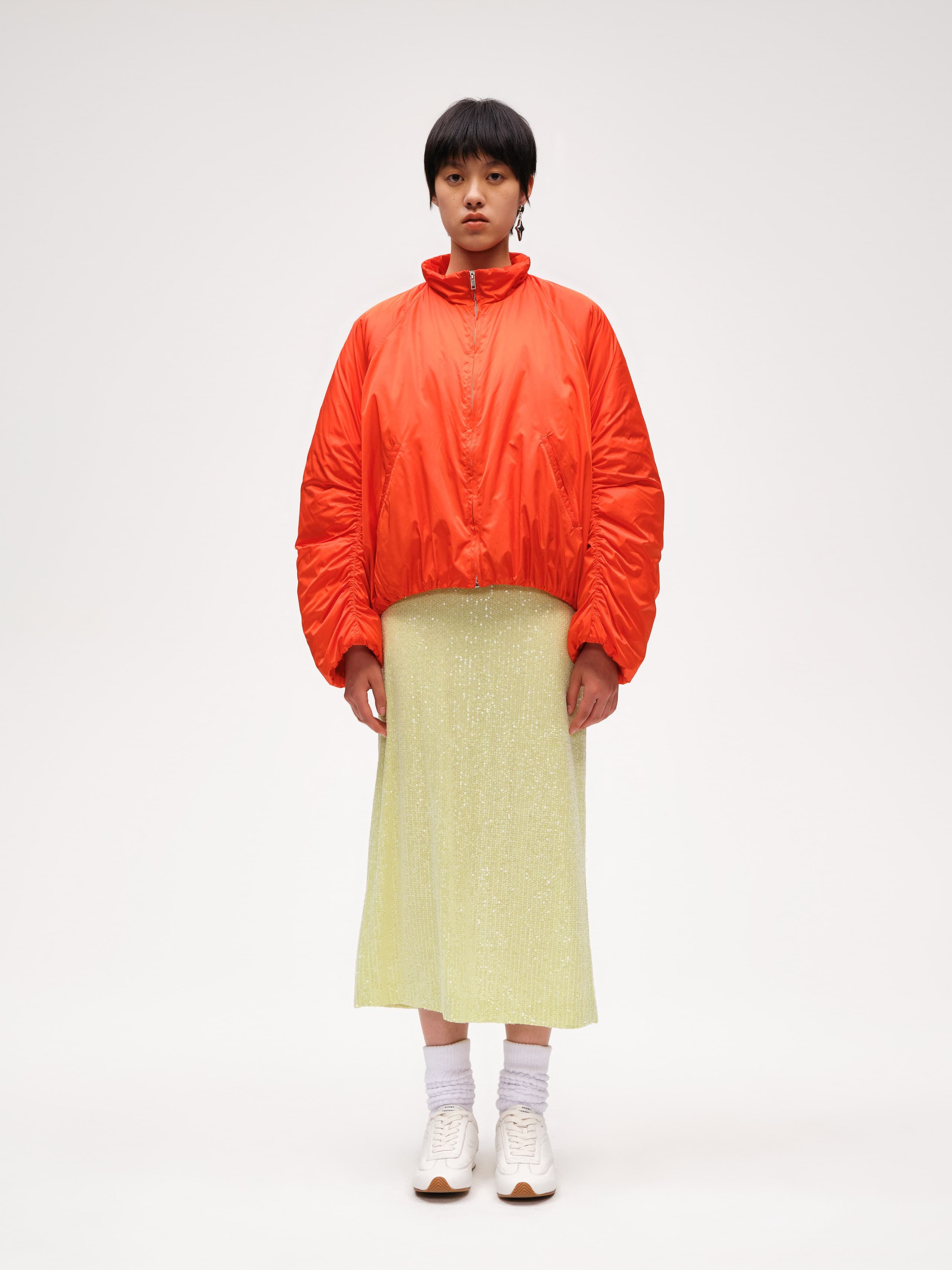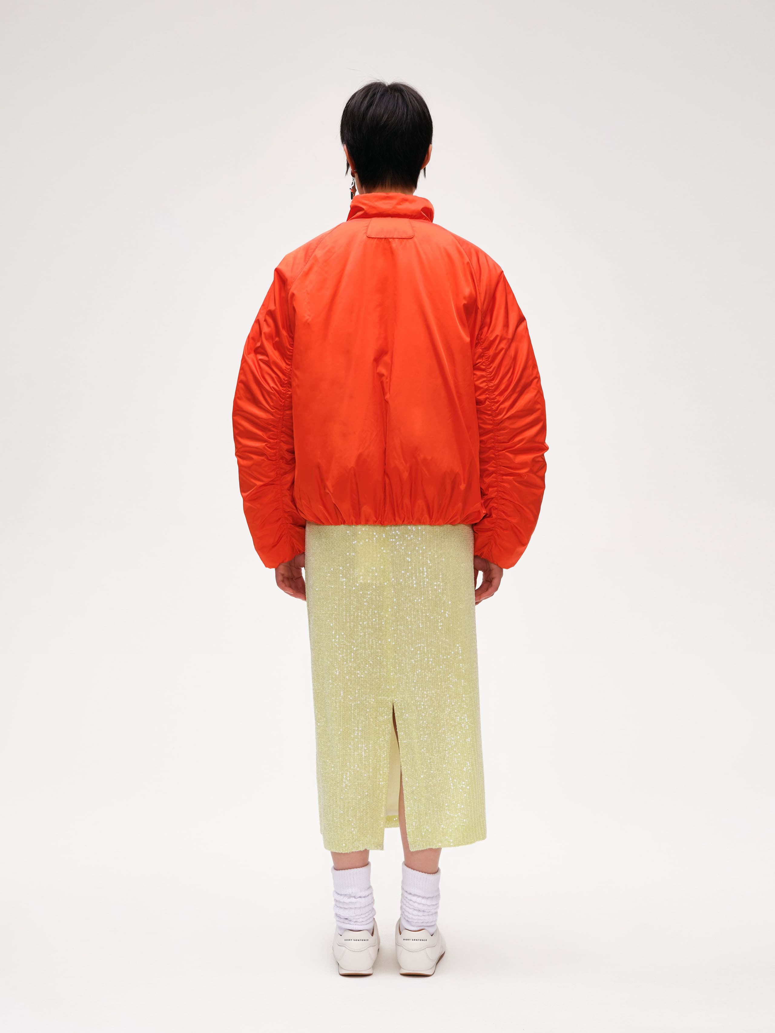 This Short Raglan Sleeve Puffer Jacket is crafted from high-density 25D glossy polyester, giving it a sleek satin-like finish with rich, vibrant color. The relaxed raglan sleeve design allows for easy movement, while the lightweight padding throughout ensures warmth without added bulk. Featuring a small stand collar, zip-up front, and gathered cuffs and hem for a snug fit, this jacket combines style and comfort effortlessly.