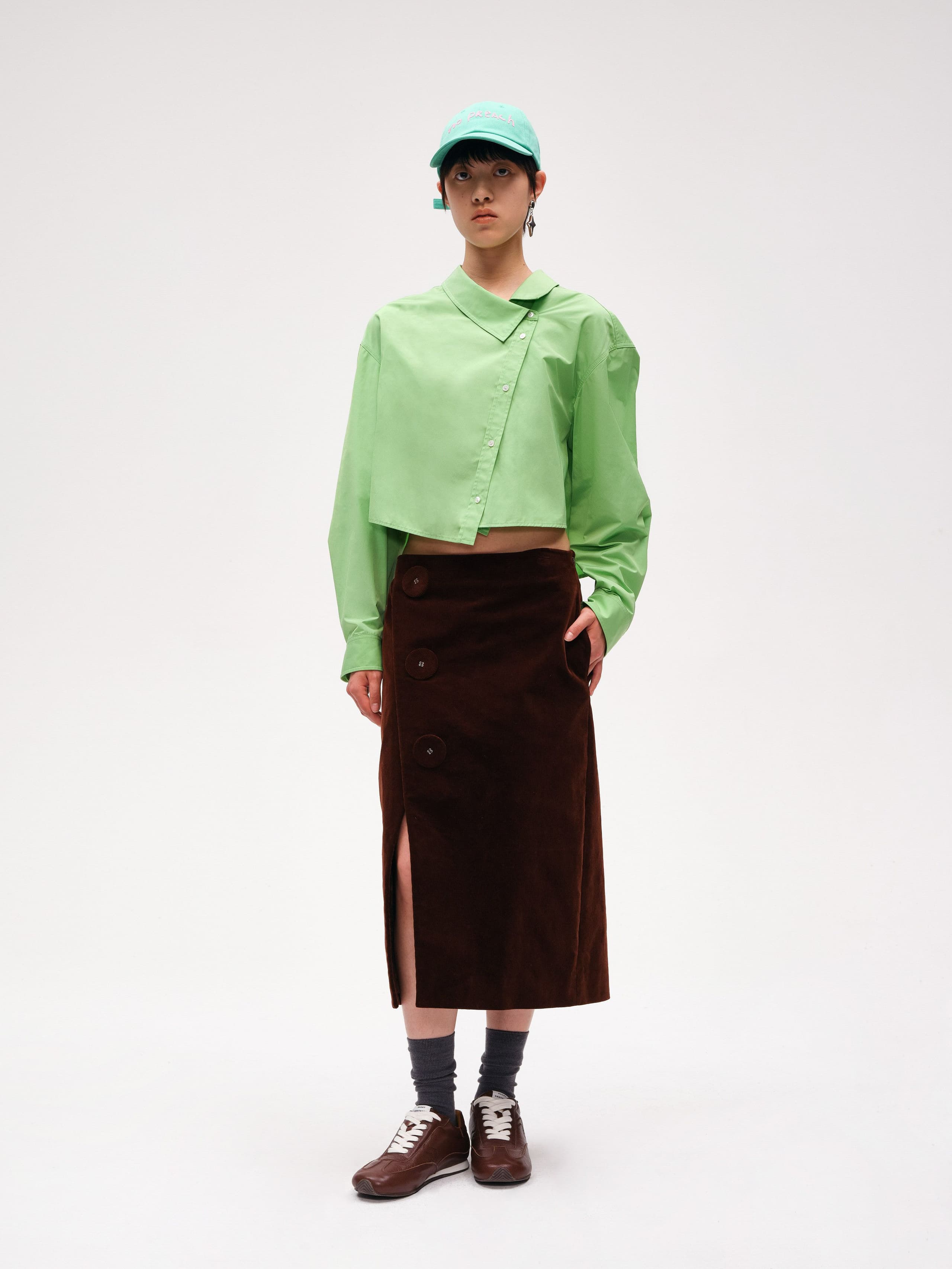 This Slanted Shirt features a unique asymmetrical front placket and a relaxed, boxy fit. Made from a blend of durable twisted polyester and premium combed cotton, the fabric offers a subtle sheen, natural texture, and a soft yet firm touch. It's breathable, wrinkle-resistant, and easy to wear, making it a versatile piece for both shirt and dress styles.
