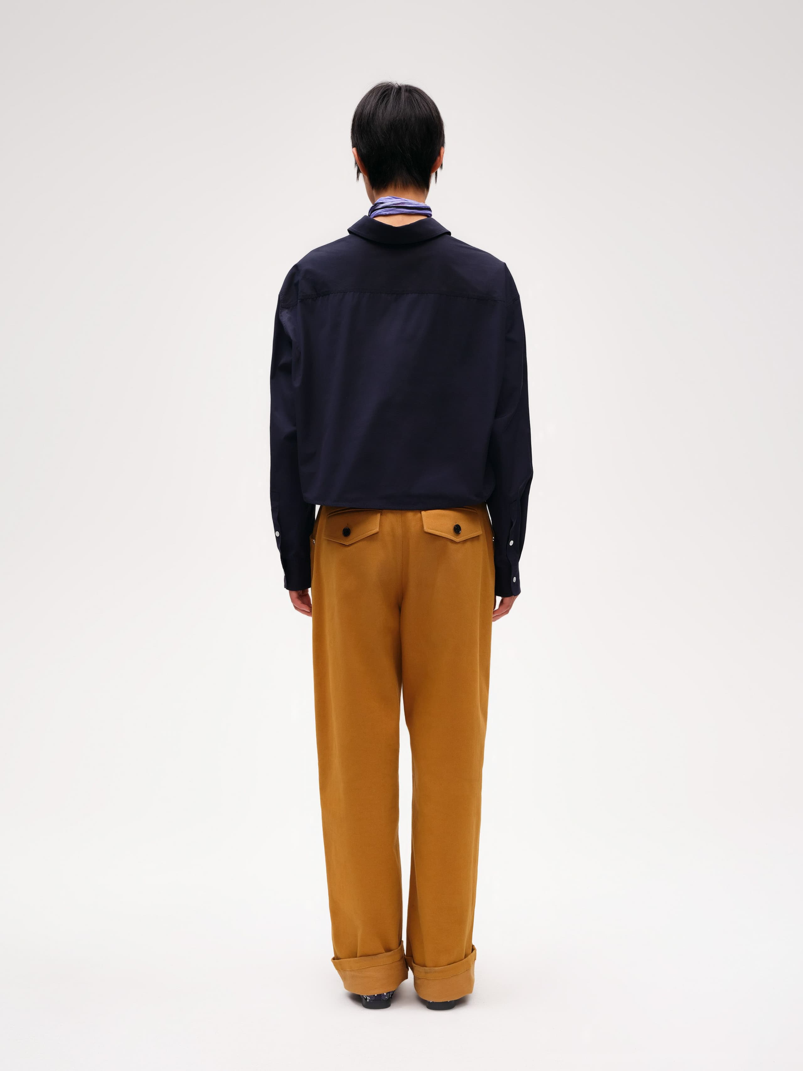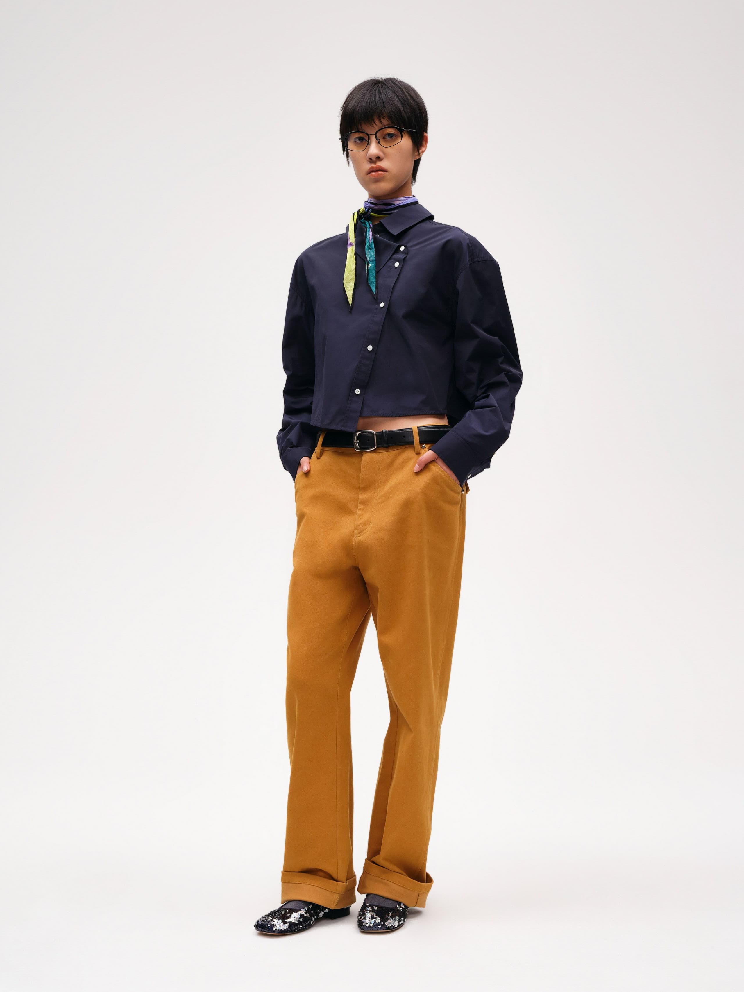 This Slanted Shirt features a unique asymmetrical front placket and a relaxed, boxy fit. Made from a blend of durable twisted polyester and premium combed cotton, the fabric offers a subtle sheen, natural texture, and a soft yet firm touch. It's breathable, wrinkle-resistant, and easy to wear, making it a versatile piece for both shirt and dress styles.