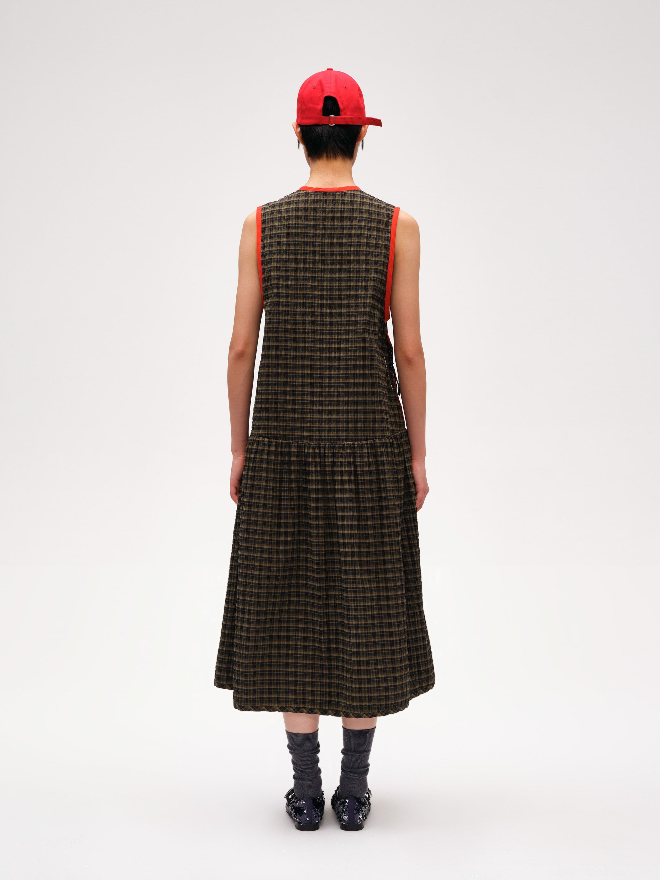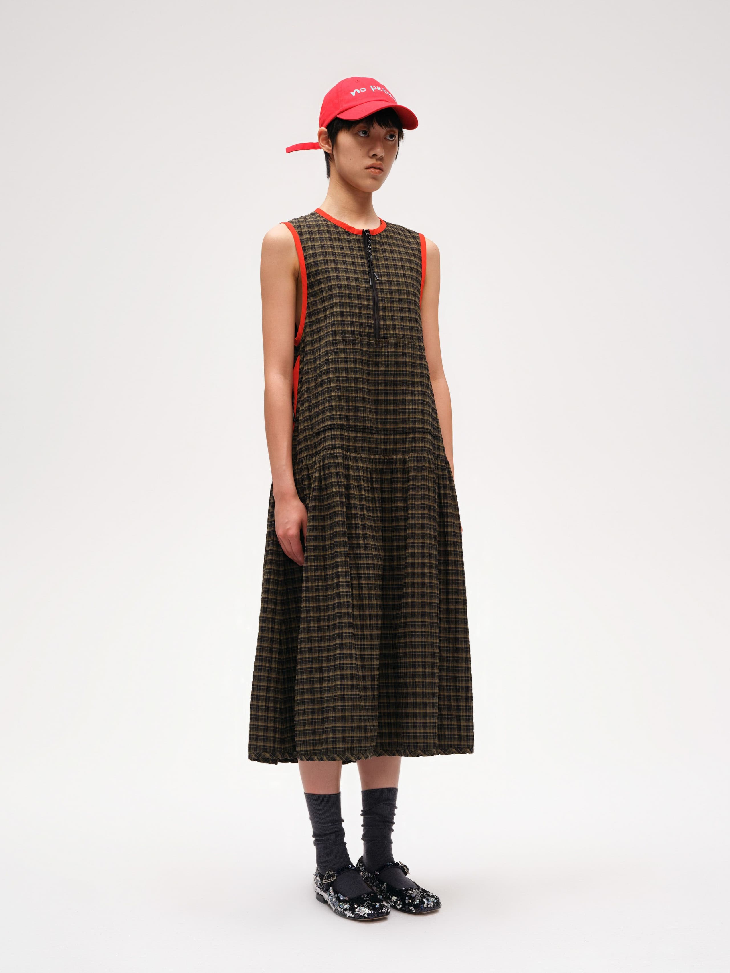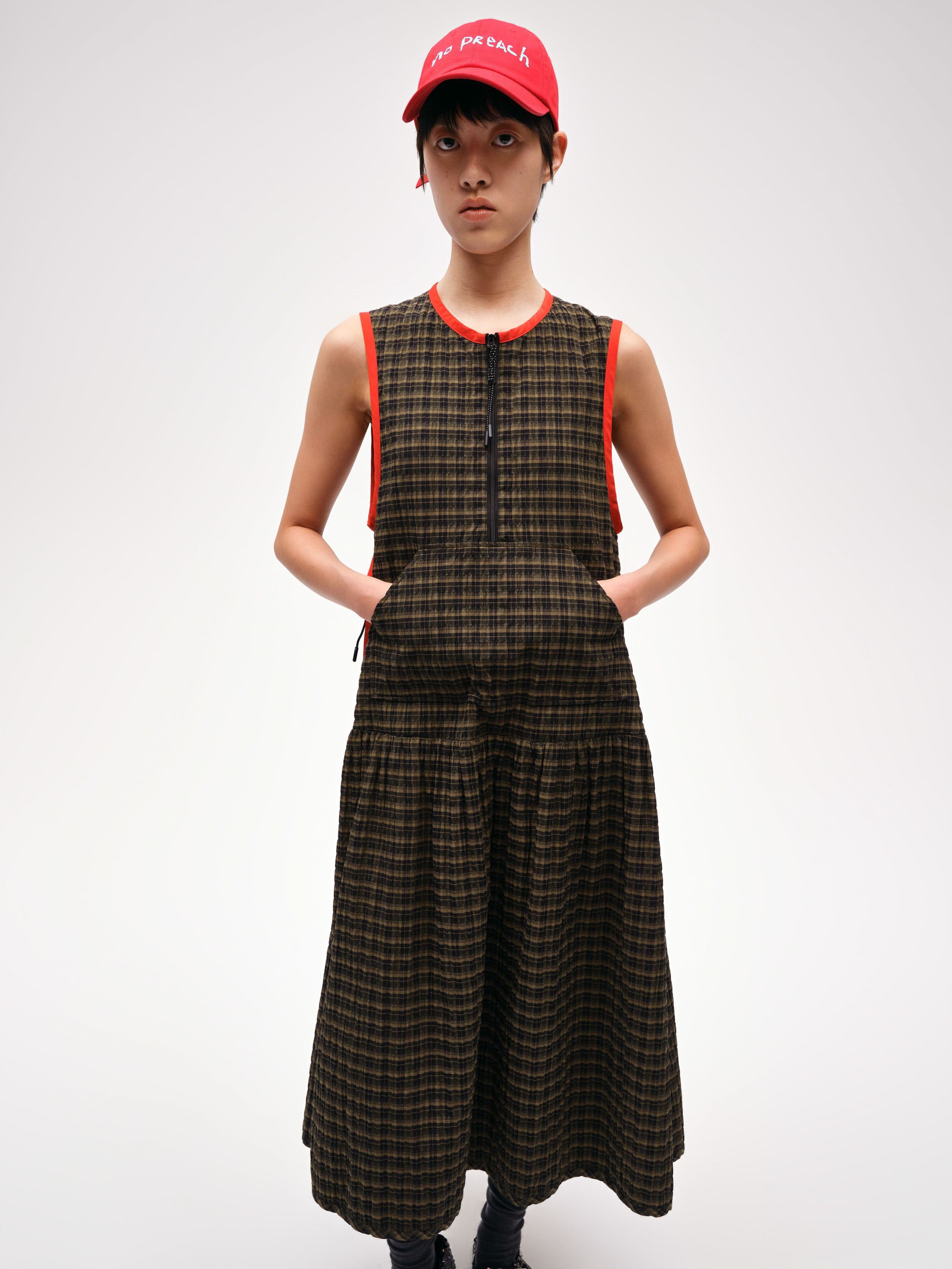 This Sleeveless Plaid Dress features a playful A-line silhouette with a round neckline. It includes a zipper at the neckline with a contrast elastic loop, front patch pockets, and hidden large side pockets for added functionality. The logo embroidery on the side seam adds a subtle brand touch.