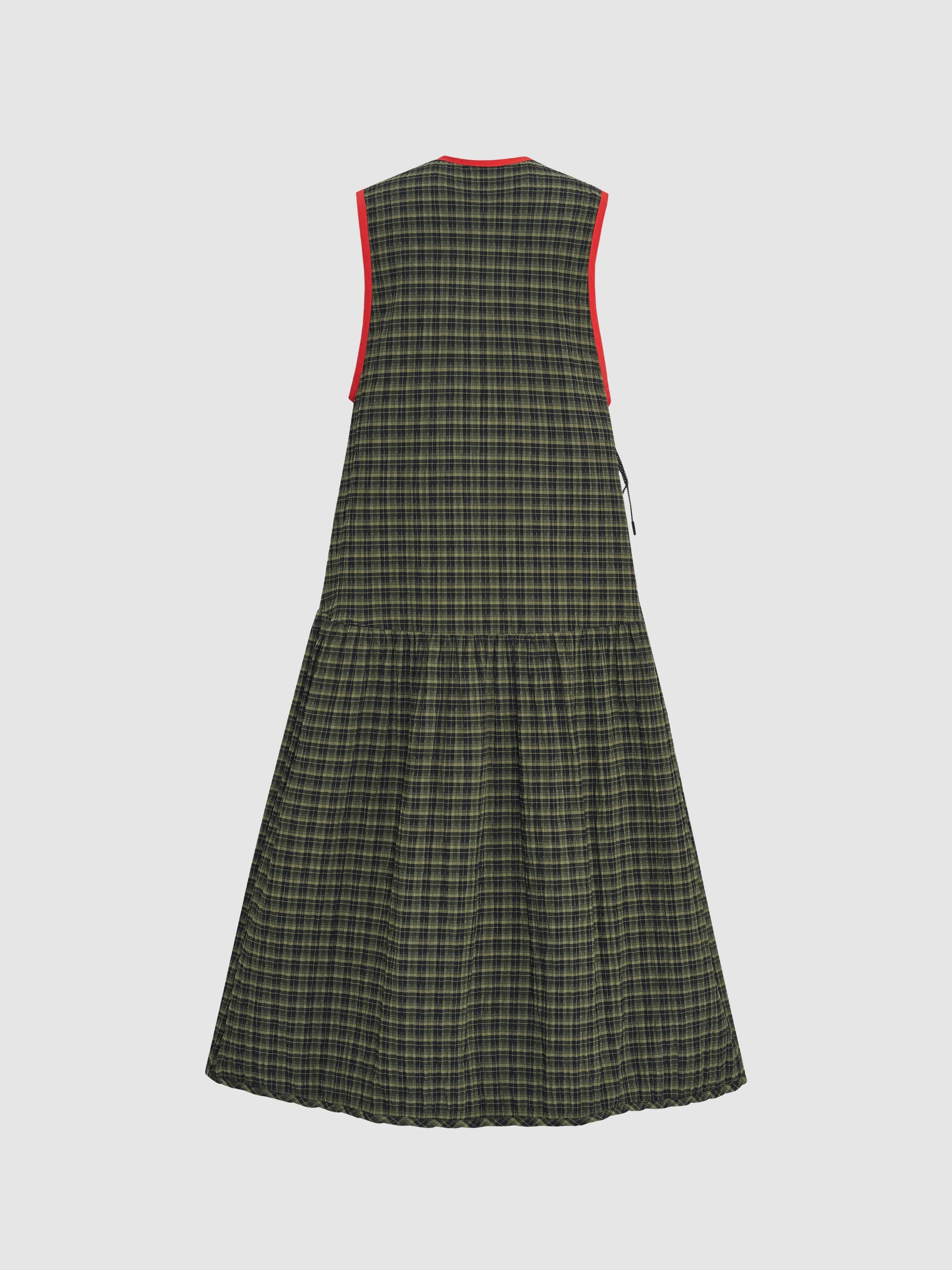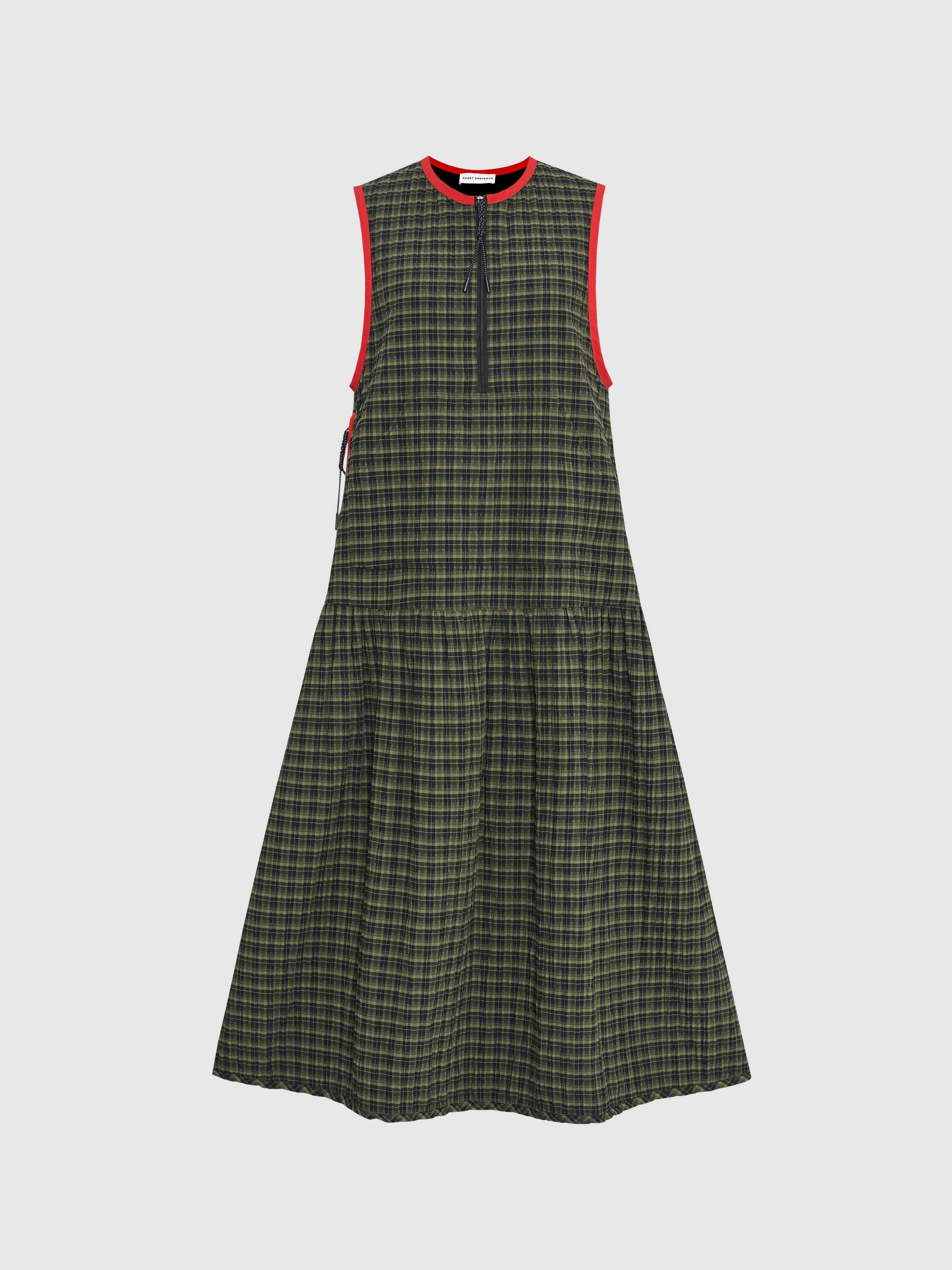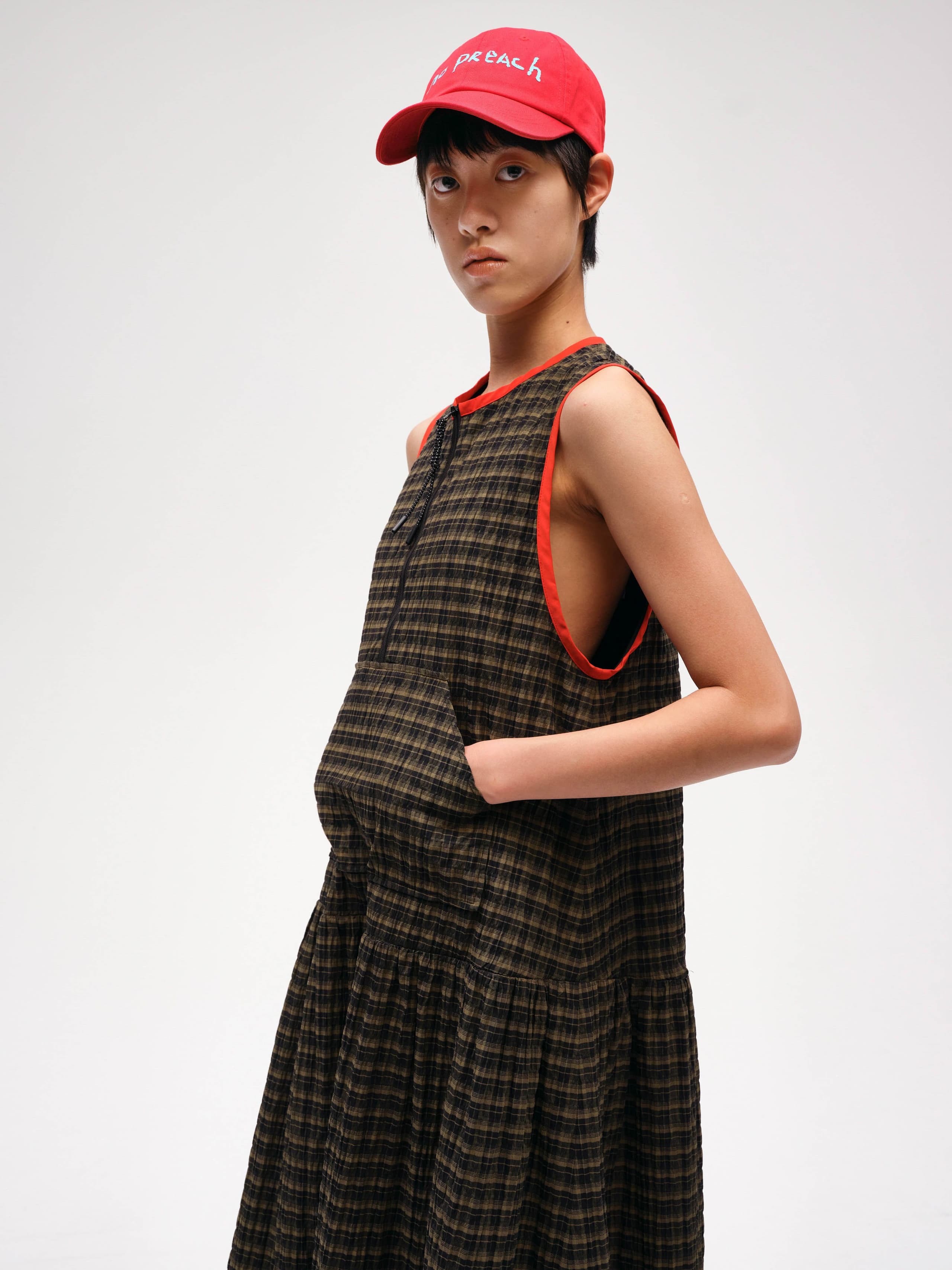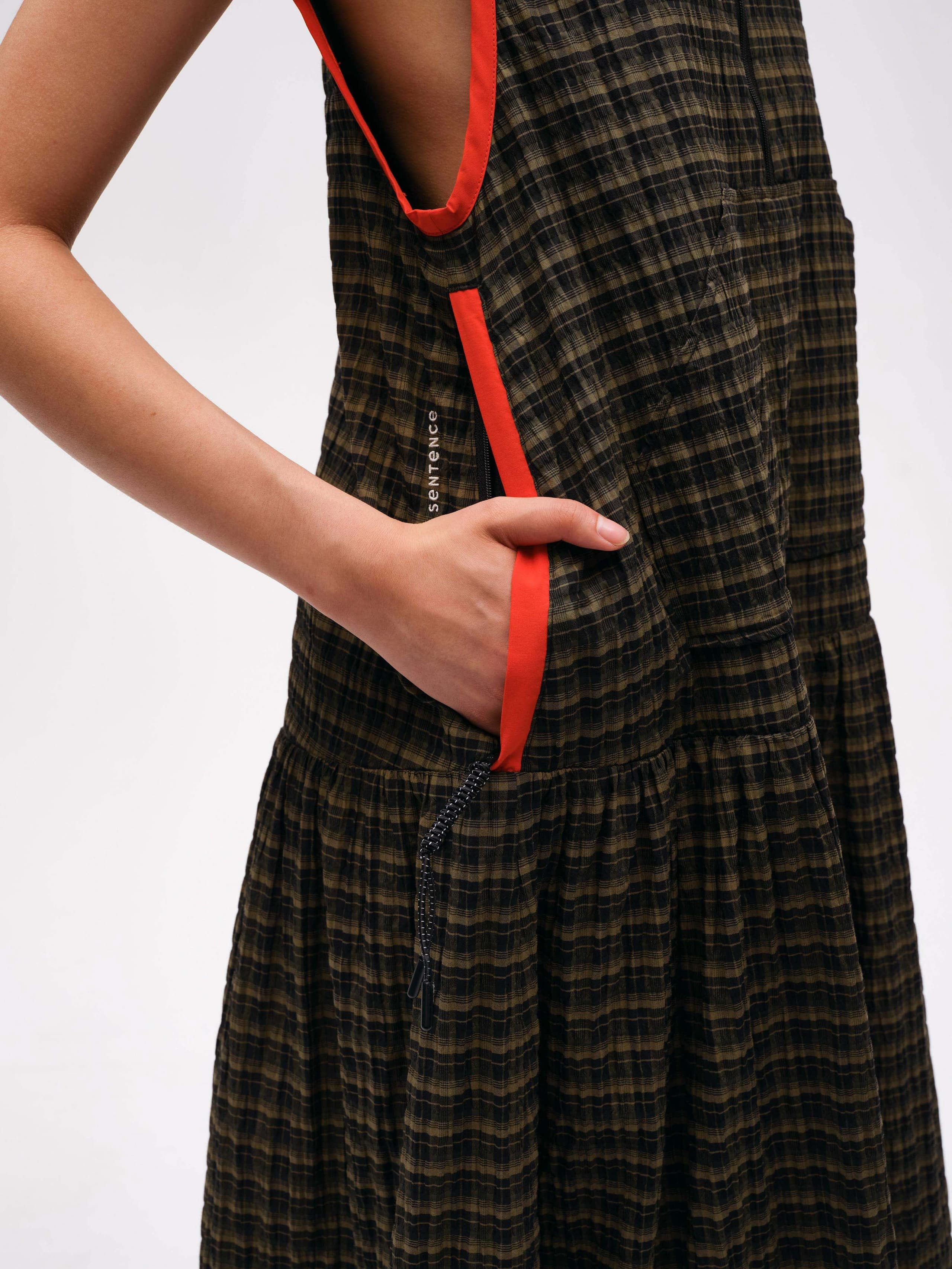 This Sleeveless Plaid Dress features a playful A-line silhouette with a round neckline. It includes a zipper at the neckline with a contrast elastic loop, front patch pockets, and hidden large side pockets for added functionality. The logo embroidery on the side seam adds a subtle brand touch.