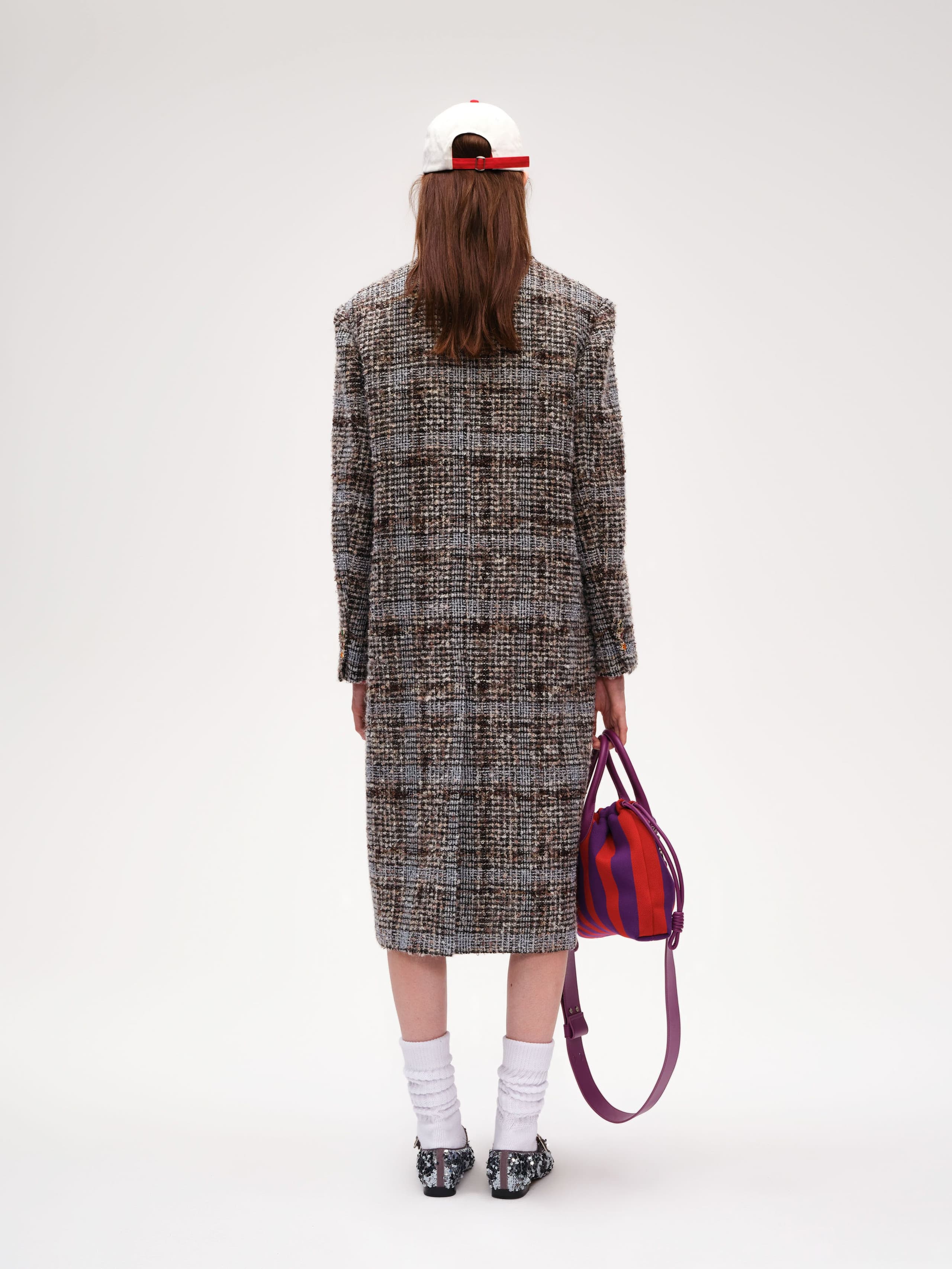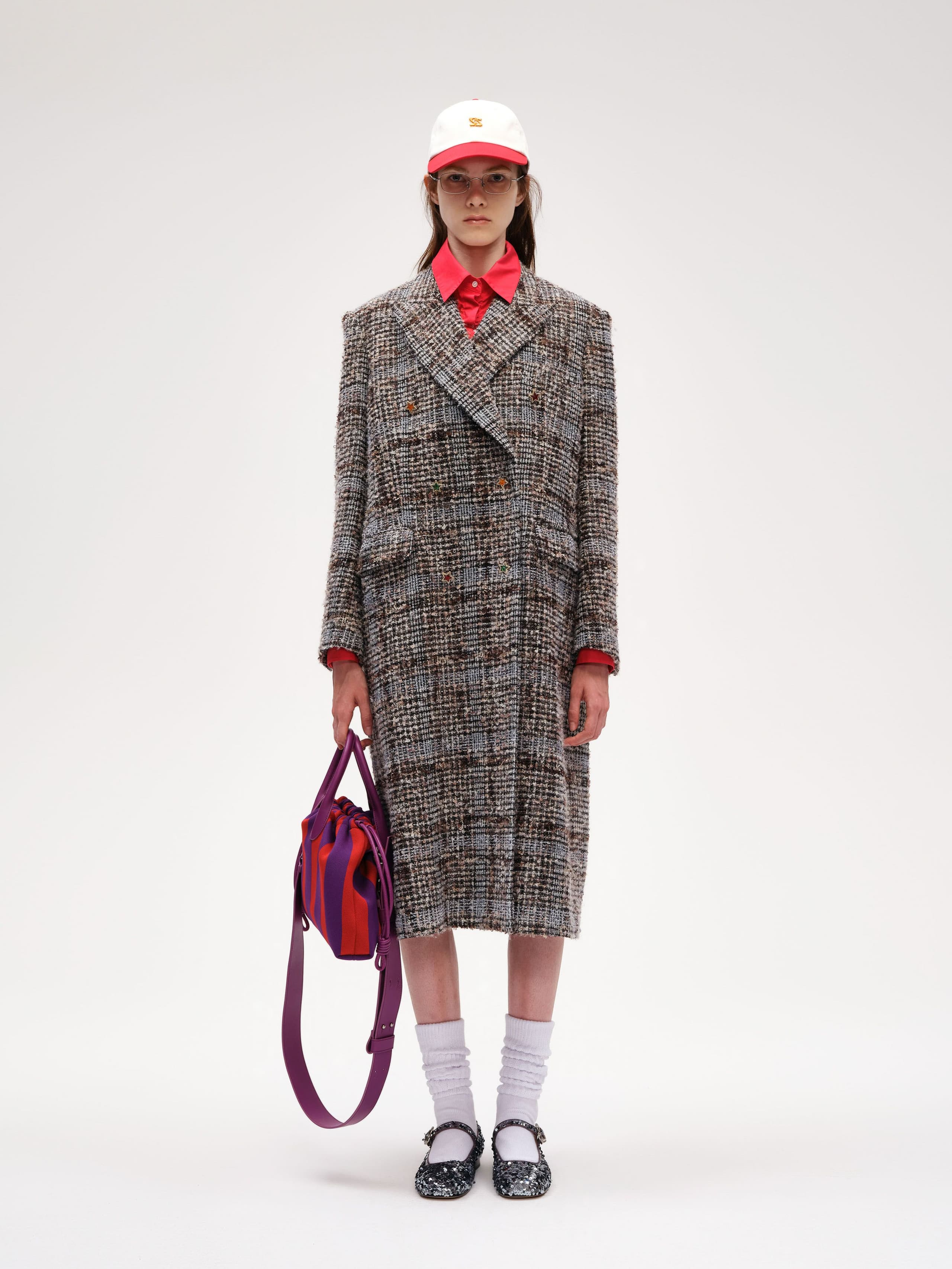 The Star Button Check Tweed Jacket is a stylish blend of classic tweed and modern design. Made from a wool-blend boucle fabric, the jacket features a textured, soft surface that is both durable and comfortable. The relaxed, straight-cut design with padded shoulders offers a flattering fit, while the frayed edges at the collar, cuffs, and hem add a touch of rugged charm. The standout feature is the custom-developed resin star buttons, breaking away from traditional styles and adding a playful, rebellious element.
