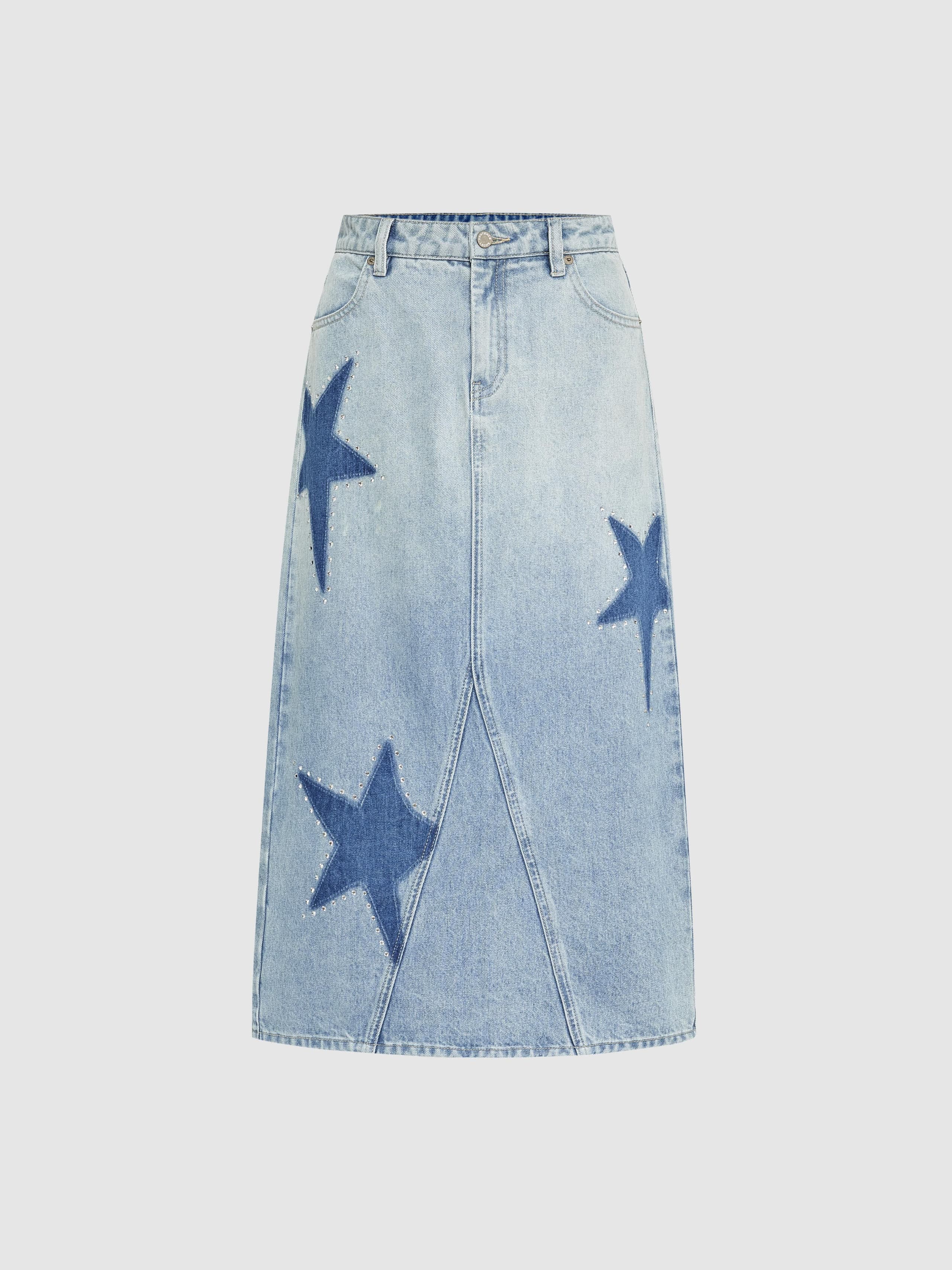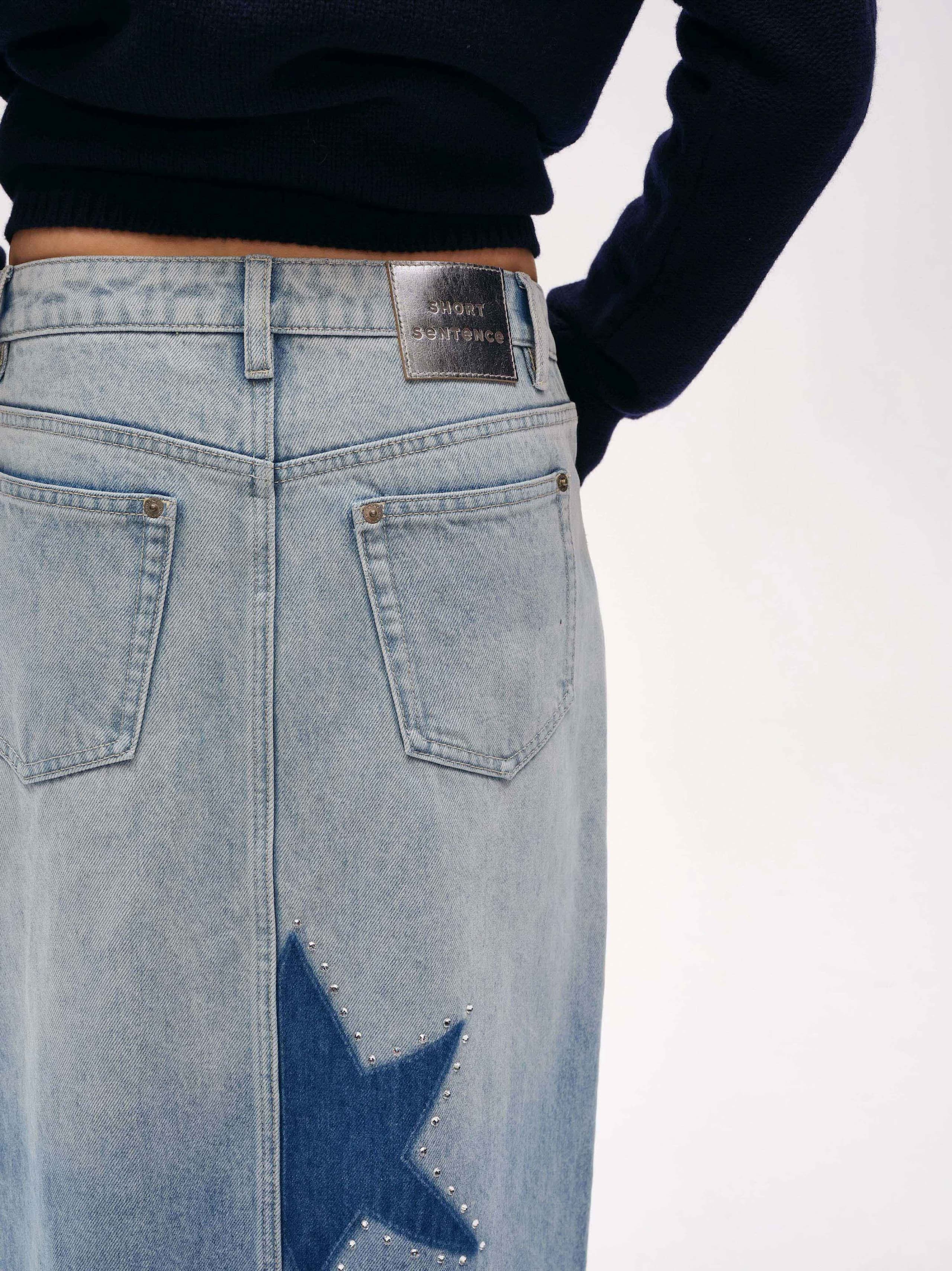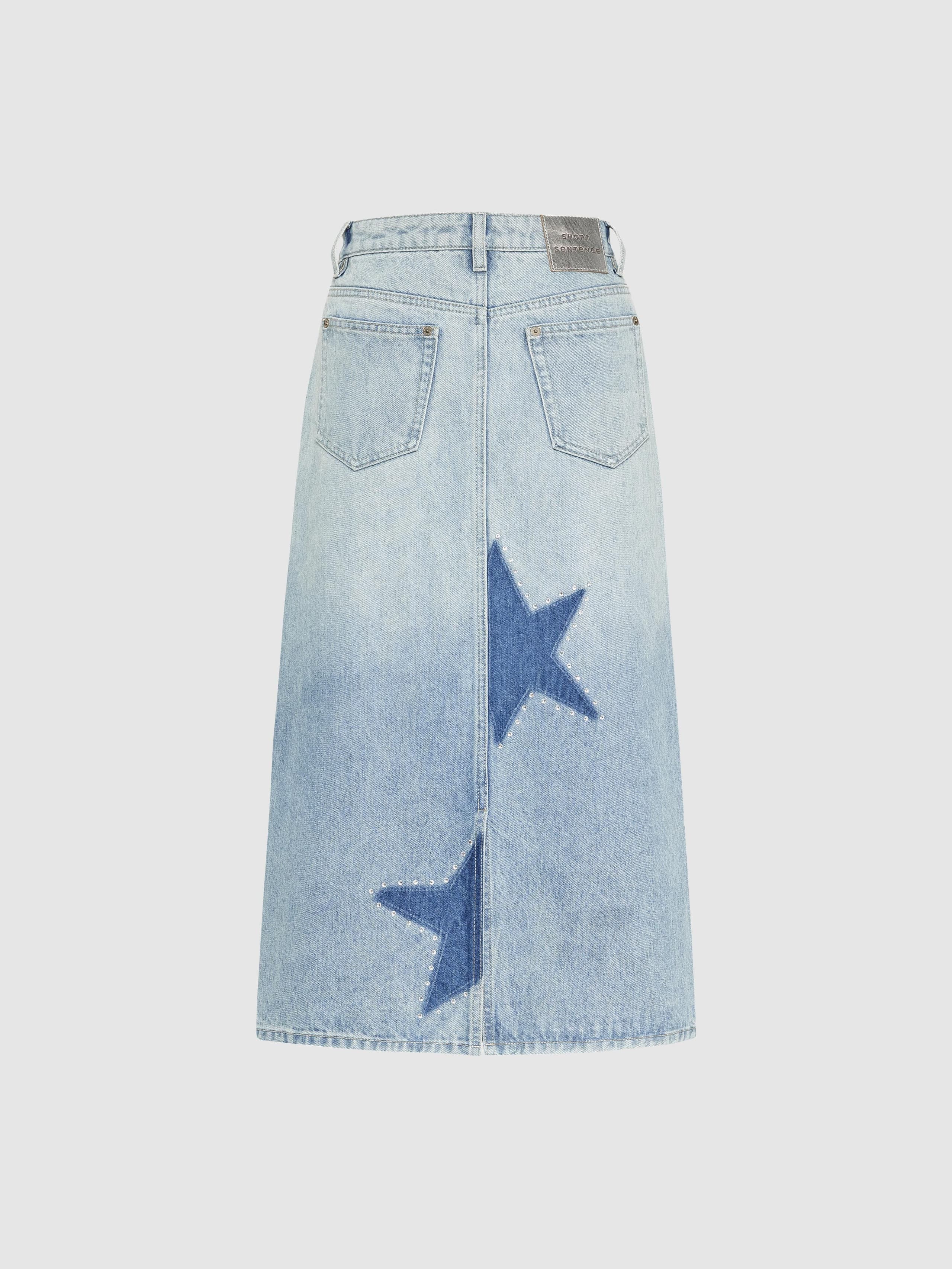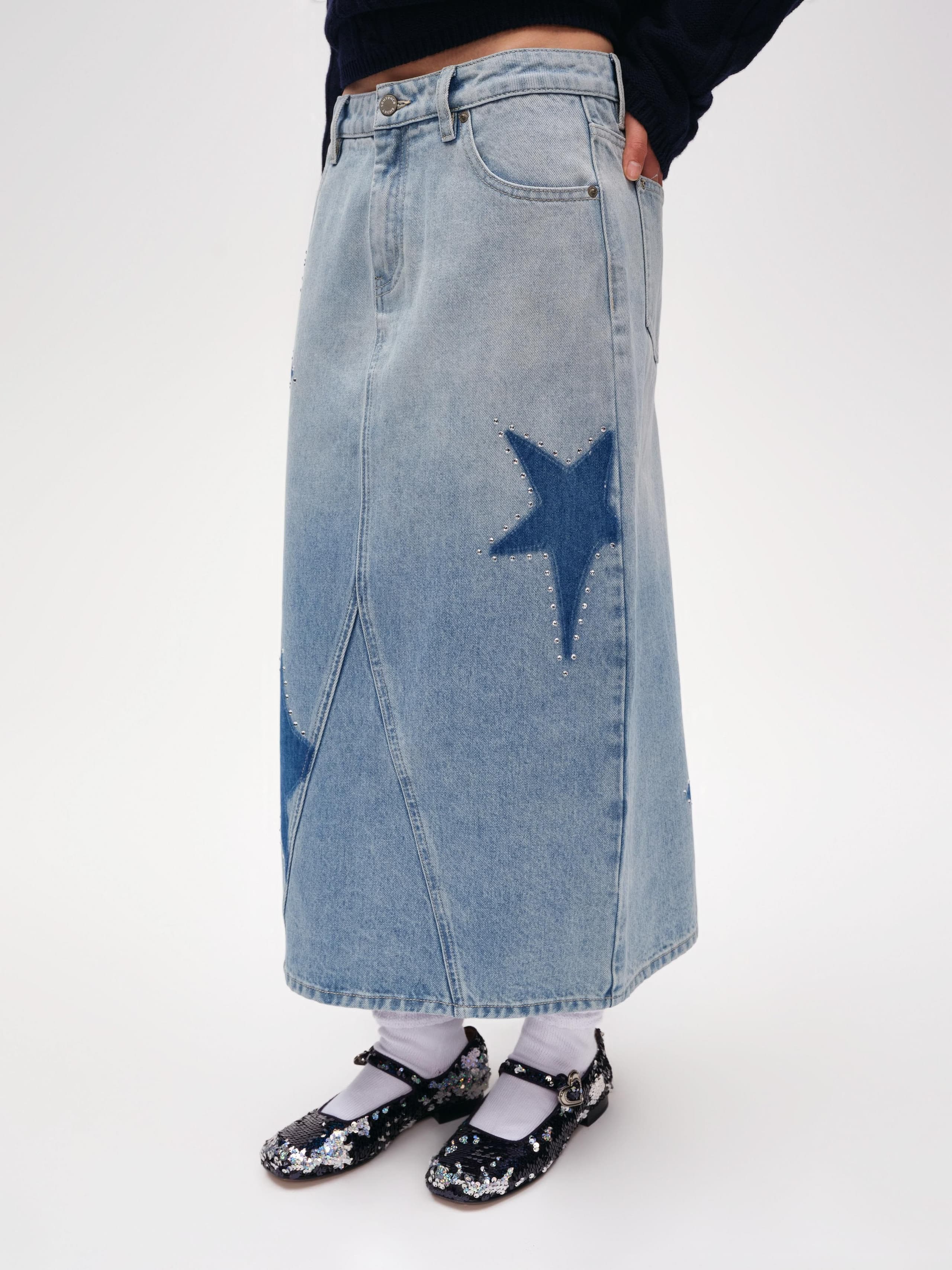 The Star Crystal Low-Rise Long Skirt features a straight, low-rise cut that falls below the knee, crafted from classic blue denim. Adorned with star-shaped shadow rhinestone details, this skirt brings a new texture to denim, capturing a rebellious starry night.