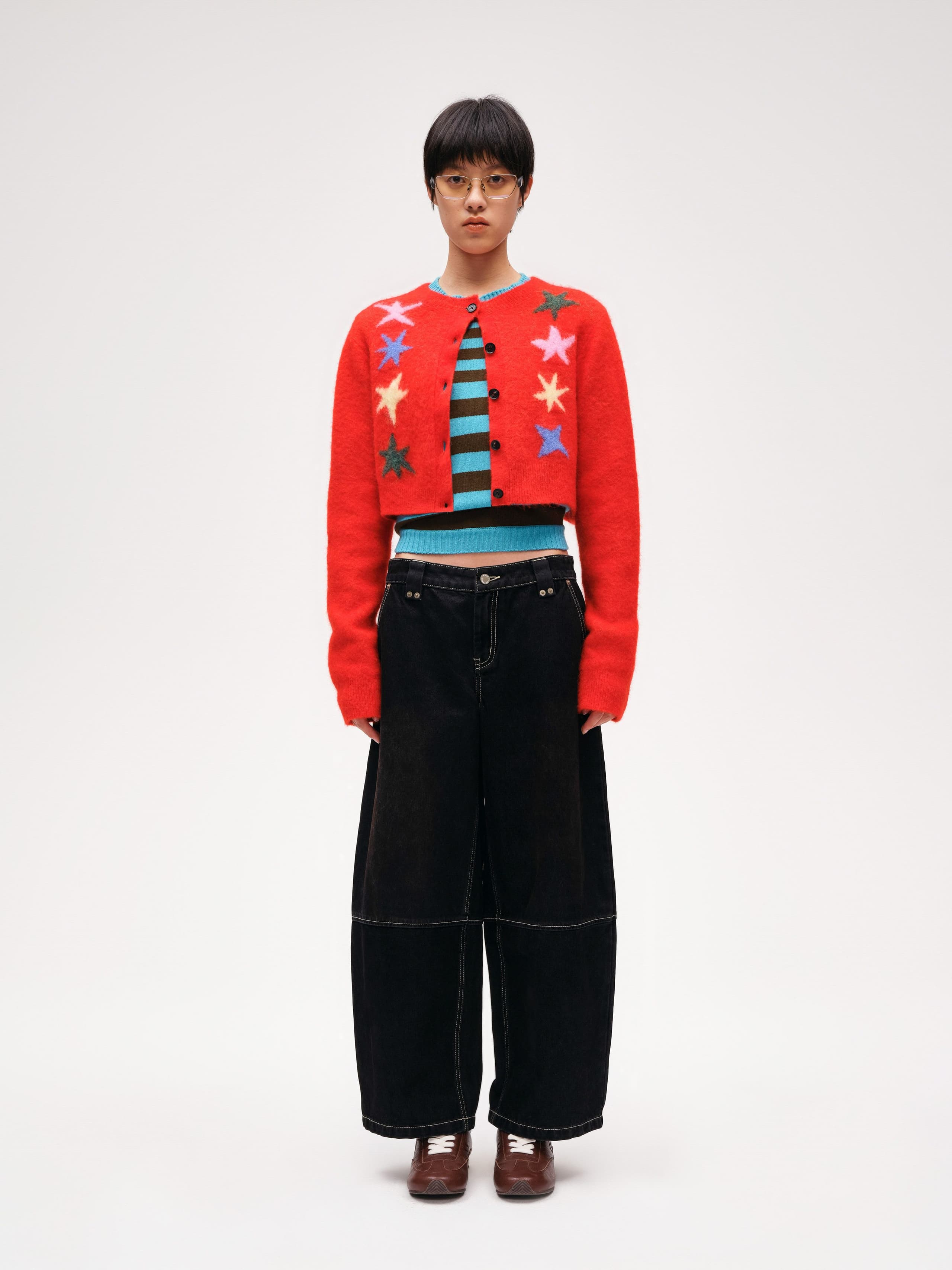 The Star Jacquard Cropped Cardigan brings playful elegance to your wardrobe with its classic cropped design, elevating the waistline for a lively and flattering look. Crafted from a luxurious alpaca wool blend, this cardigan features a colorful star jacquard pattern, adding a touch of whimsy and romance to your outfit.