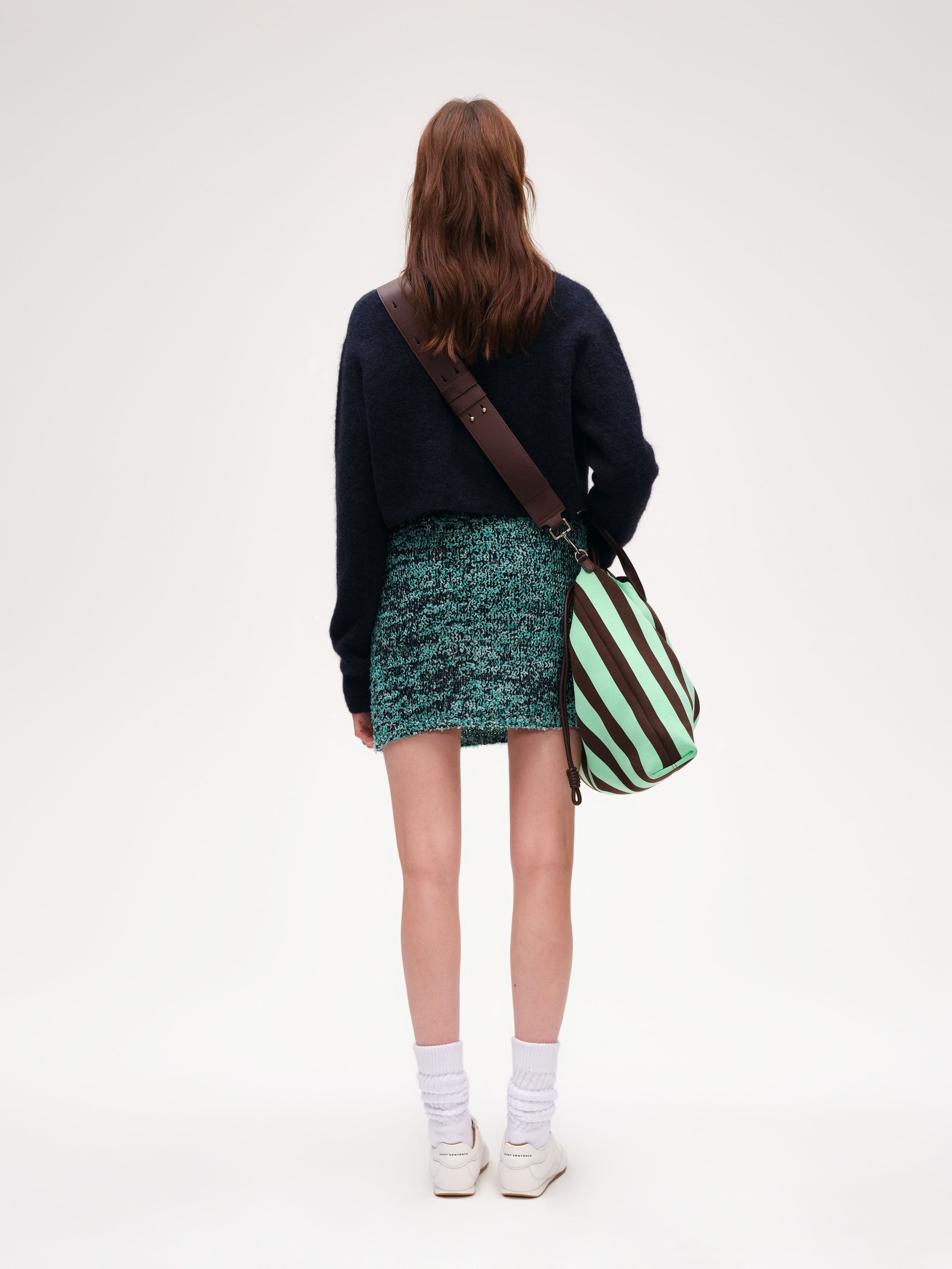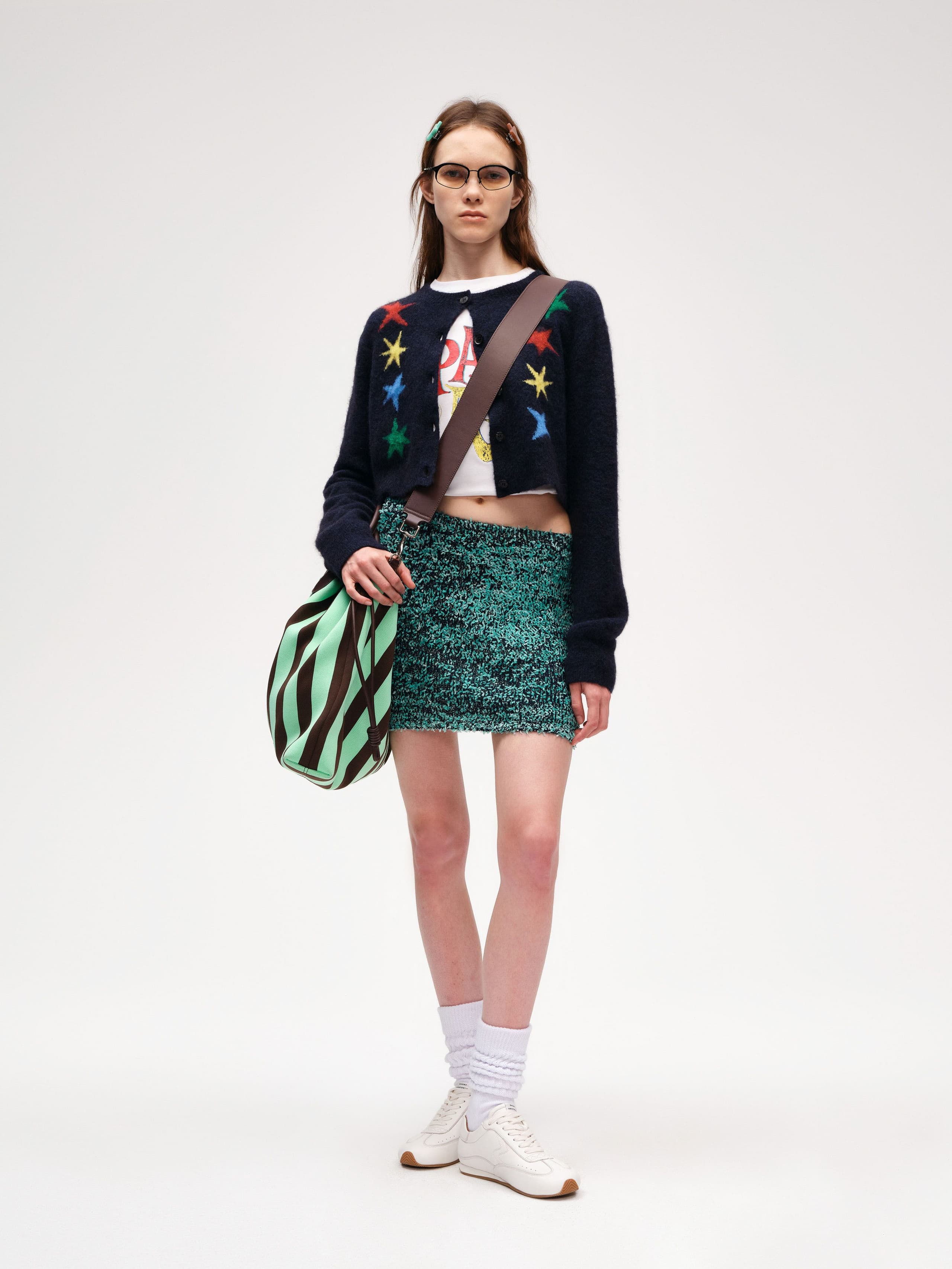 The Star Jacquard Cropped Cardigan brings playful elegance to your wardrobe with its classic cropped design, elevating the waistline for a lively and flattering look. Crafted from a luxurious alpaca wool blend, this cardigan features a colorful star jacquard pattern, adding a touch of whimsy and romance to your outfit.