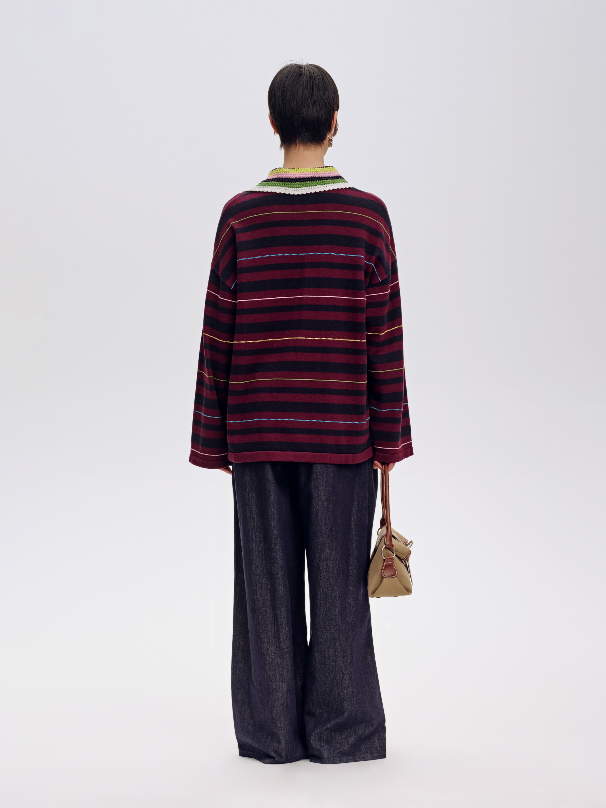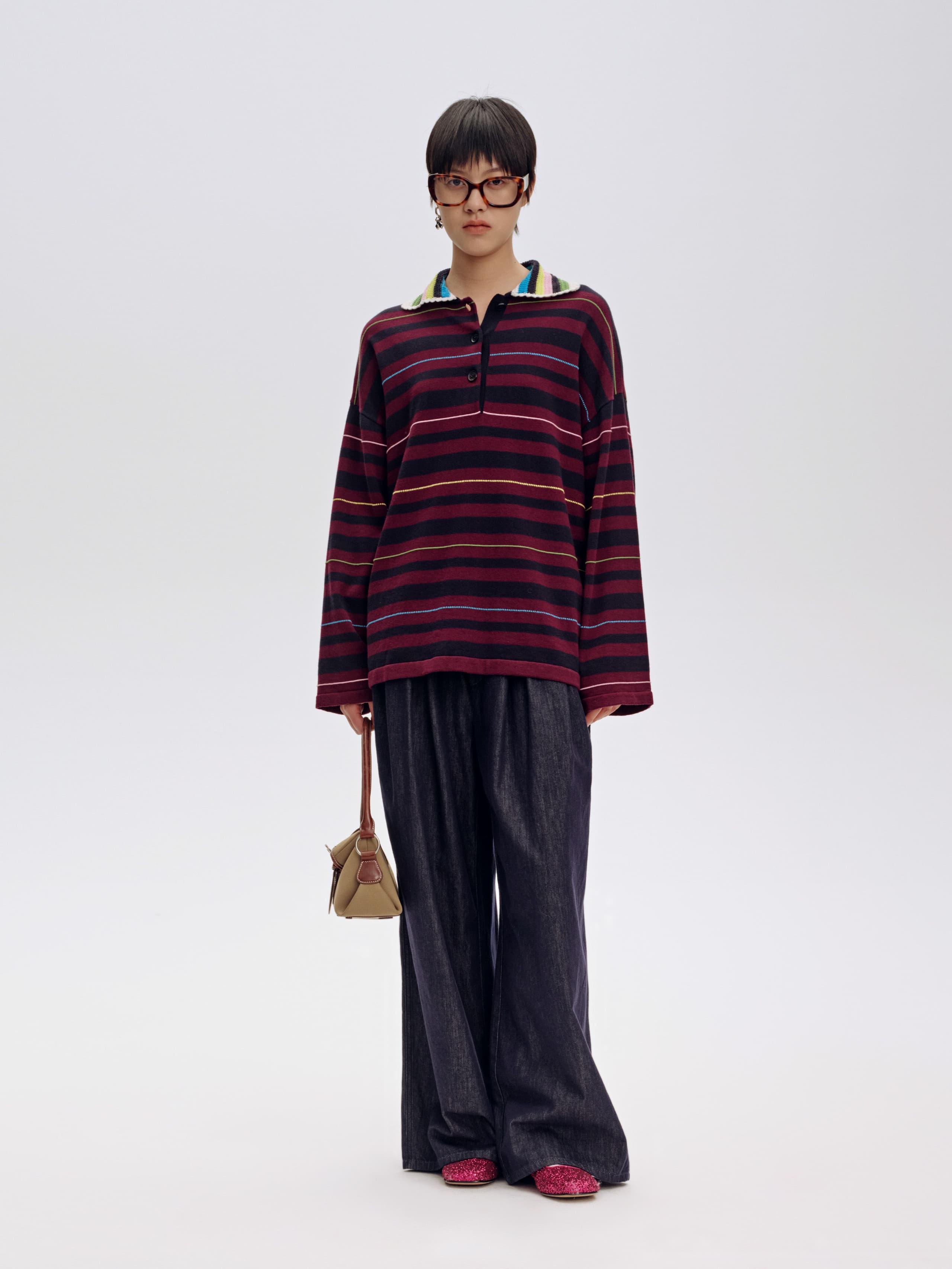 A relaxed, casual polo shirt crafted from pure cotton for all-day comfort. The wide horizontal stripes are paired with a contrasting textured knit collar for a playful yet polished look. Button placket at the front adds a classic touch to this versatile layering piece.