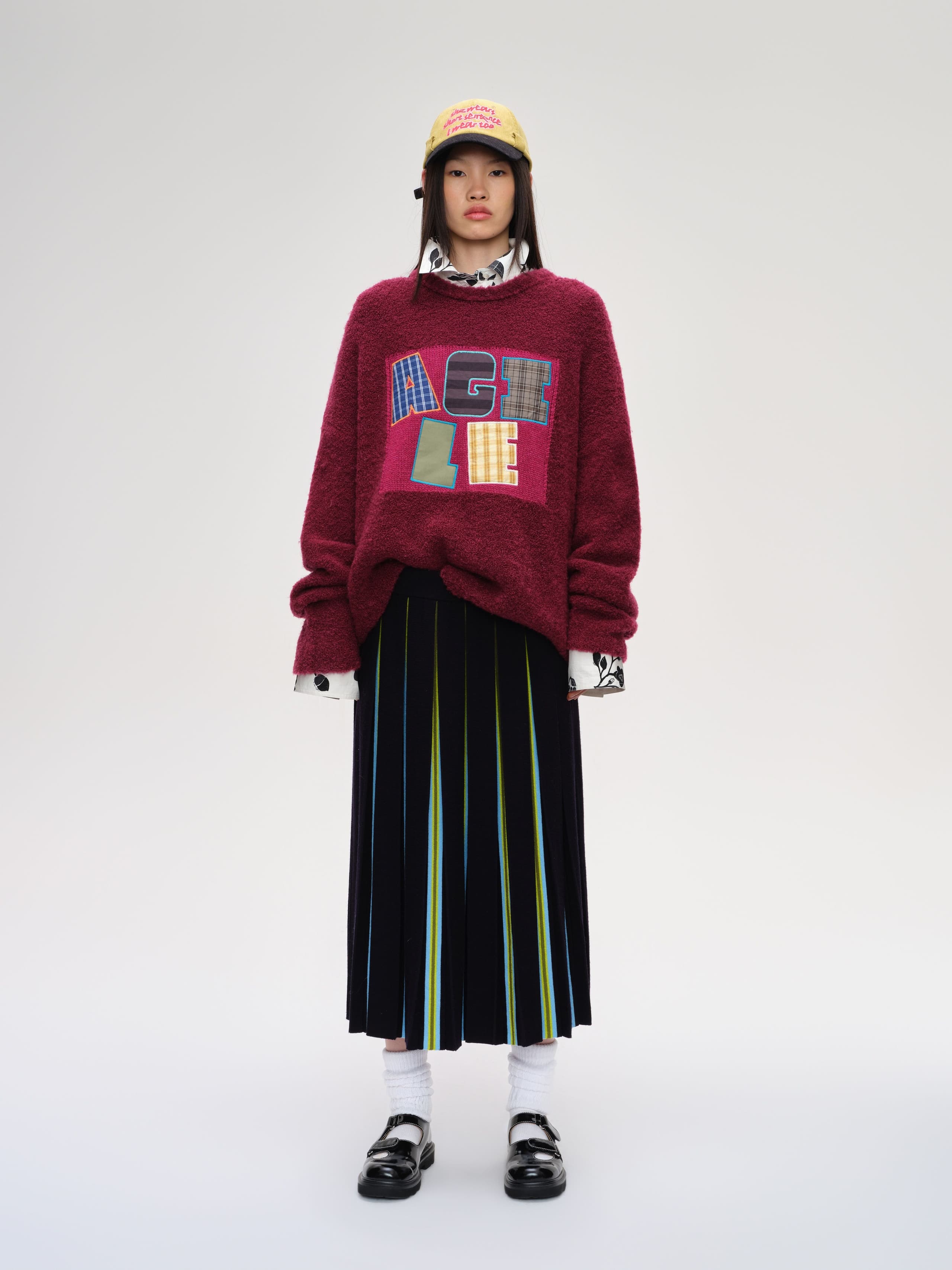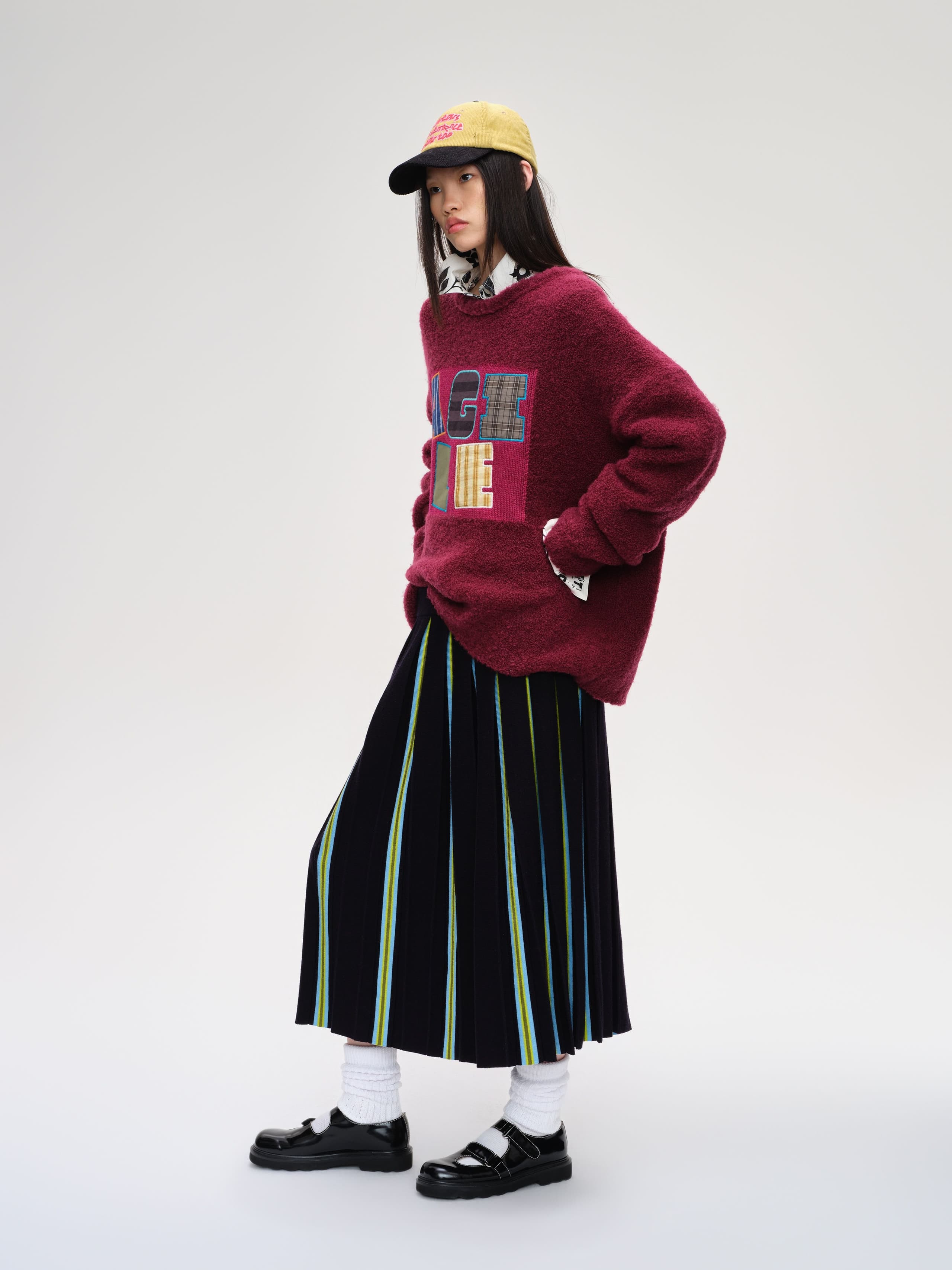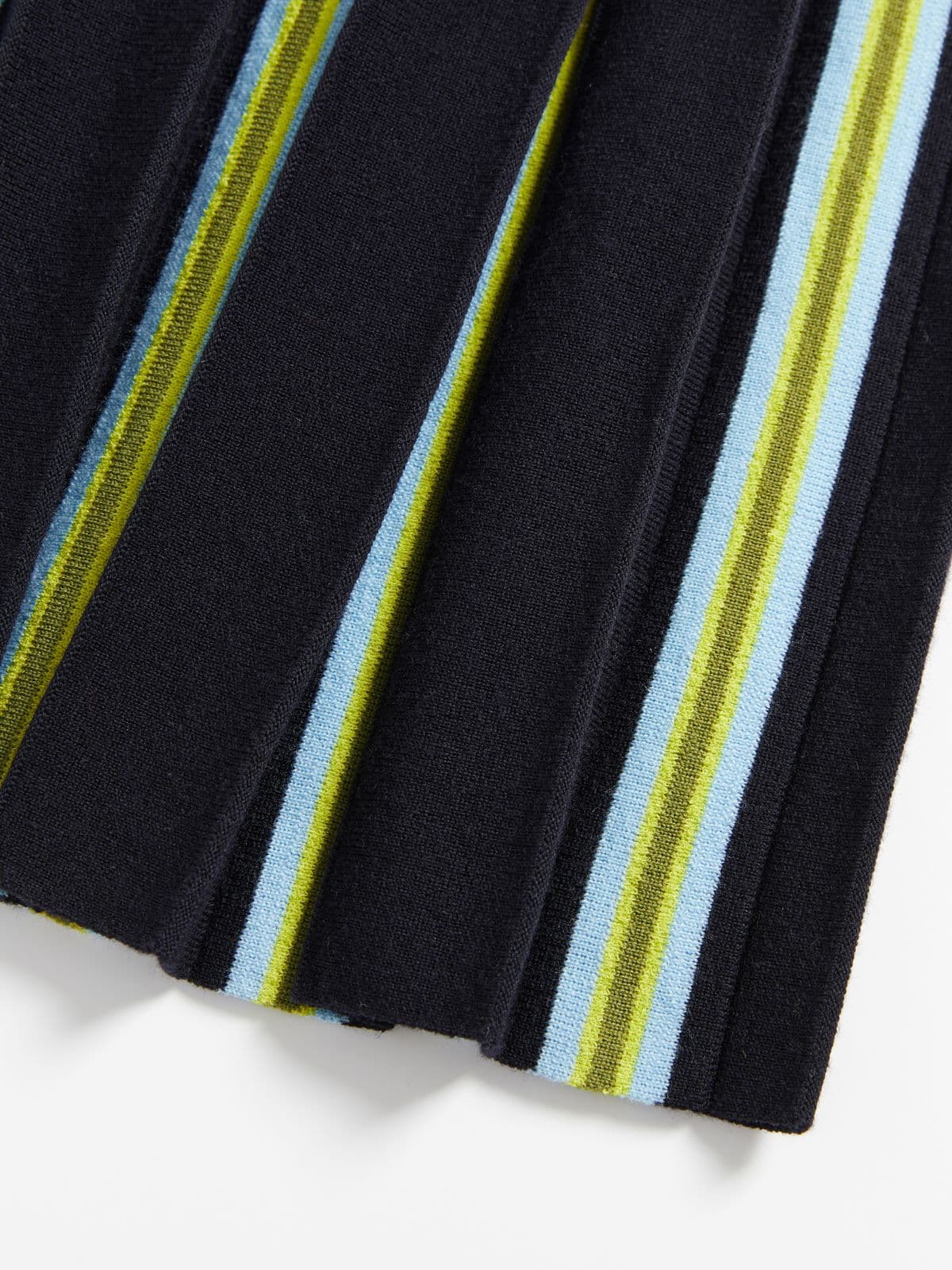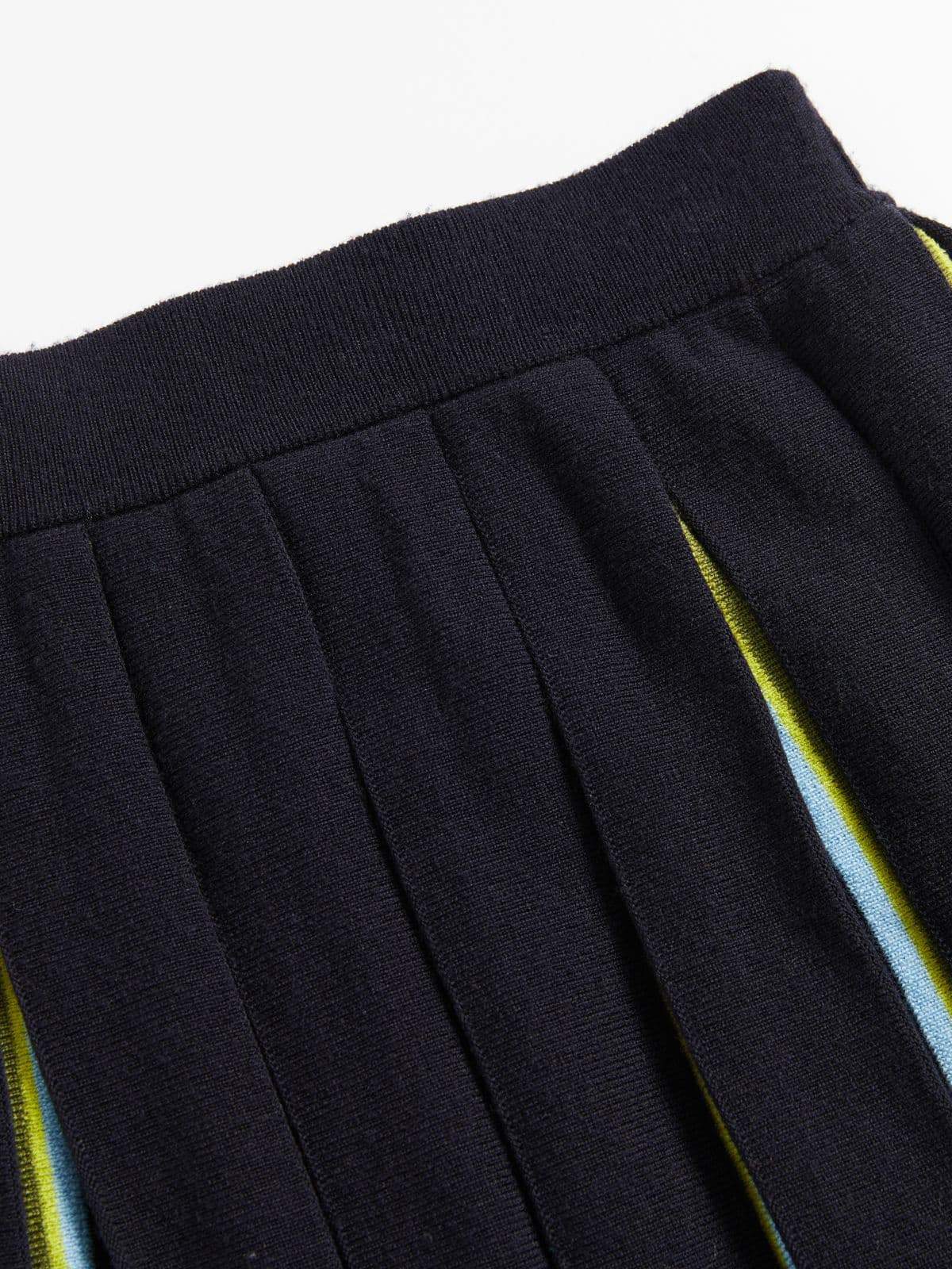 A playful yet refined pleated skirt knitted from a mix of merino wool and specialty yarns for rich texture and structure. Colorful stripes are hidden within the pleats, revealing movement and vibrancy as you walk. The fabric combines softness, breathability, and resilience, ensuring both comfort and style.