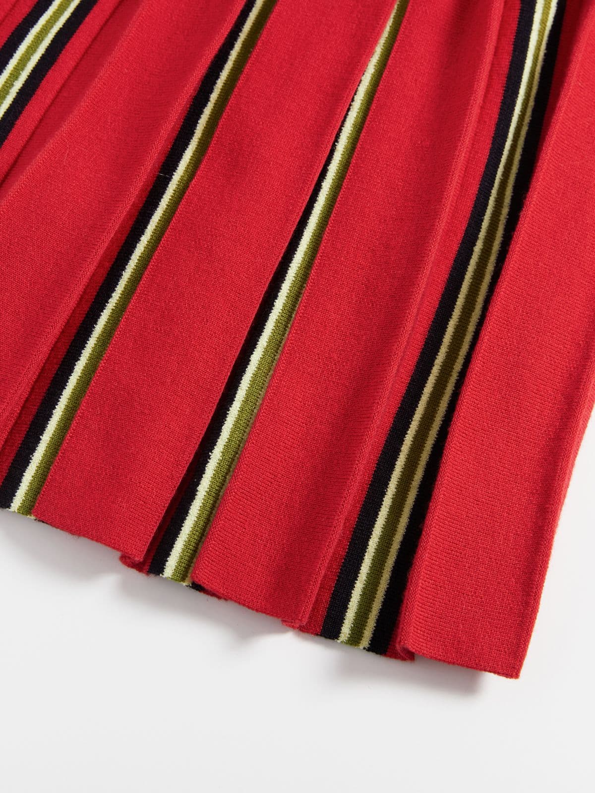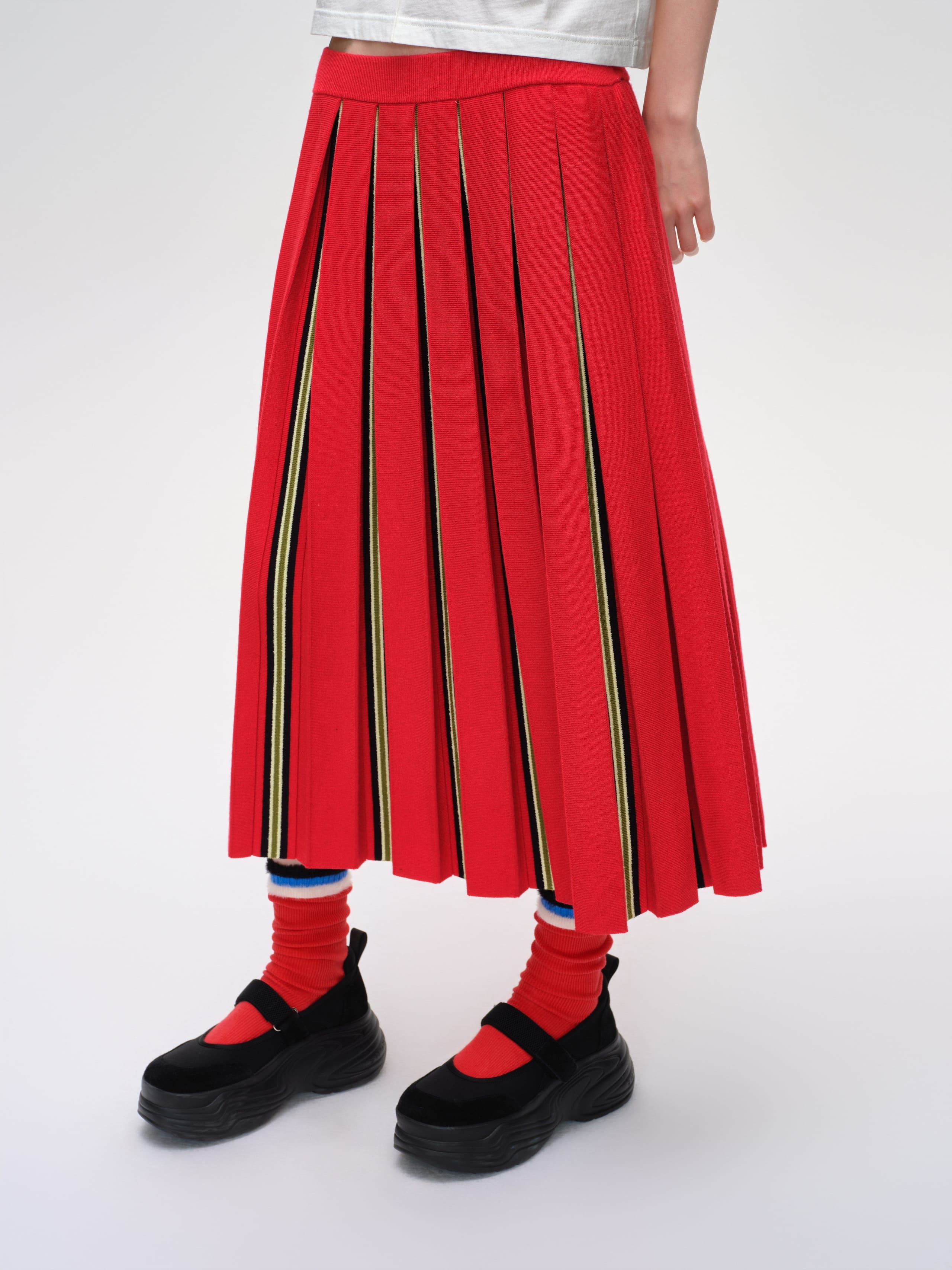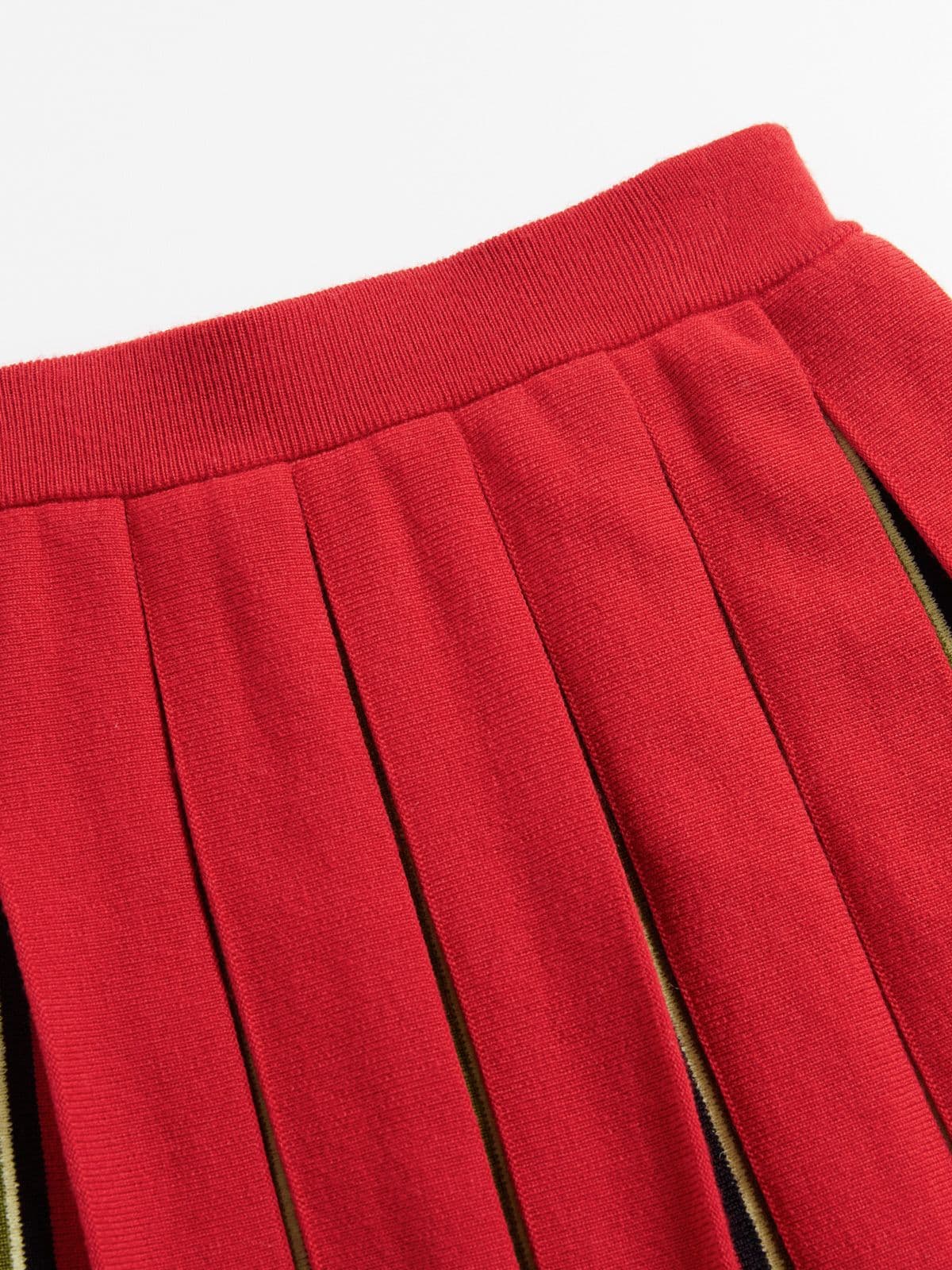 A playful yet refined pleated skirt knitted from a mix of merino wool and specialty yarns for rich texture and structure. Colorful stripes are hidden within the pleats, revealing movement and vibrancy as you walk. The fabric combines softness, breathability, and resilience, ensuring both comfort and style.