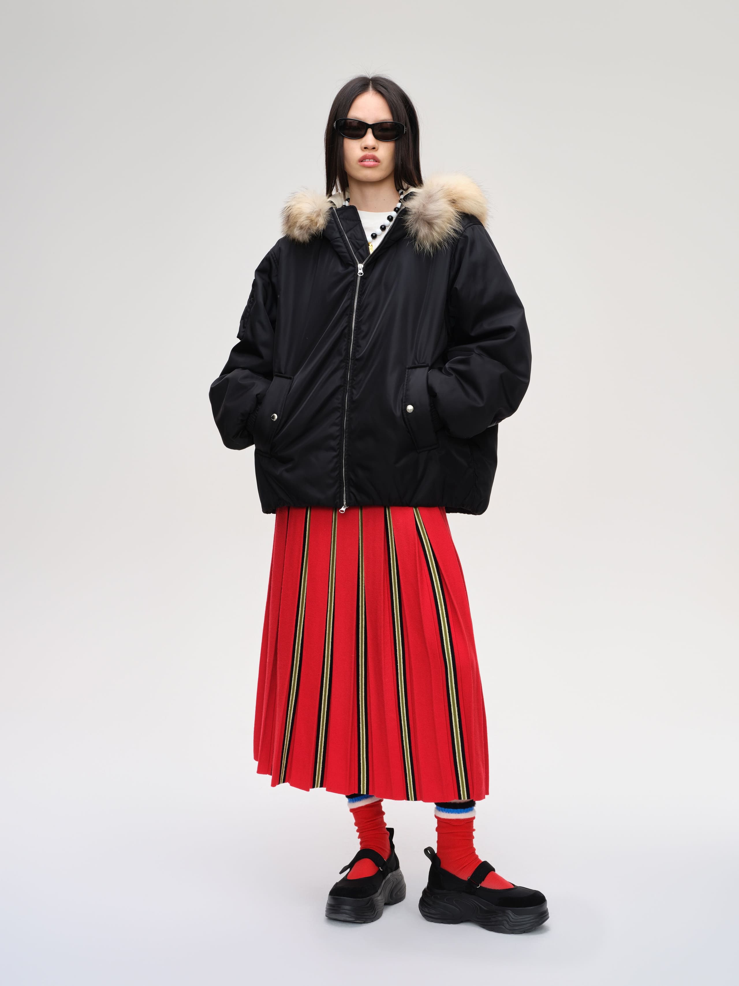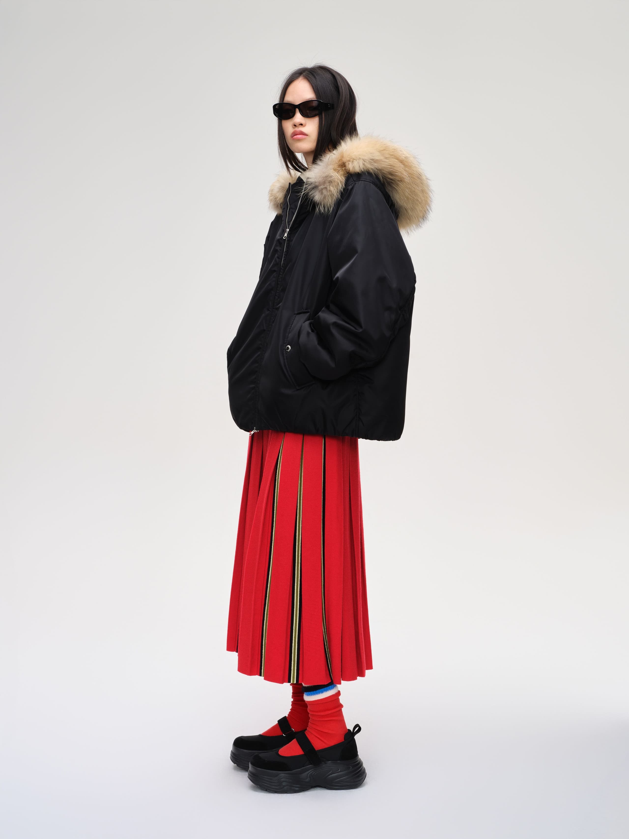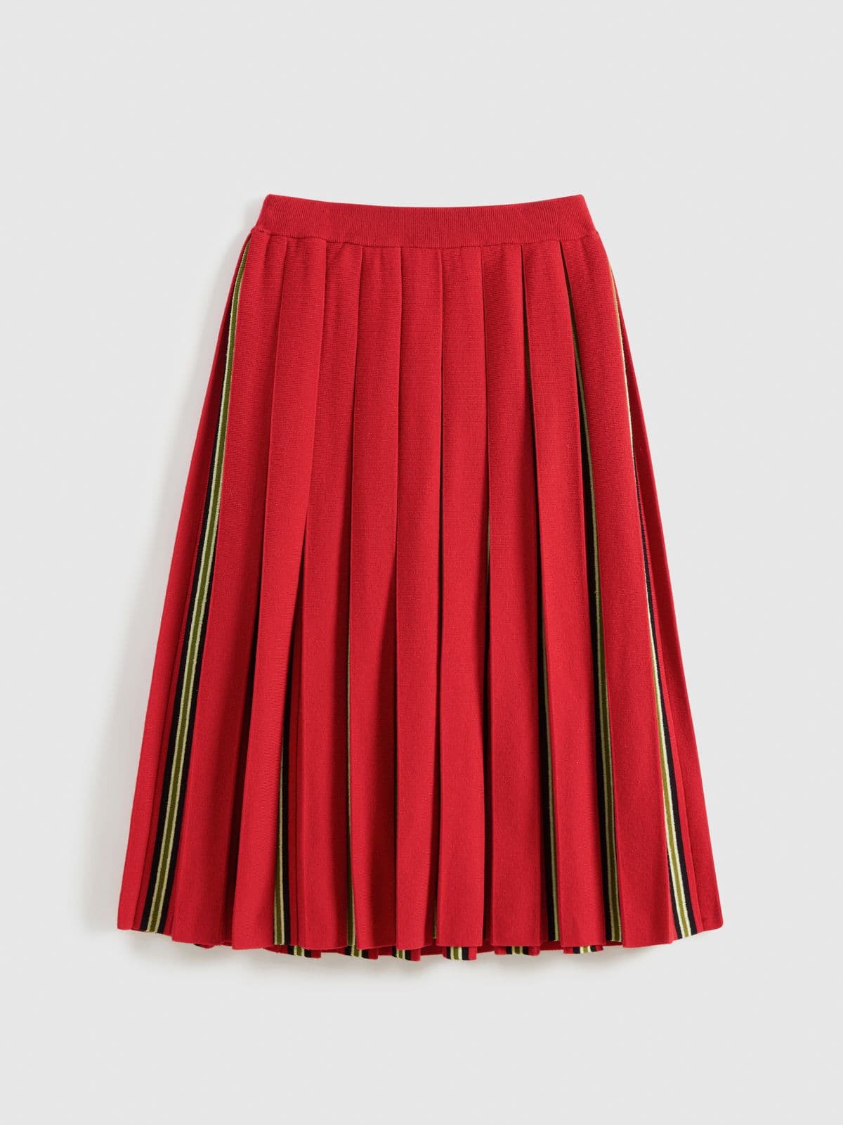 A playful yet refined pleated skirt knitted from a mix of merino wool and specialty yarns for rich texture and structure. Colorful stripes are hidden within the pleats, revealing movement and vibrancy as you walk. The fabric combines softness, breathability, and resilience, ensuring both comfort and style.
