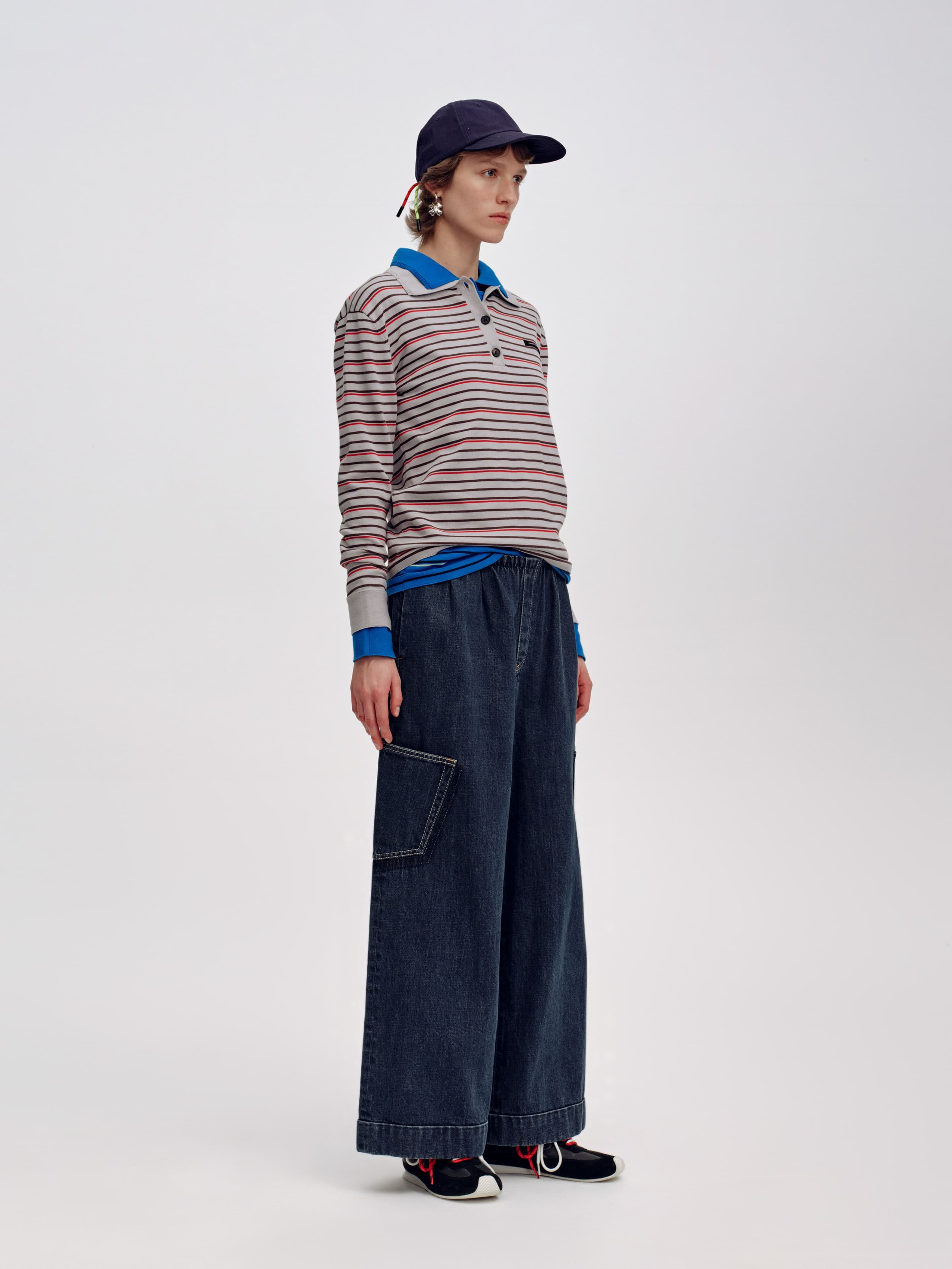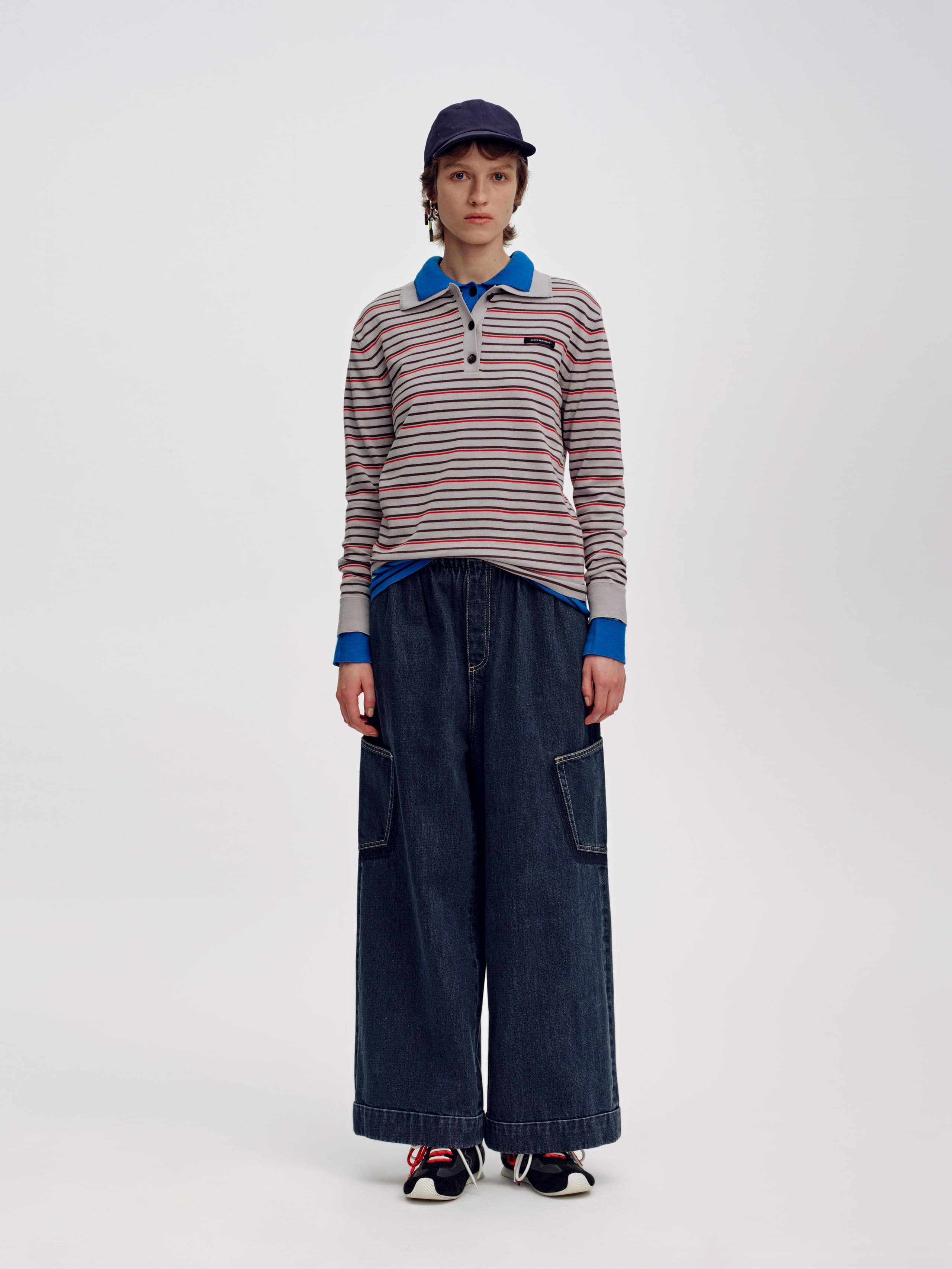 The Striped Short-Sleeve Sweater is crafted from 100% cotton yarn, offering a soft and breathable texture with a structured feel. Featuring contrast fine stripes and a small rubberized logo patch on the chest, this sweater adds playful detail to a classic design. A functional side placket on the hem enhances versatility and ease of styling, making it perfect for everyday wear.