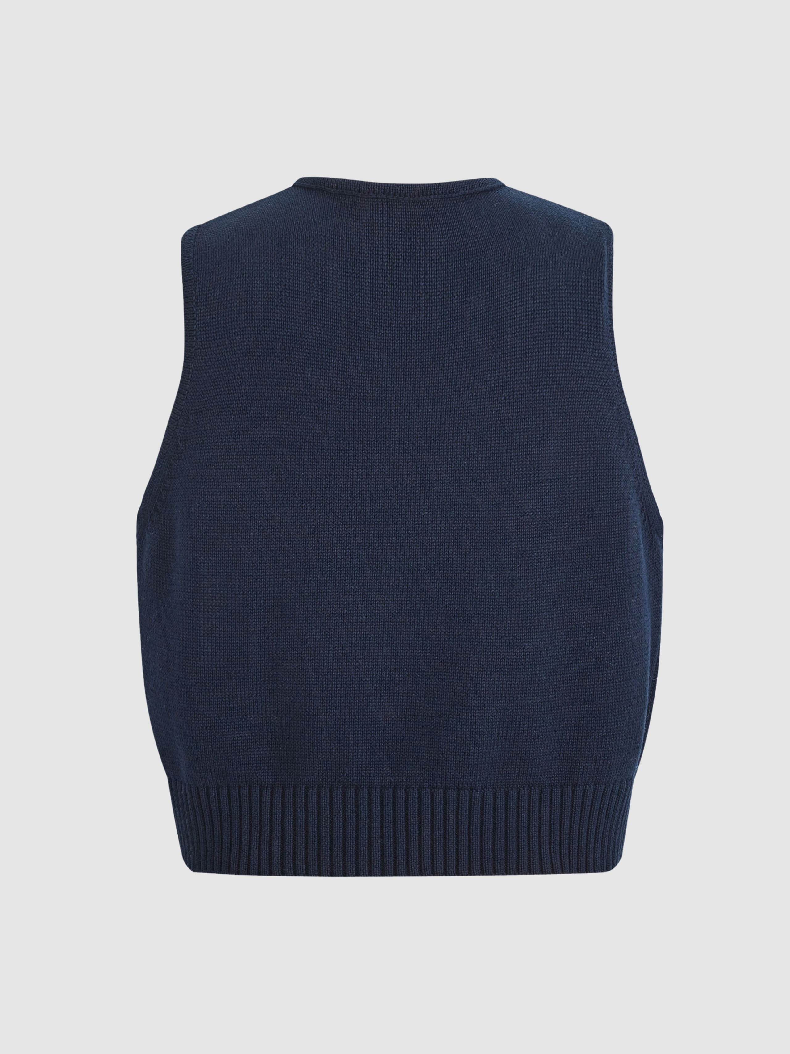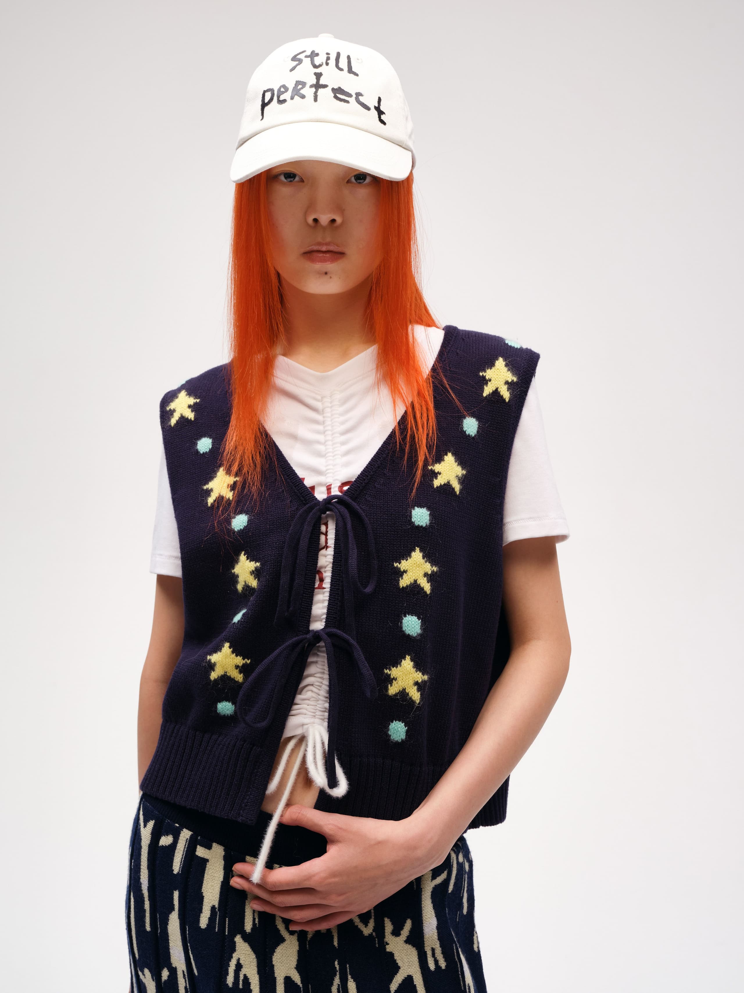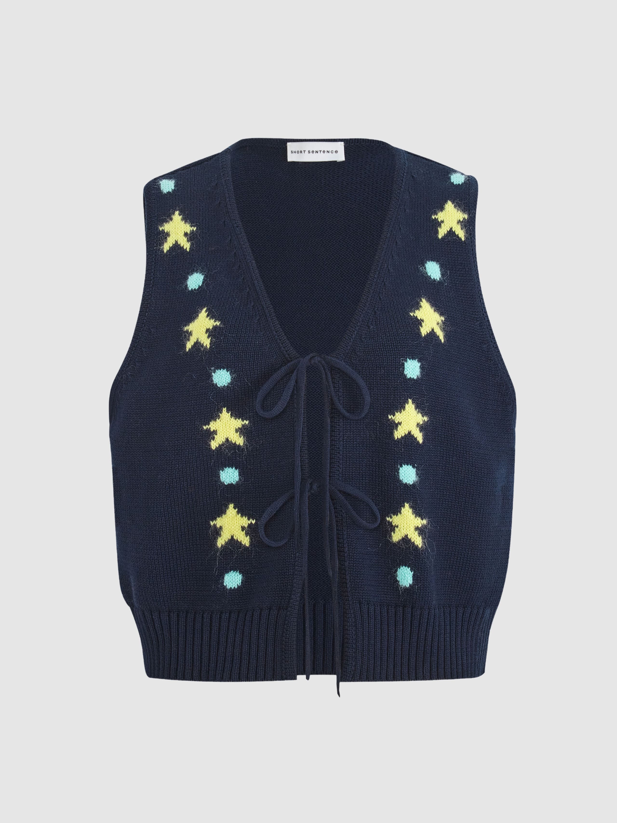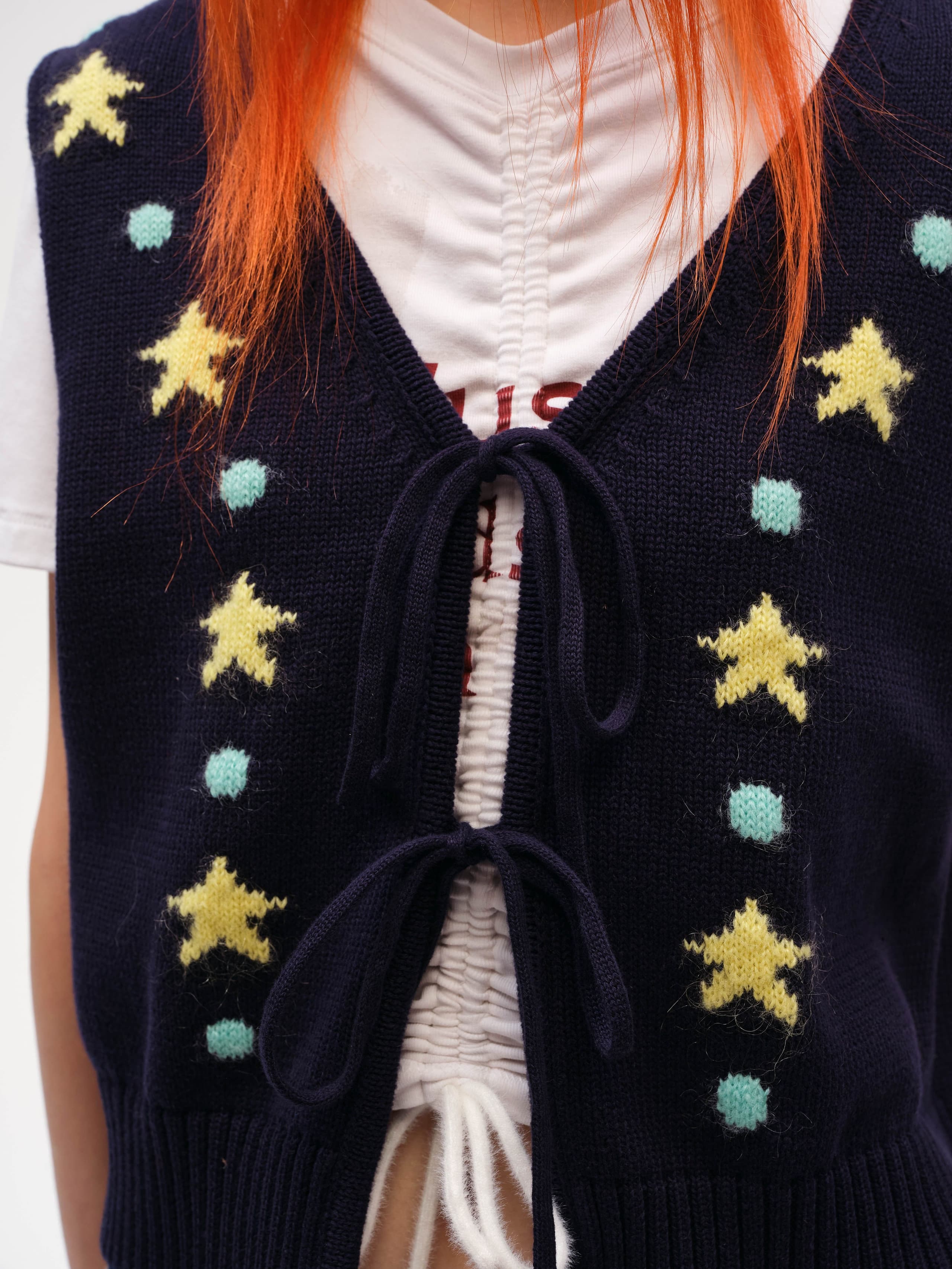 This Tie-front Jacquard Vest features a playful star pattern and a chic front tie closure. Made from soft cotton, it offers a comfortable, skin-friendly touch with a hint of whimsy. This cropped cardigan vest adds a lively and playful vibe to your wardrobe.