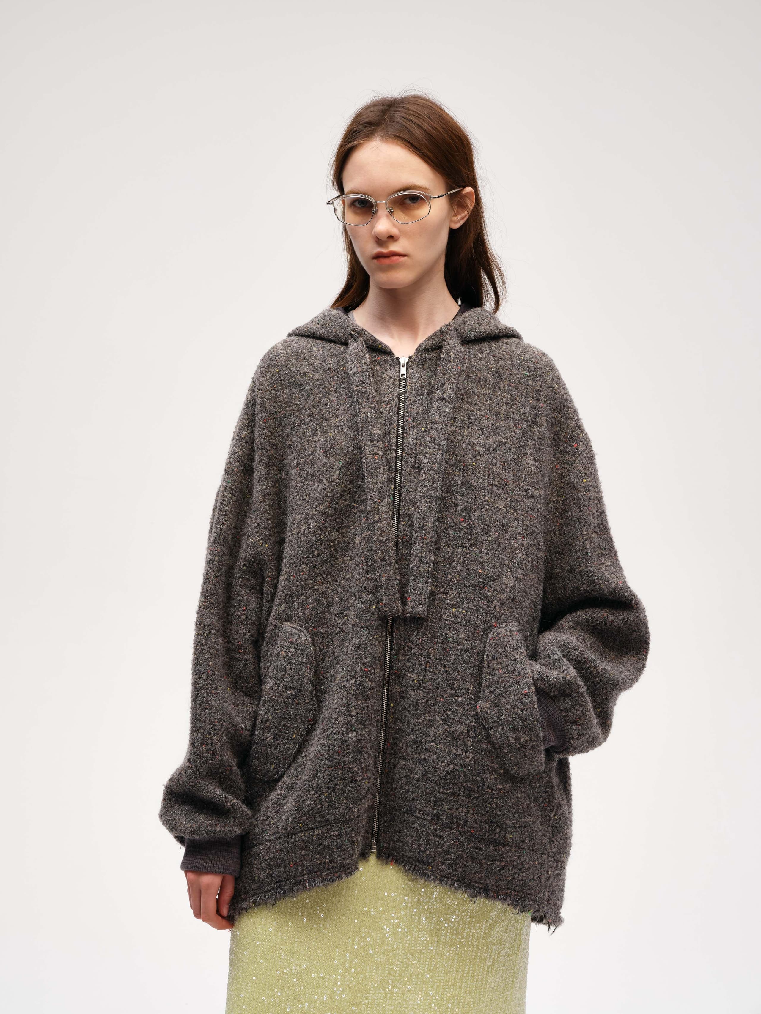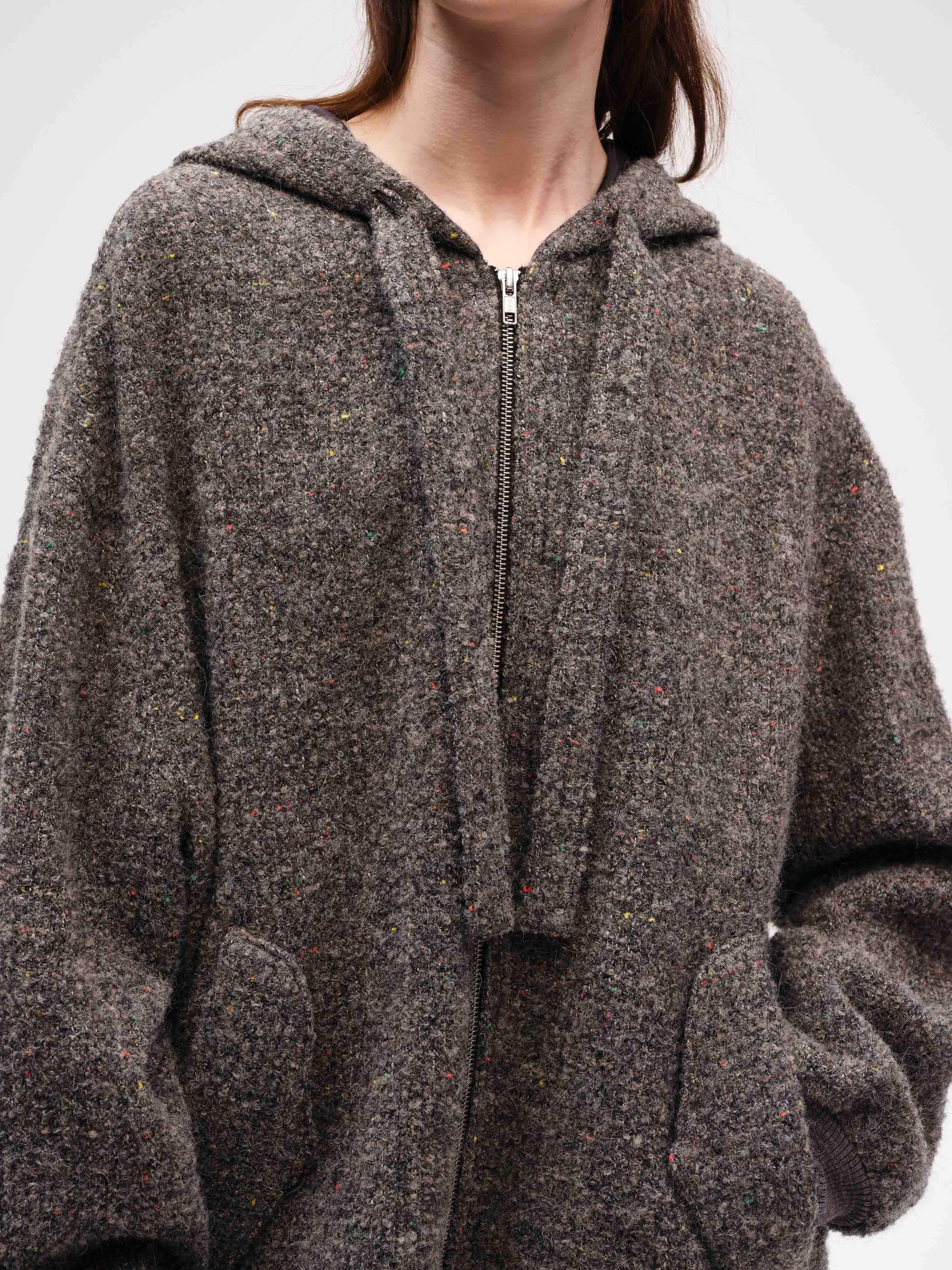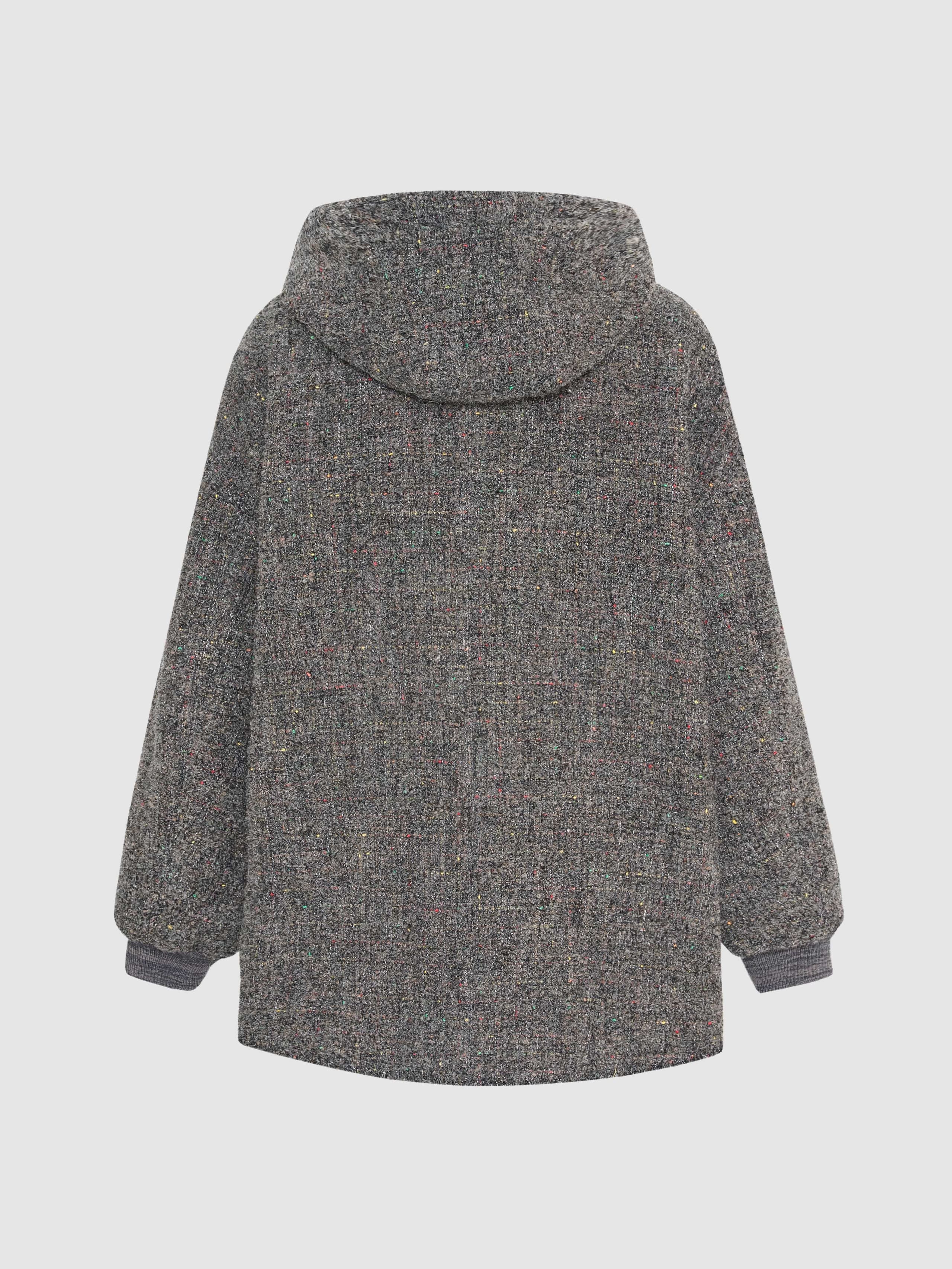 - Product Description-The Oversized Tweed Hooded Heather Jacket combines warmth and style with its unique blend of alpaca and wool in a textured boucle tweed. The relaxed, oversized fit features a hoodie silhouette, with colorful details that add a playful touch, reminiscent of a starry night. Designed with knit details at the collar and cuffs, this jacket also includes a detachable strap for versatile styling options, making it both functional and fashionable.