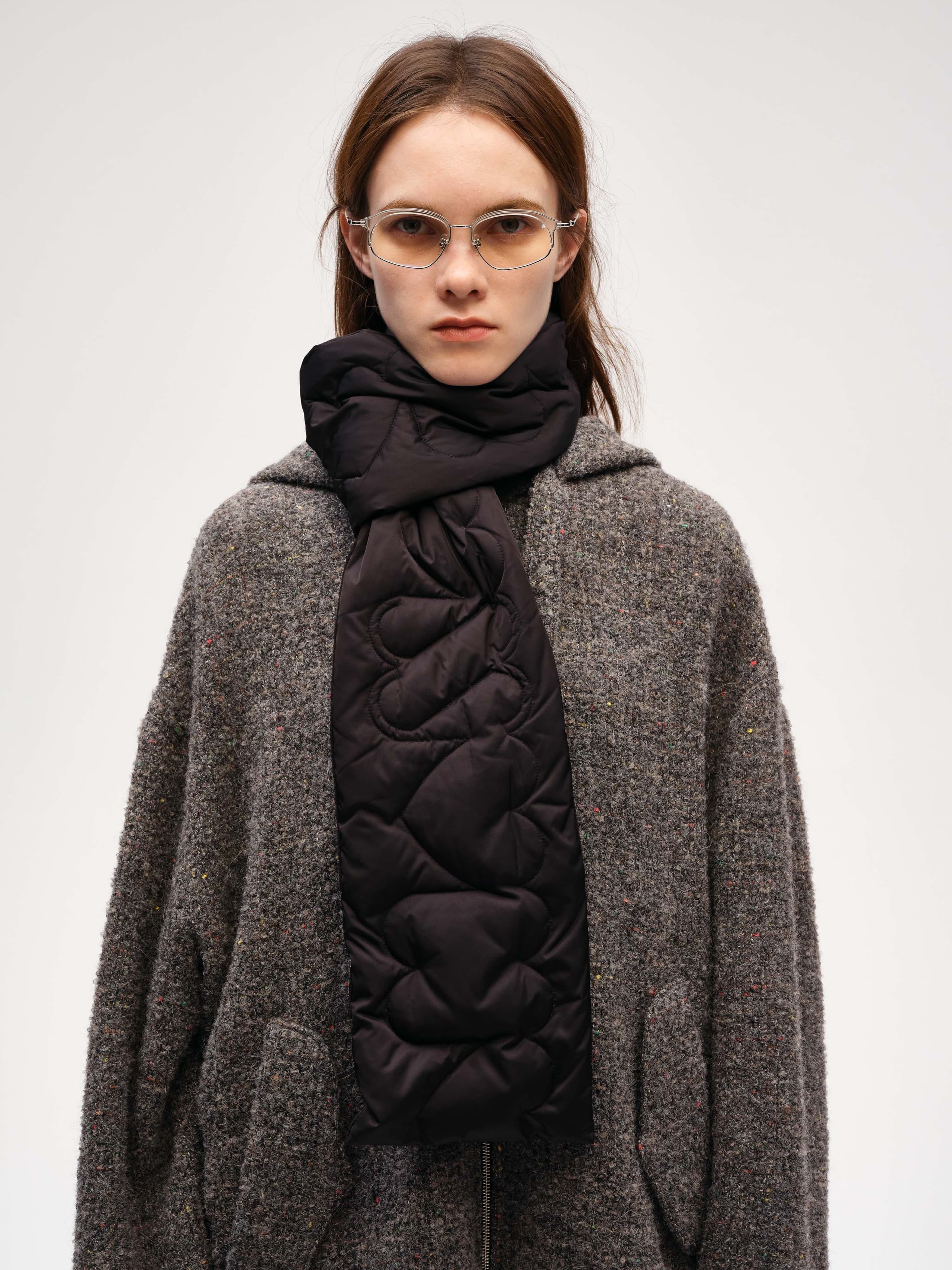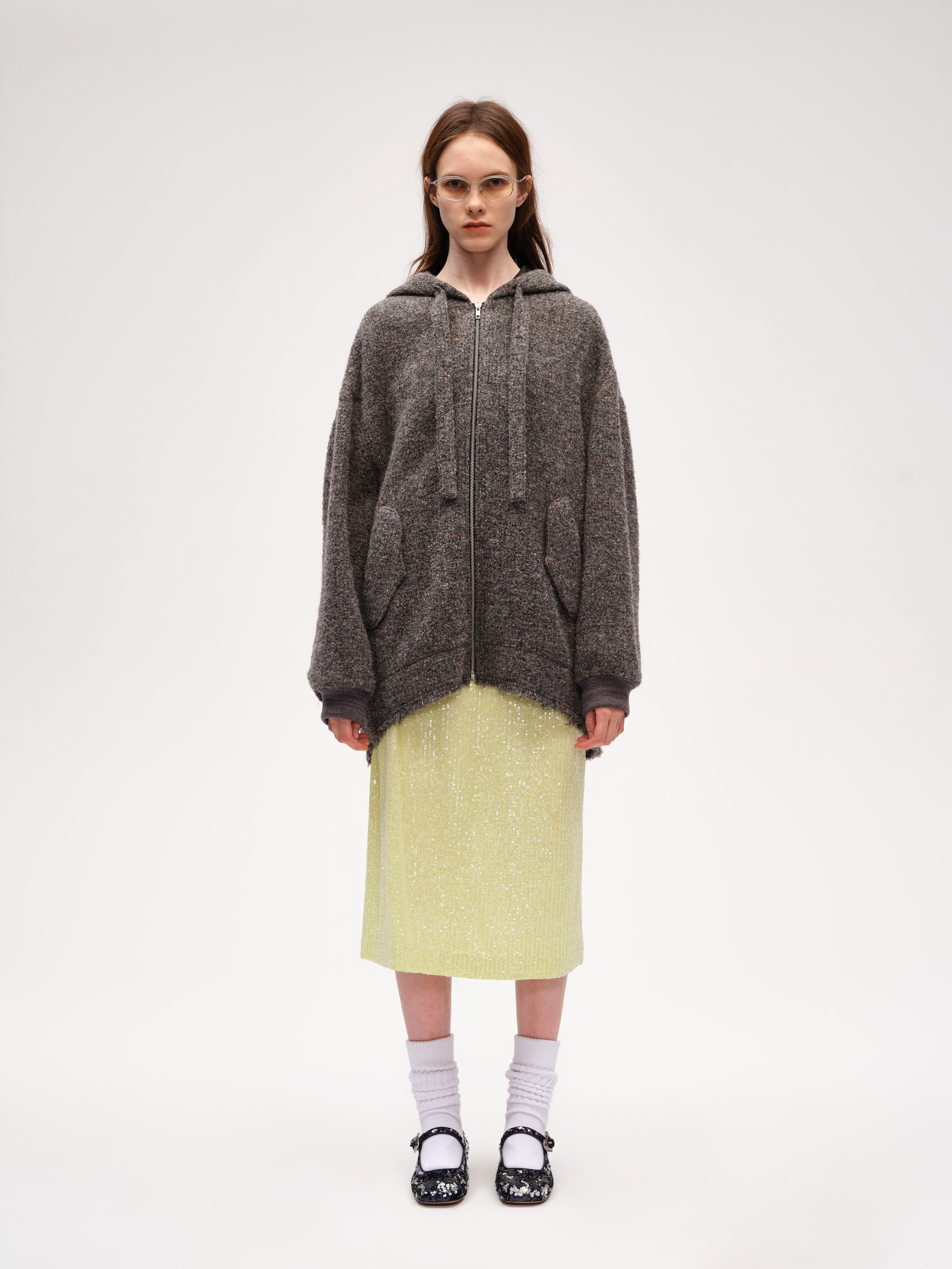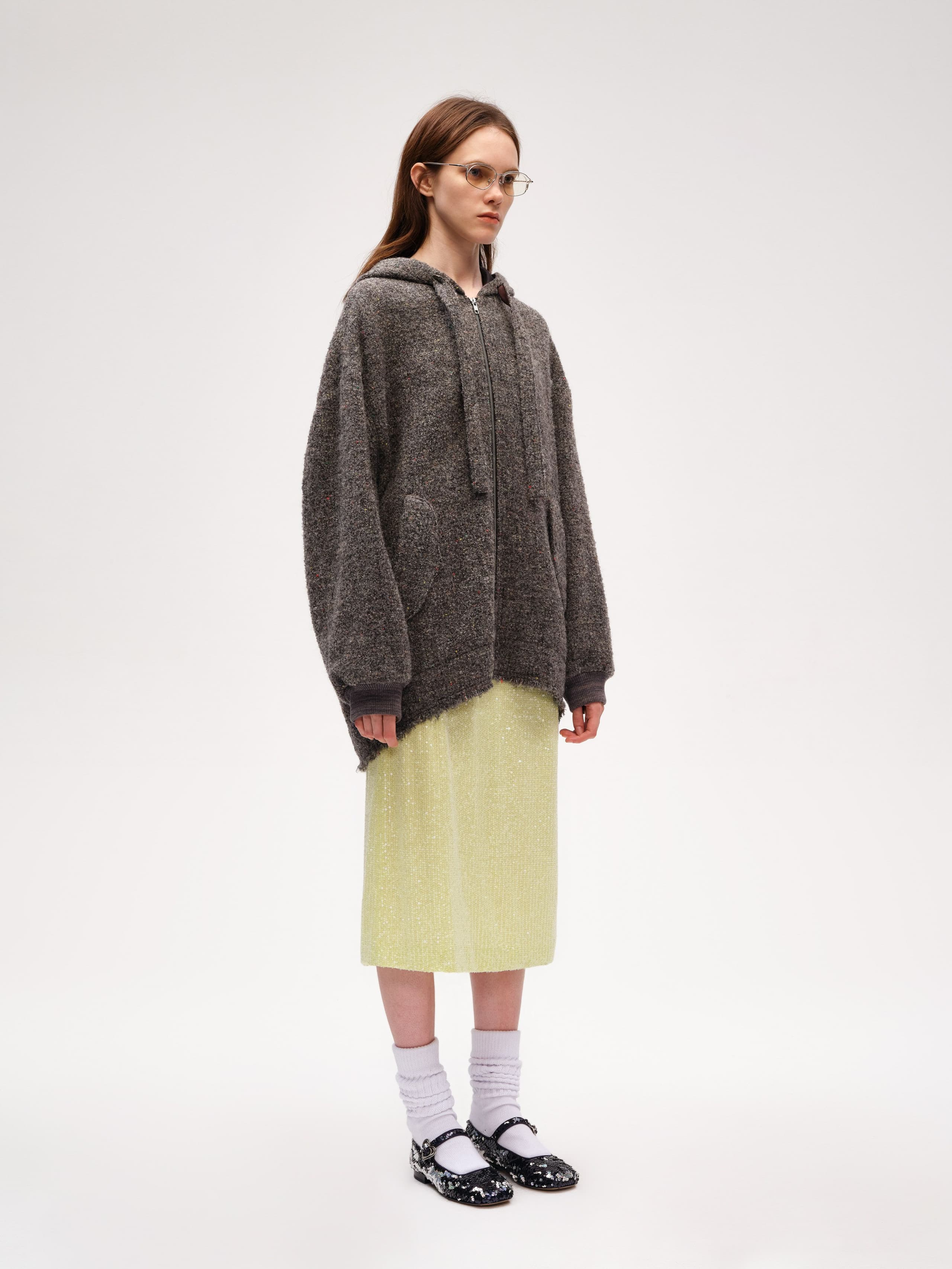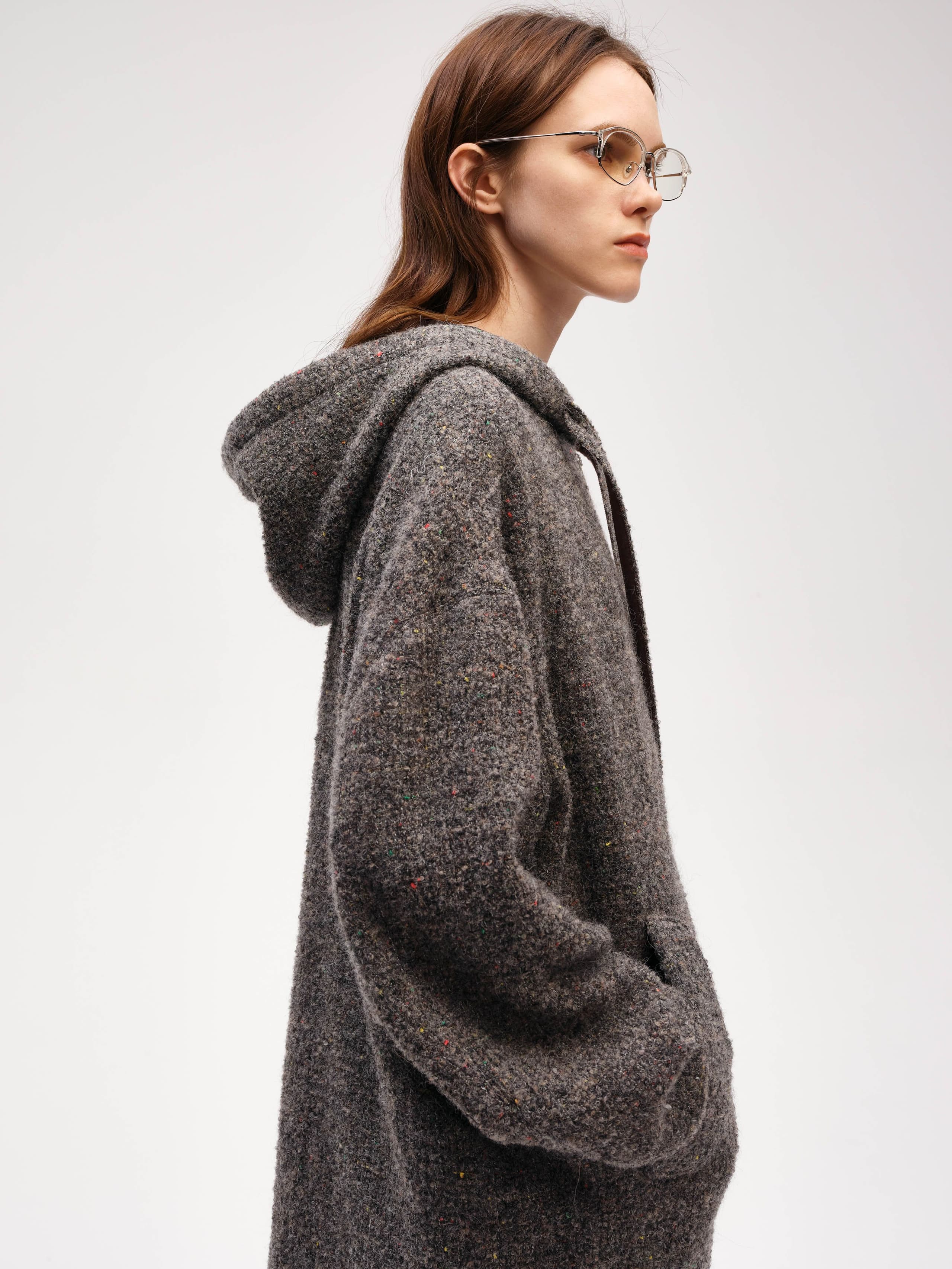 - Product Description-The Oversized Tweed Hooded Heather Jacket combines warmth and style with its unique blend of alpaca and wool in a textured boucle tweed. The relaxed, oversized fit features a hoodie silhouette, with colorful details that add a playful touch, reminiscent of a starry night. Designed with knit details at the collar and cuffs, this jacket also includes a detachable strap for versatile styling options, making it both functional and fashionable.