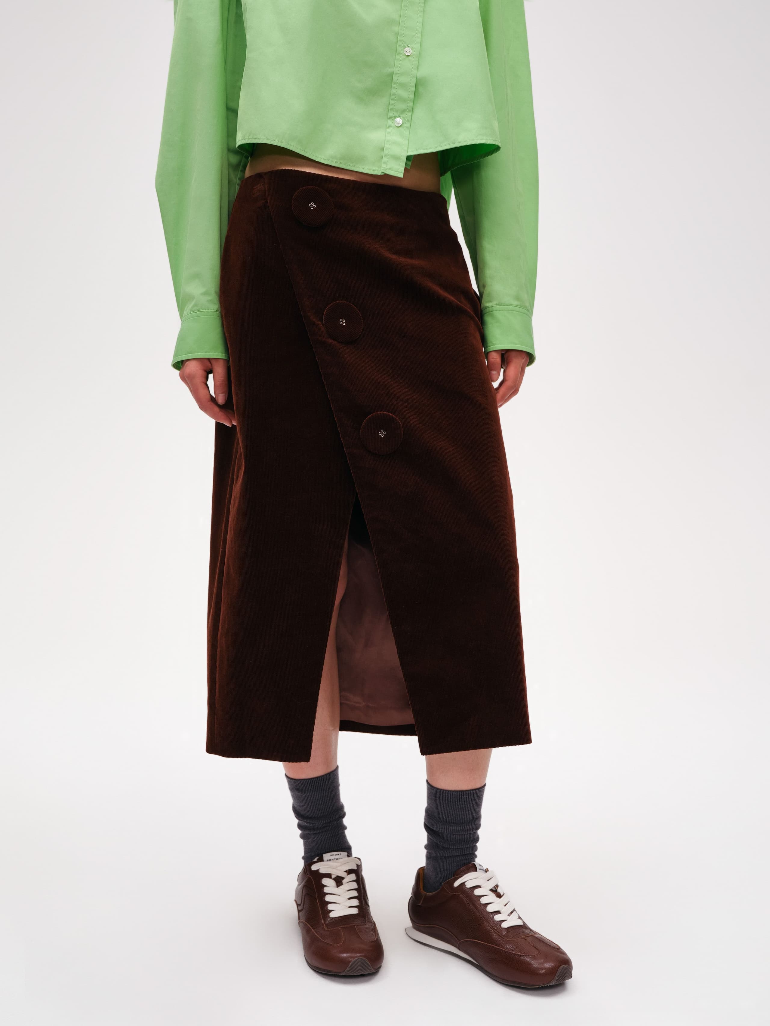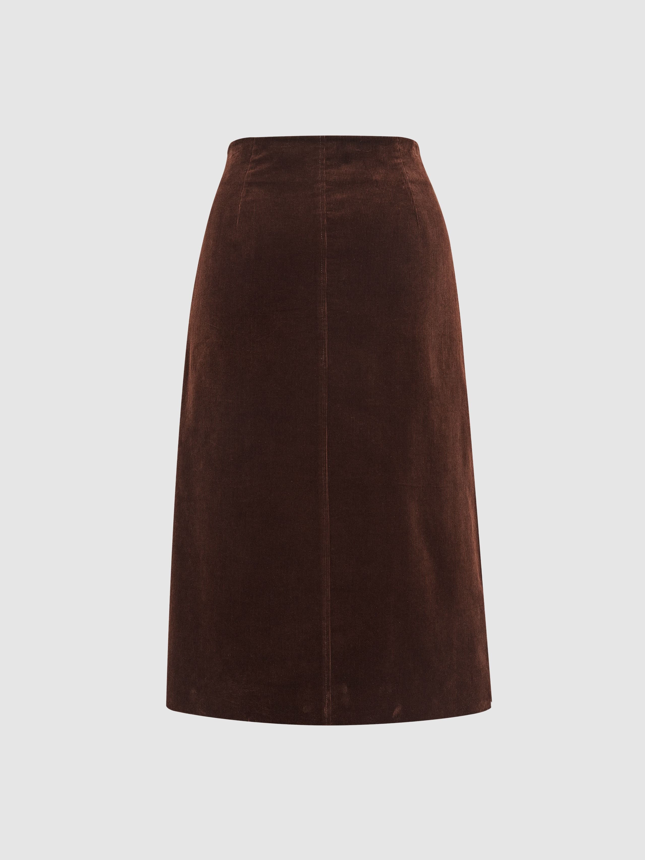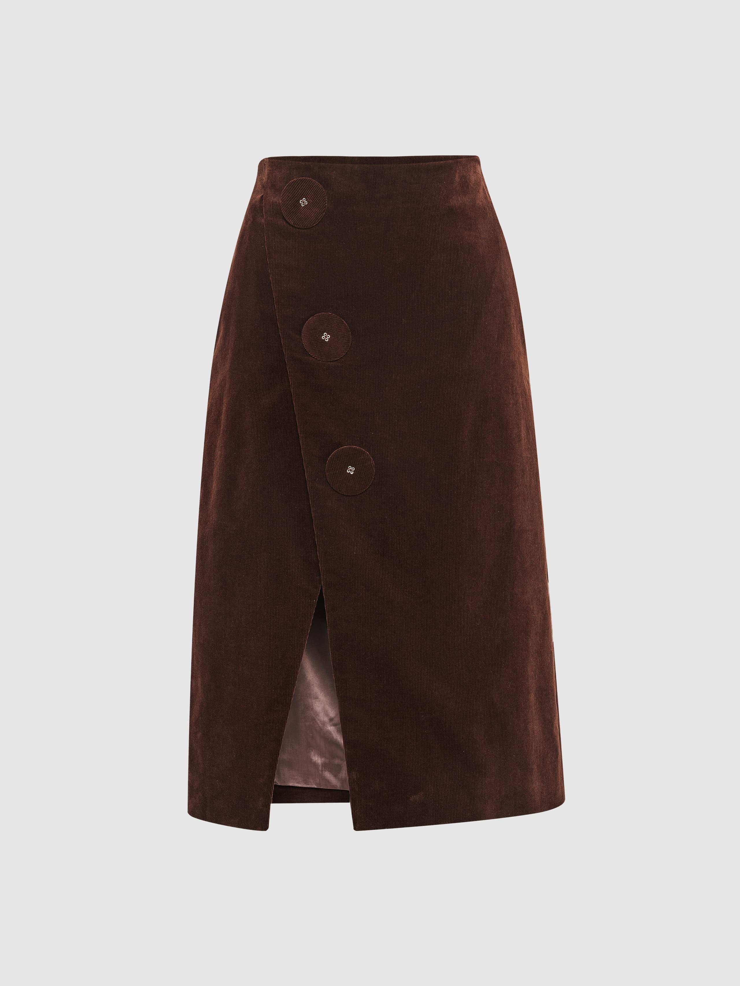 The Wrap-Style Corduroy Skirt with slits combines vintage charm with modern functionality. Made from soft cotton corduroy with a subtle sheen, this skirt features a wrap-style design with a flattering A-line silhouette. Details include a hidden side zipper, side pockets, and a fabric-covered oversized button for a touch of elegance. The front slit adds movement and ease, making it perfect for everyday wear with a hint of retro flair.