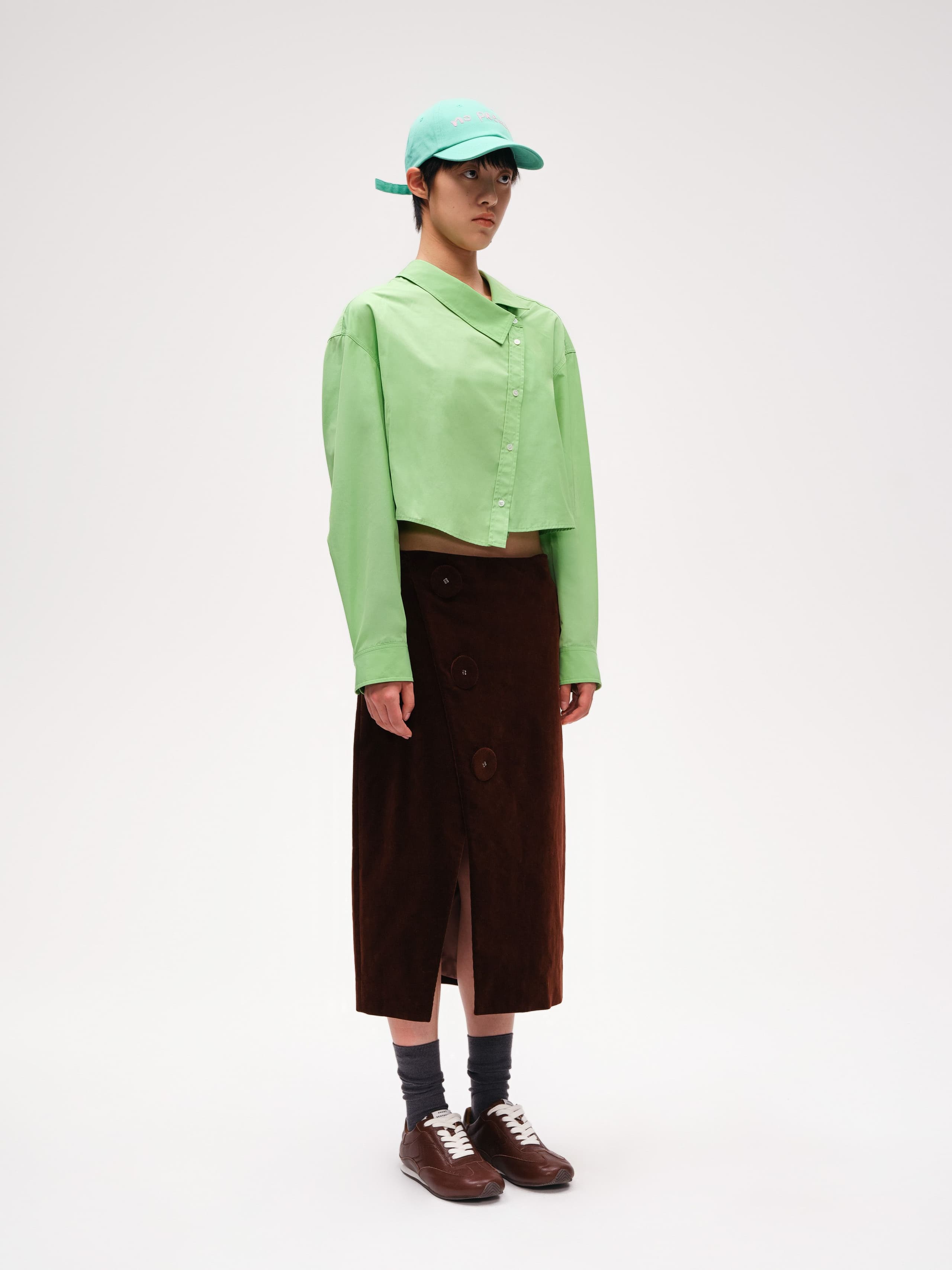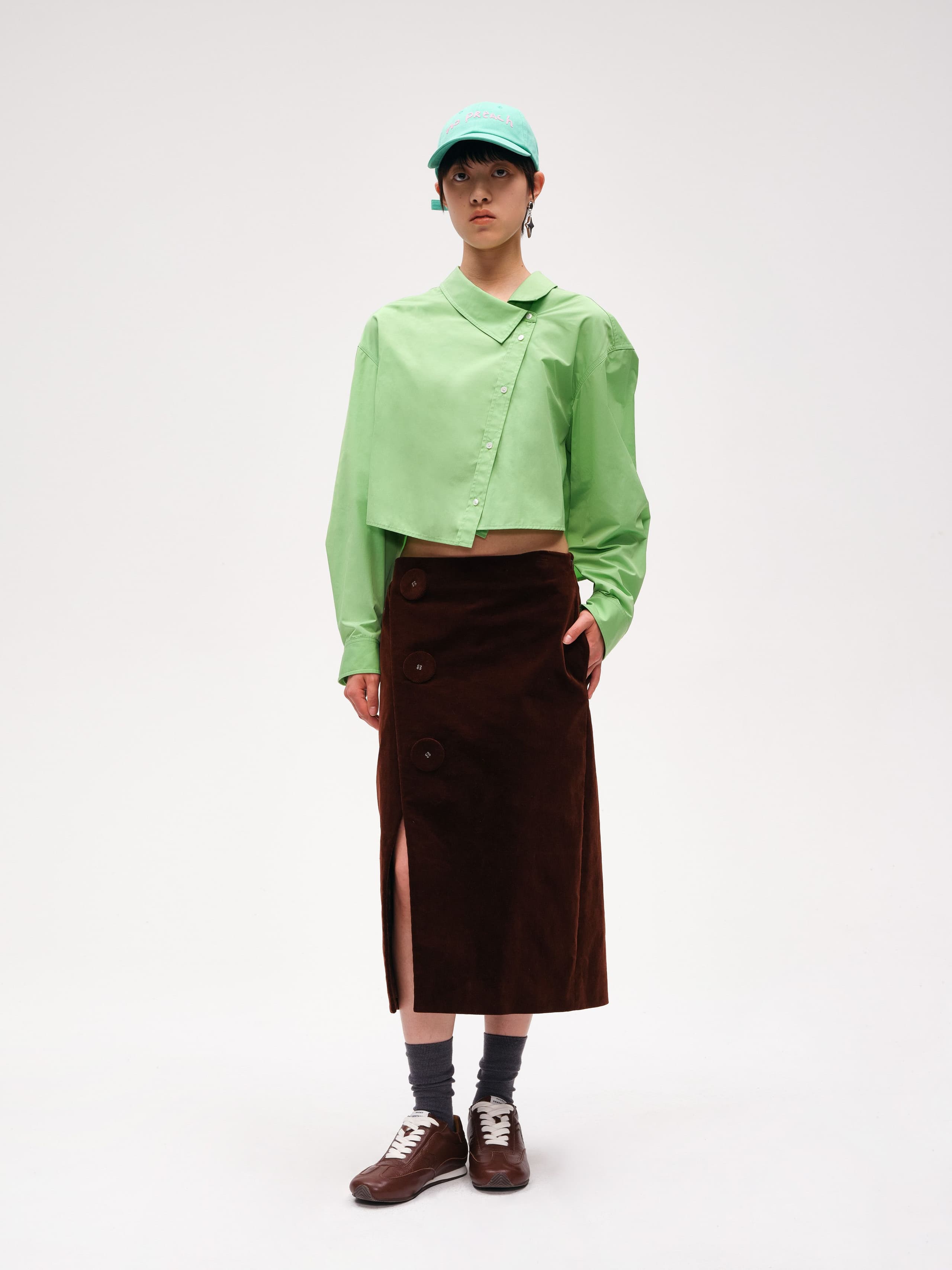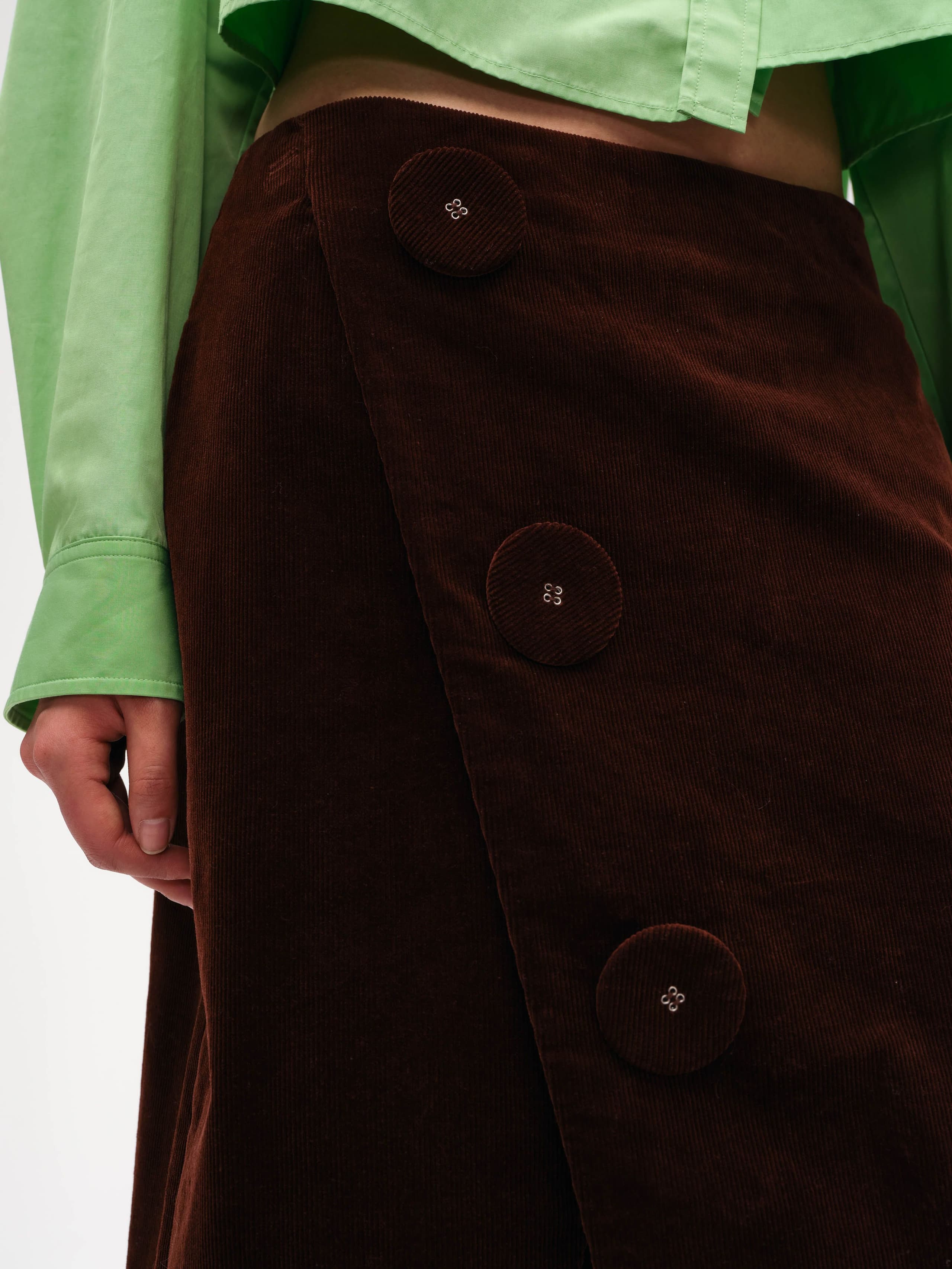 The Wrap-Style Corduroy Skirt with slits combines vintage charm with modern functionality. Made from soft cotton corduroy with a subtle sheen, this skirt features a wrap-style design with a flattering A-line silhouette. Details include a hidden side zipper, side pockets, and a fabric-covered oversized button for a touch of elegance. The front slit adds movement and ease, making it perfect for everyday wear with a hint of retro flair.